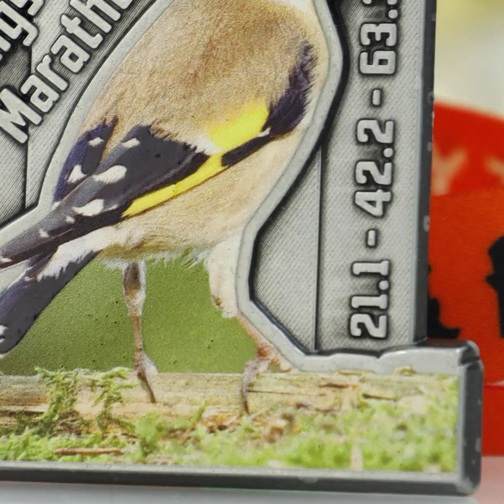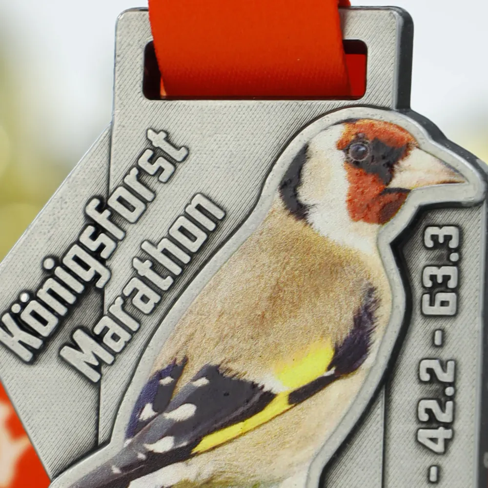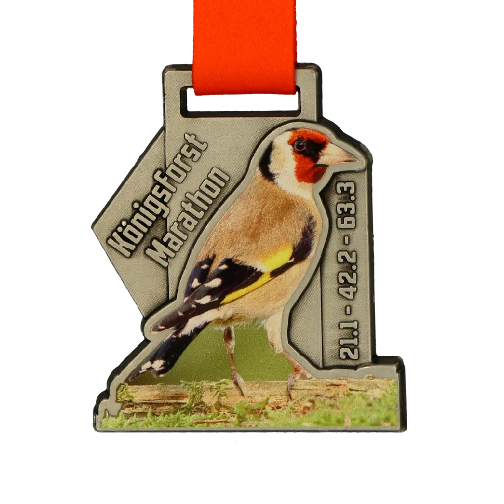 Personalised running medals for Königsforst Marathon 2025. Made of metal with vibrant UV printing depicting a goldfinch against a natural landscape. The event name is on the left, while the marathon dates are on the right. The bespoke medal stands out with its custom medal design, and the bright orange ribbon perfectly contrasts with the colourful design.