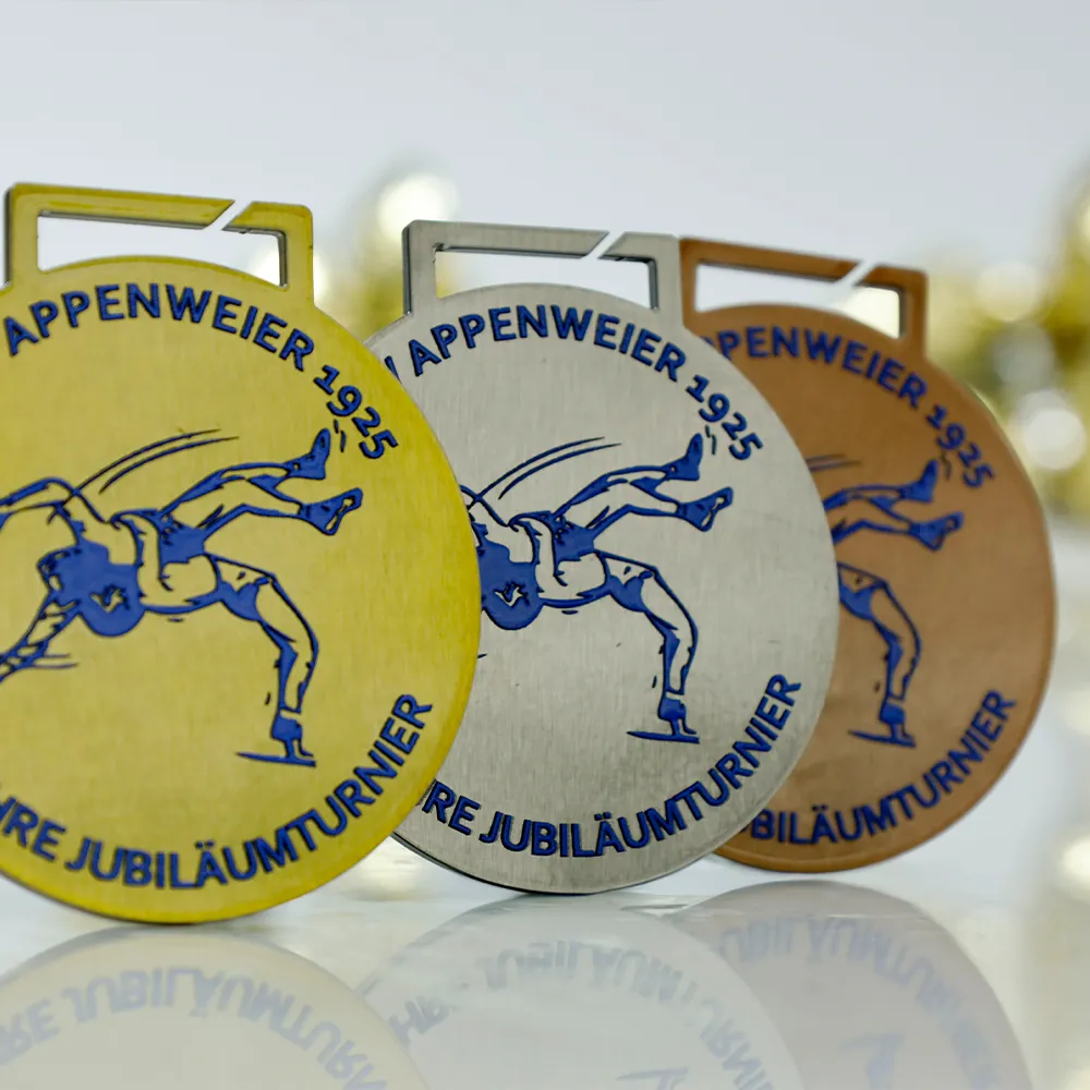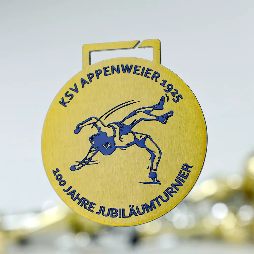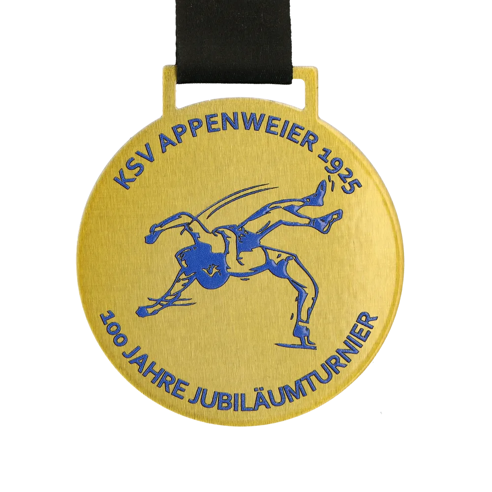 Personalised medal made of metal in gold with a central design of wrestlers in a match. Blue UV print includes the club name KSV Appenweier 1925 and details of the 100th anniversary tournament.