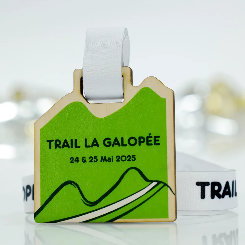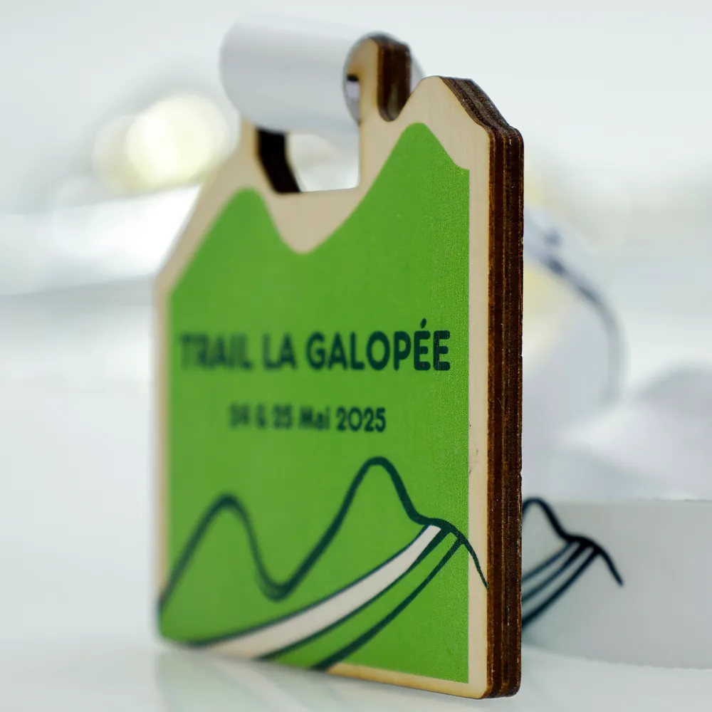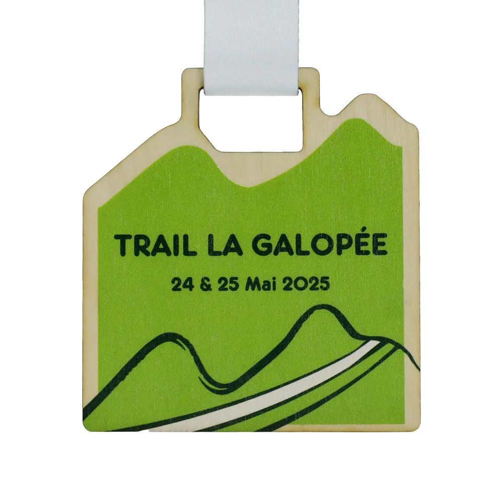 Wooden medal created for the Trail La Galopée 2025 event. Made of plywood, precisely laser-cut and decorated with colourful UV printing. The green mountain-themed design refers to the course of the trail and its natural character. The medal is hung on a white ribbon that matches the overall look. An ideal choice for organisers of trail and cross-country runs.