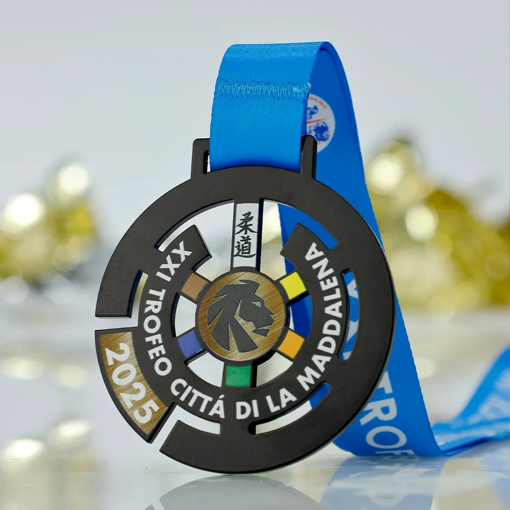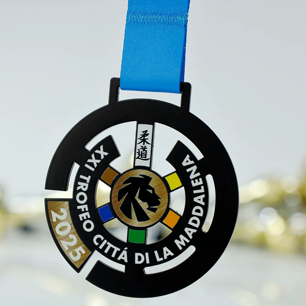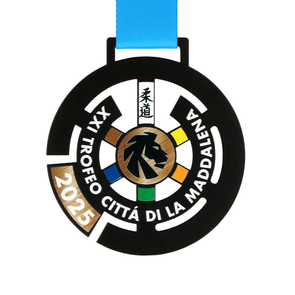 This martial arts medal was designed for the XXI Trofeo Città di La Maddalena 2025. It has a custom openwork shape, laser-cut. The entire piece is finished in black, providing a backdrop for the central logo and colour elements. The centre features a UV print of a lion’s head and Japanese characters, framed by coloured panels.