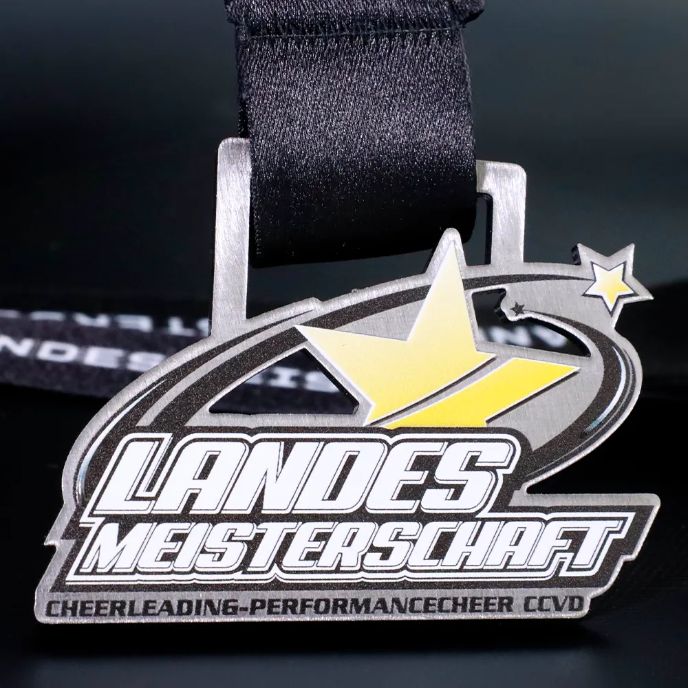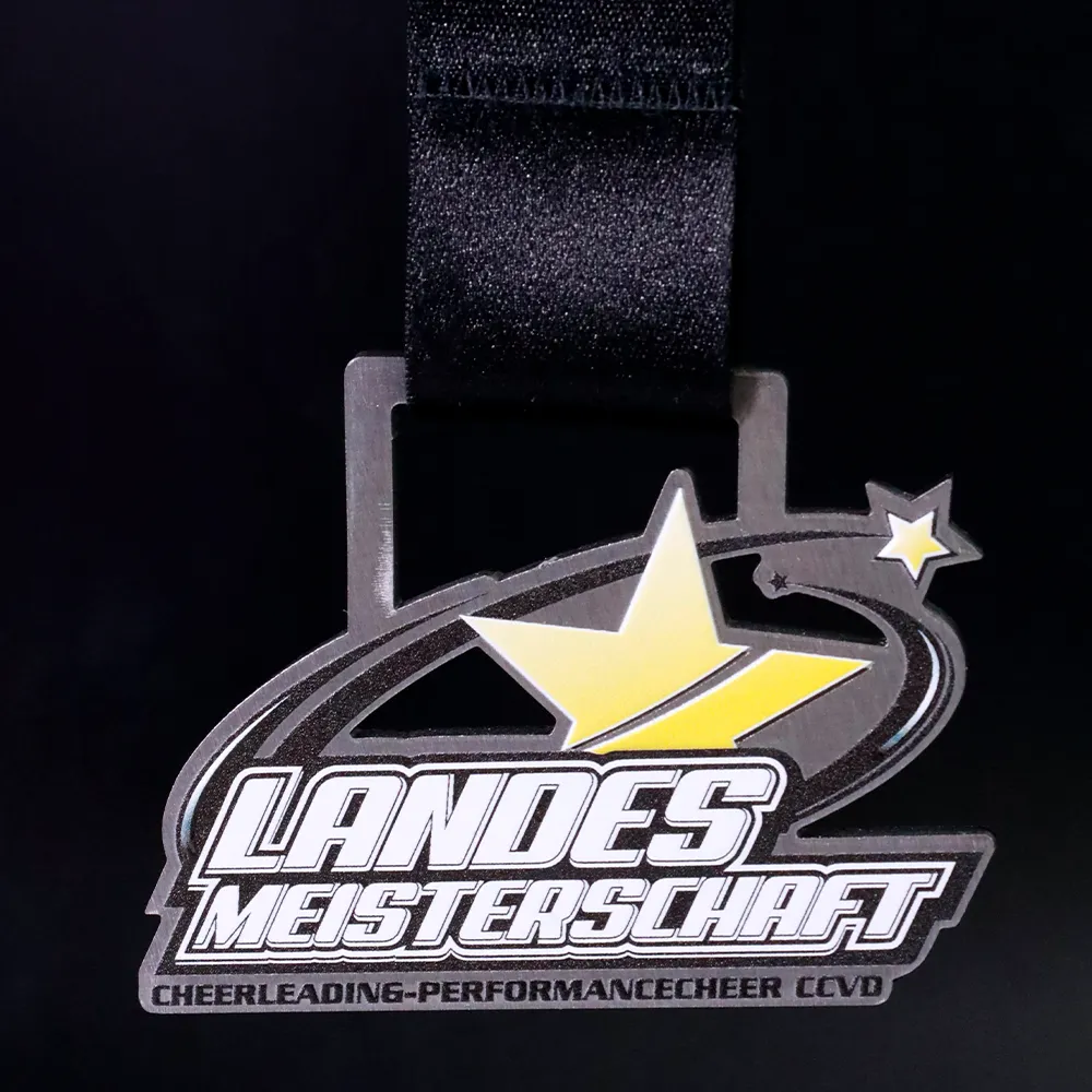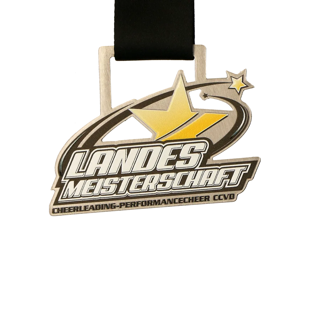 Custom cheerleading competition medal for the Landes Meisterschaft. The front of the medal features decorations and the event name in UV print.