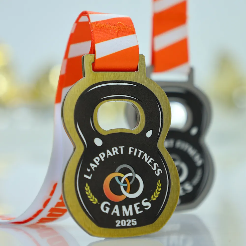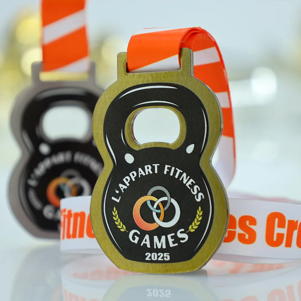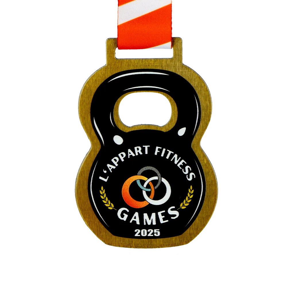Bespoke medals designed for the L'Appart Fitness Games 2025 event. It is a metal medal with a distinctive kettlebell shape crafted using laser cutting. The front features a vibrant graphic depicting a kettlebell, interlocking rings, the event’s name, and the year. All decorations and graphic elements are achieved through durable UV printing.