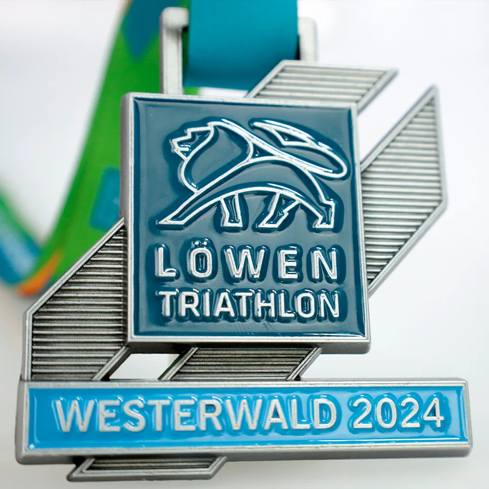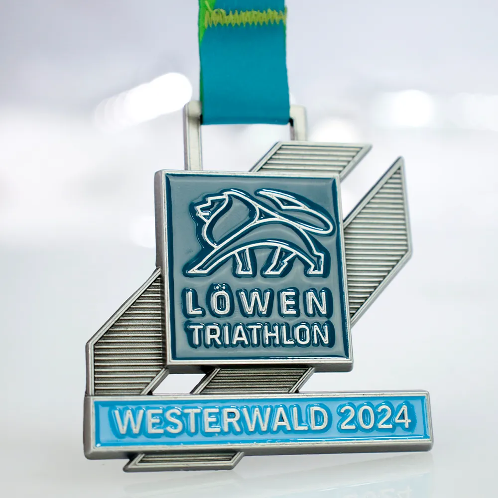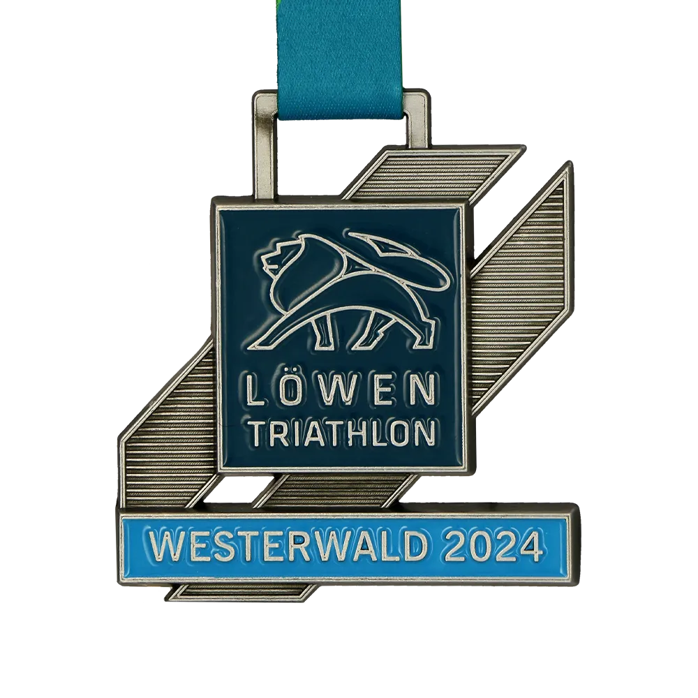 Triathlon Medal designed for the Löwentriathlon 2024 event. The medal was cast from a mold, allowing us to achieve a unique shape and precise details. It features the silhouette of a lion, aligning with the theme of the event. The colorful elements were filled with paint, giving the medal a distinctive look.