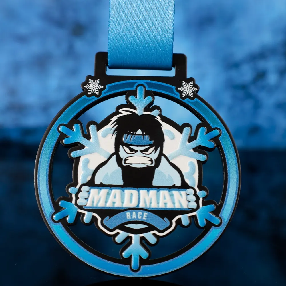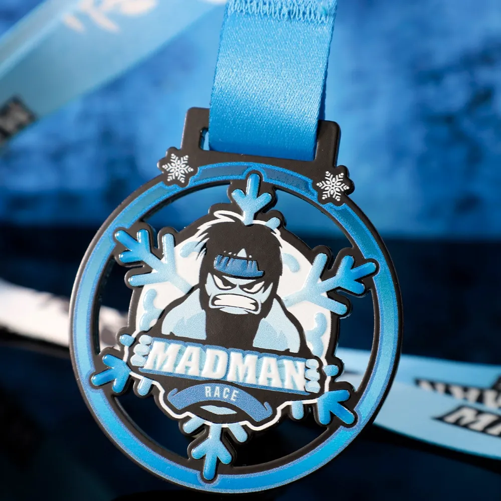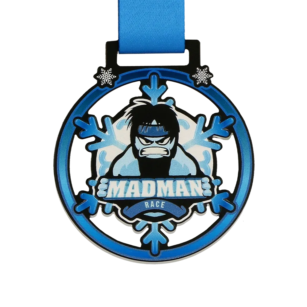 A unique sports medal for participants of the Madman Race features a dynamic design with the image of a determined figure against a backdrop of snowflakes, symbolising the challenges of the race's winter conditions.