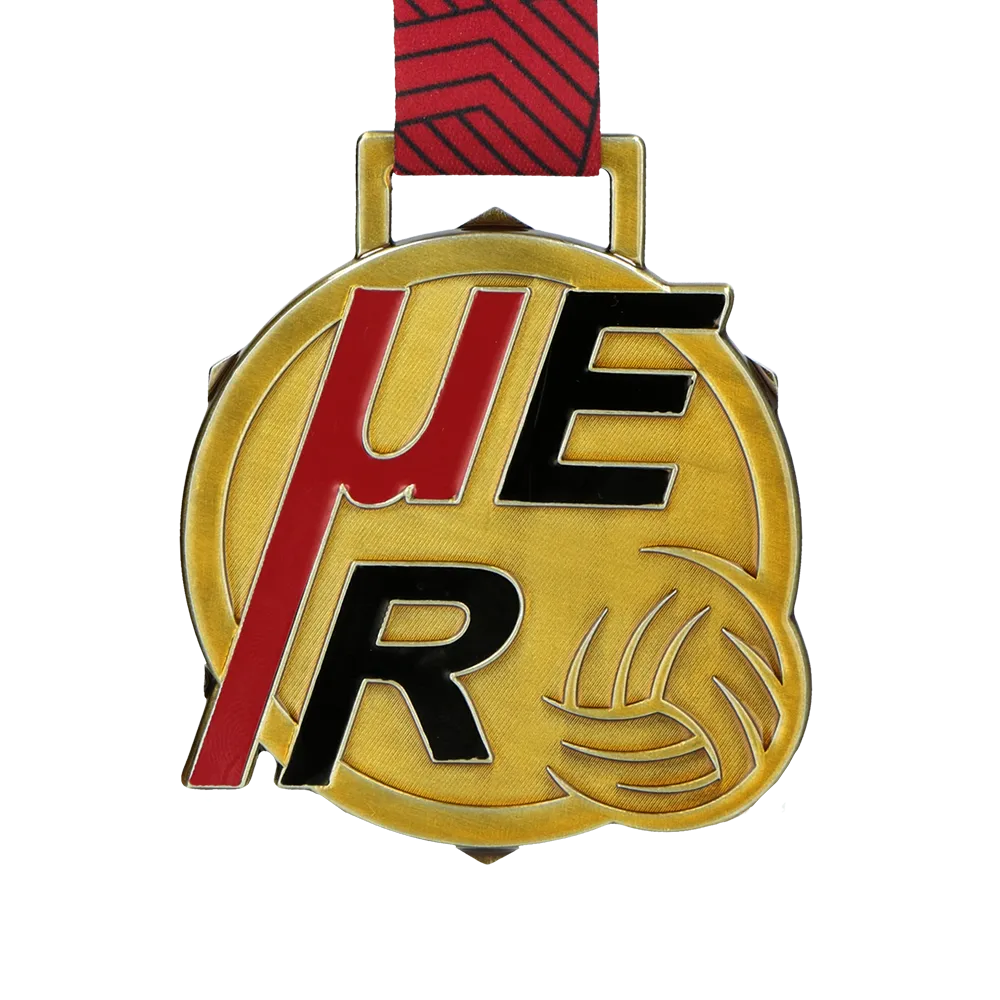 Tournament commemorative medal MAFC 2025, die-cast in zinc alloy with an antiqued gold finish. The dominant feature is the large lettering UER — in red and black — filled with coloured enamel and extending beyond the circular outline. A volleyball sits in the lower right corner. Red ribbon with a black herringbone pattern.