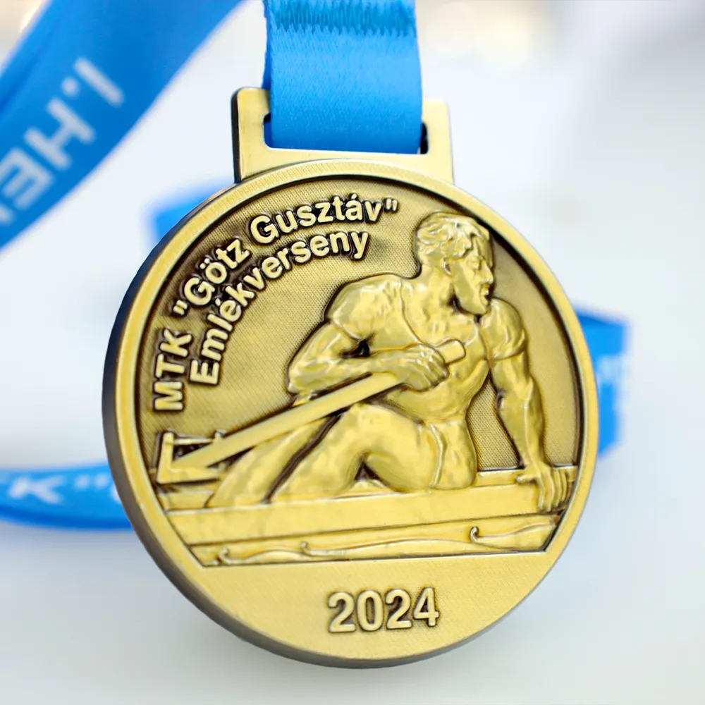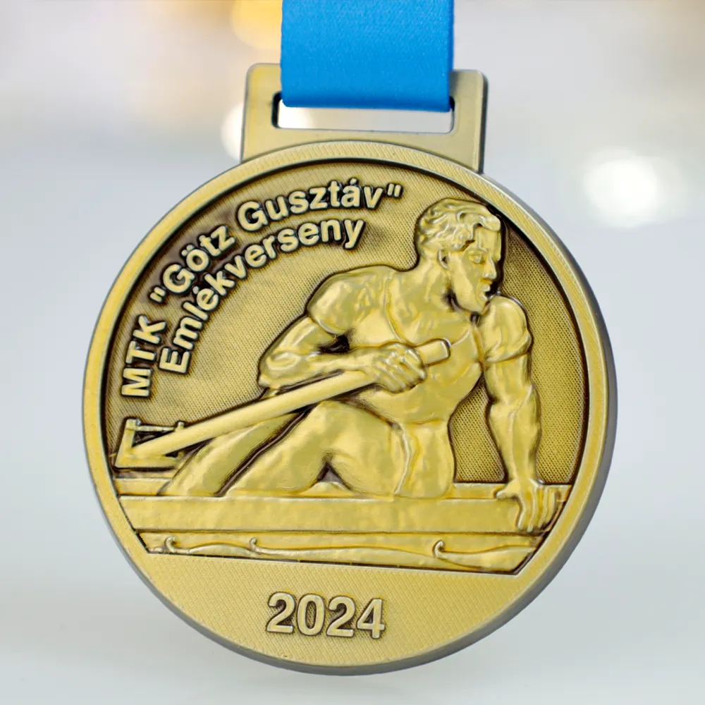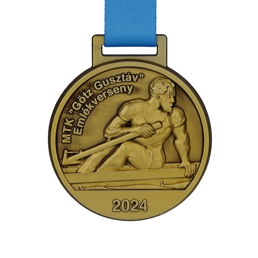 A gold medal designed for the commemorative rowing event 'MTK Götz Gusztáv Emlékverseny 2024'. The front displays an image of a rower in a dynamic pose, capturing the sporting spirit of the event. Made of metal with a gold finish, it includes subtle details and an inscription featuring the event name and year. Perfect for prestigious sporting occasions.