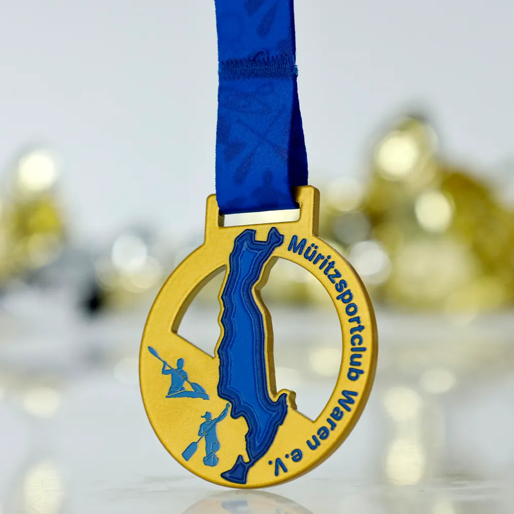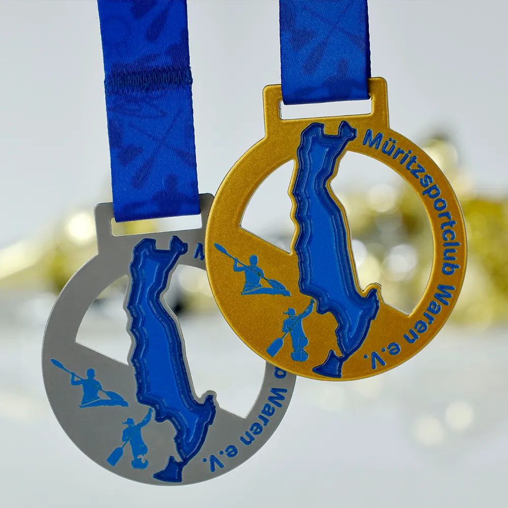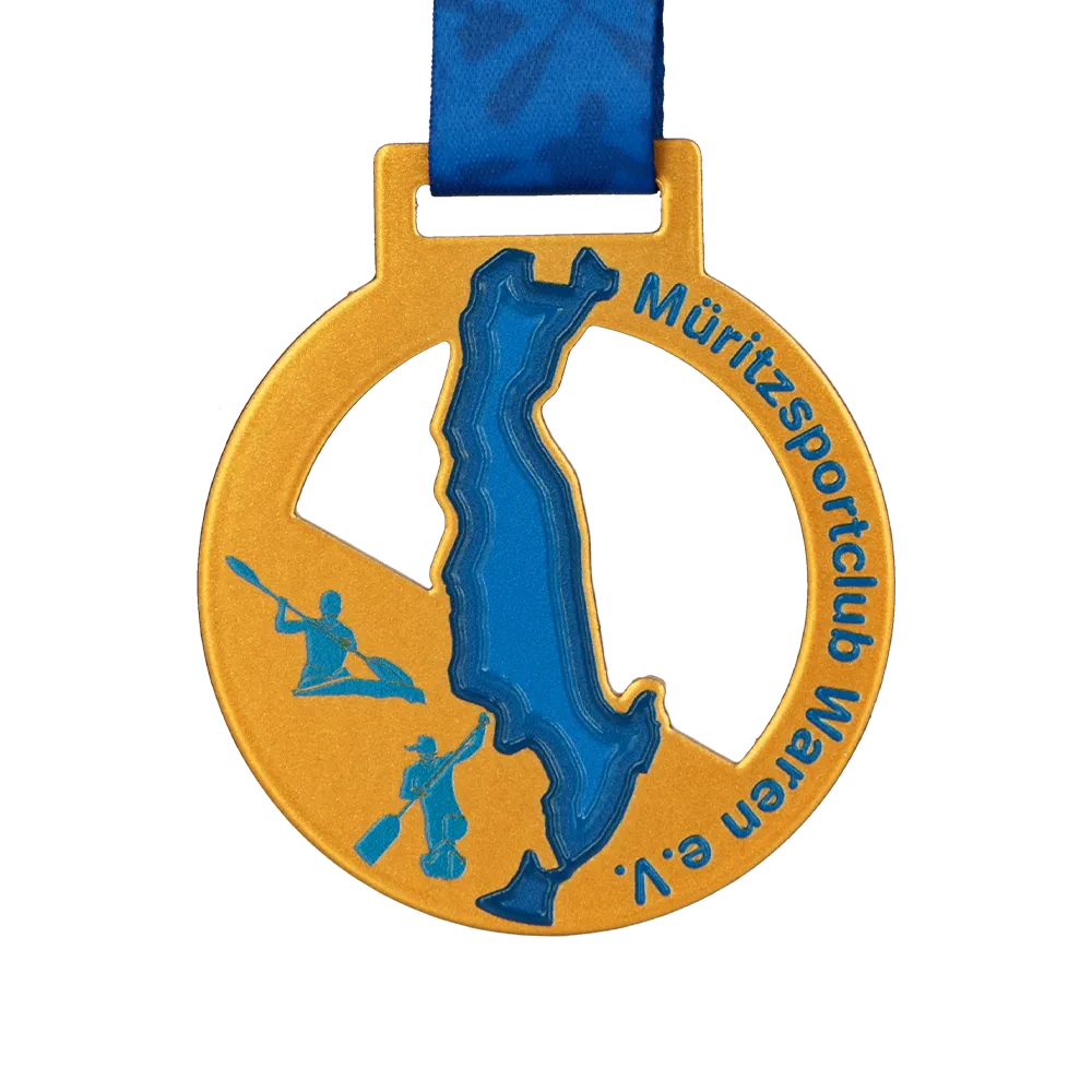 Personalised medal circular with a central design of a blue lake map. Features athletes in kayaks and the sports club name. Steel medal with UV printing and coloured details. Personalisation includes the event name and sports graphics.