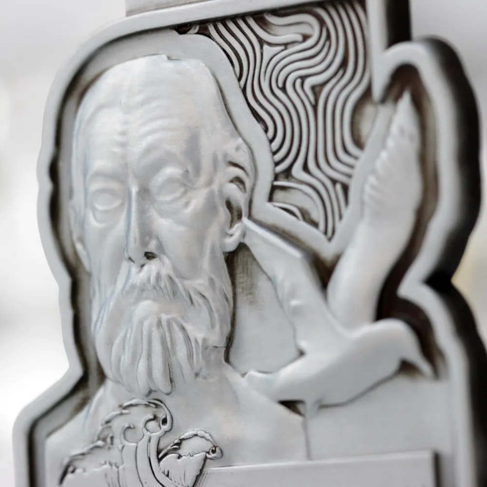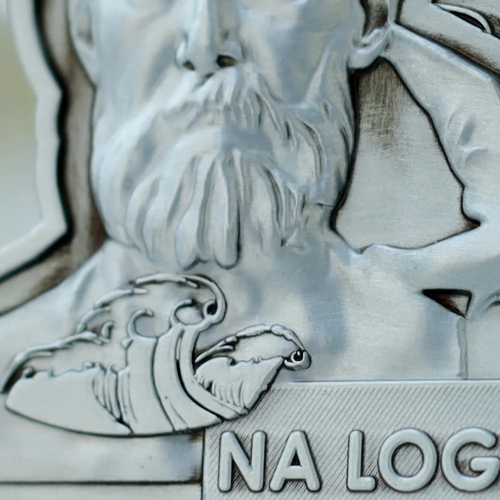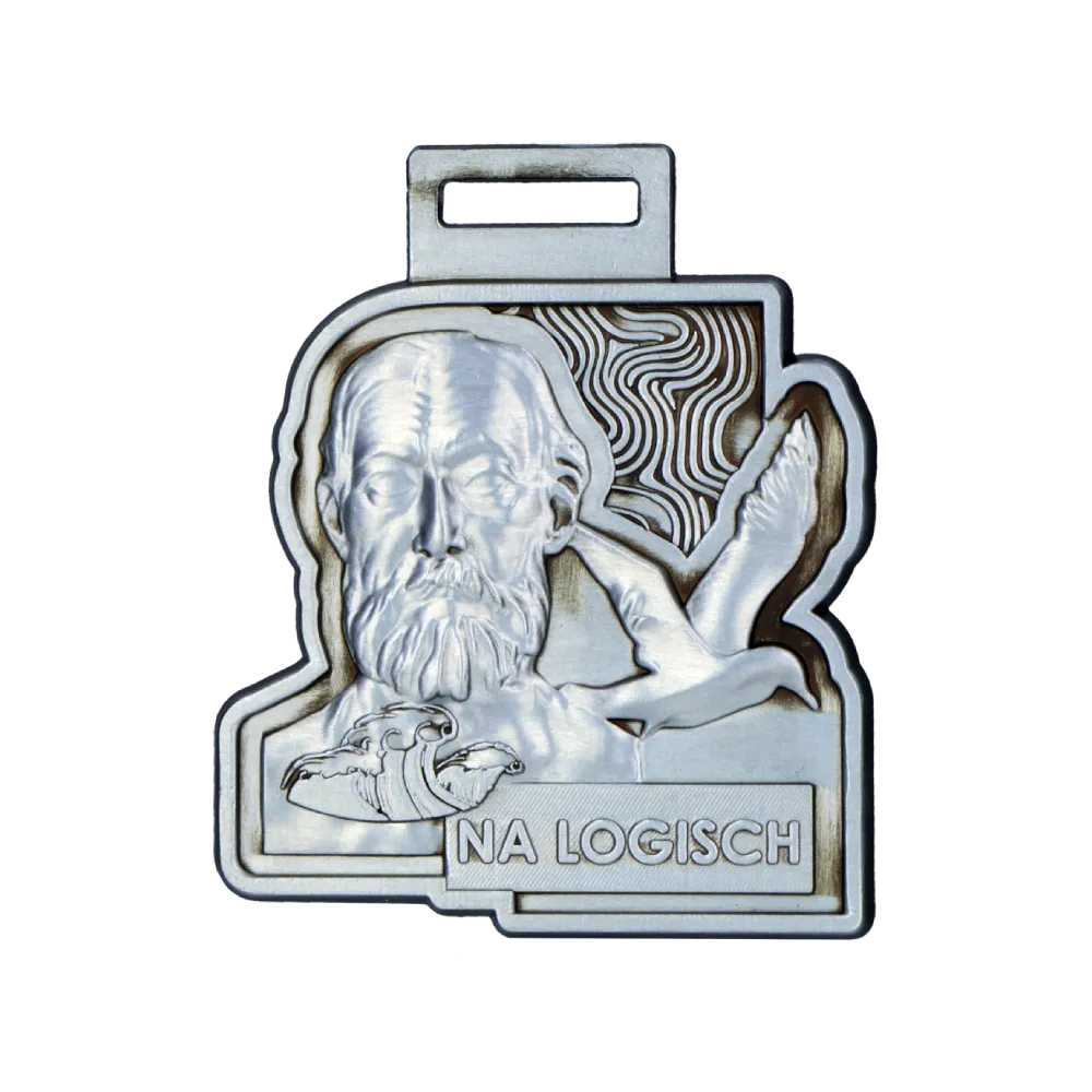 We designed a custom medal for Na Logisch. Made as a 3D metal casting with a silver finish, it has a relief graphic with the portrait of a bearded man, a seagull and flowing wave patterns, in an irregular shape with a loop. We can tailor this design to the name and style of your event.