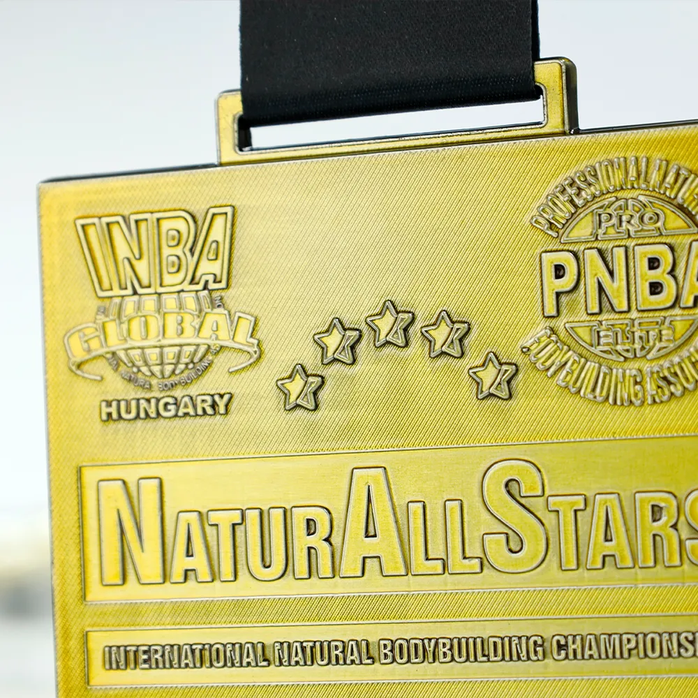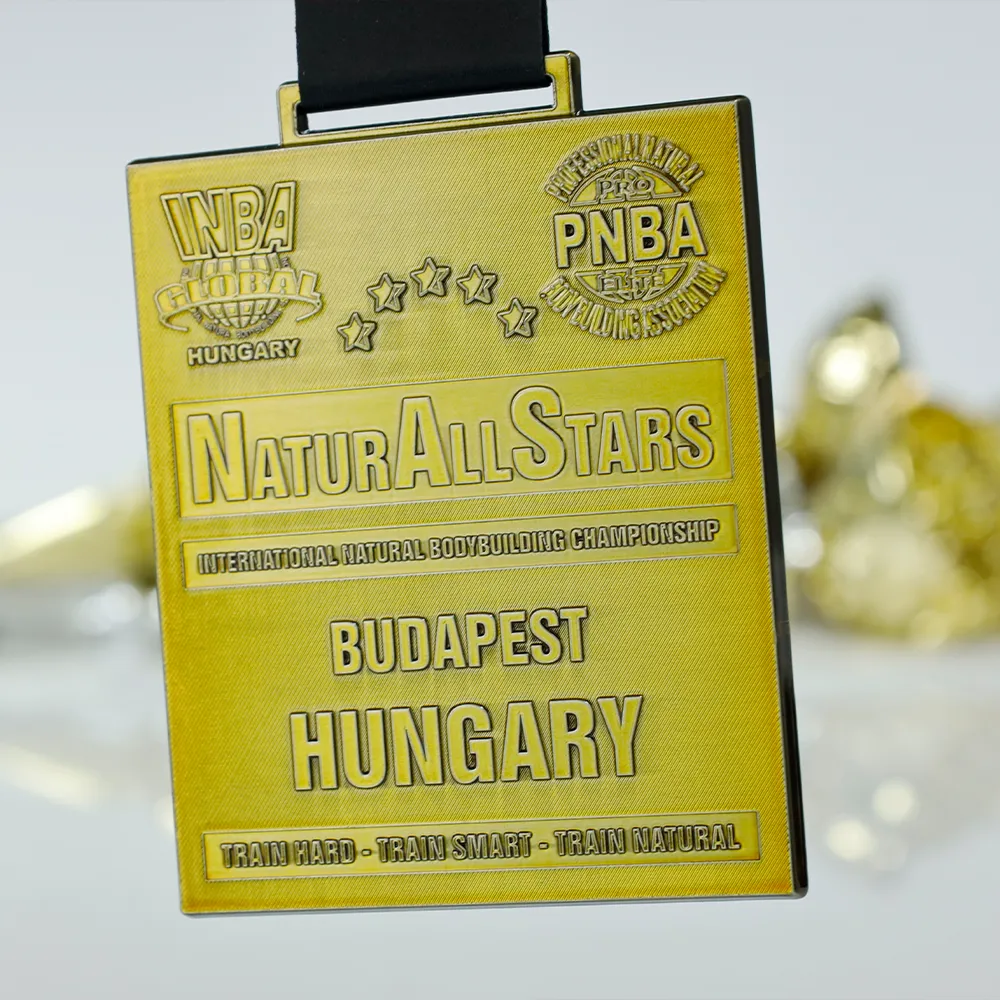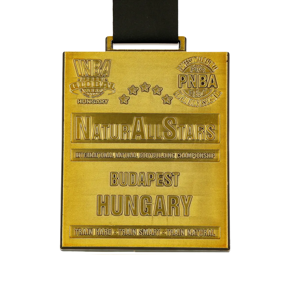 This cast medal was produced for the Natural Allstars International Natural Bodybuilding Championship in Budapest, Hungary. It has a rectangular format and a Matte Gold finish. Made for a bodybuilding competition, you can find more similar designs in our strength sports medals category.