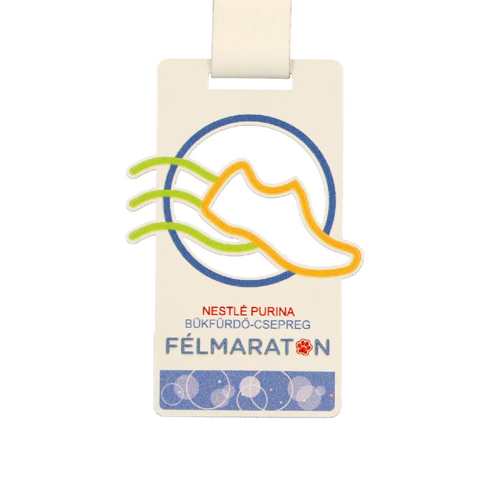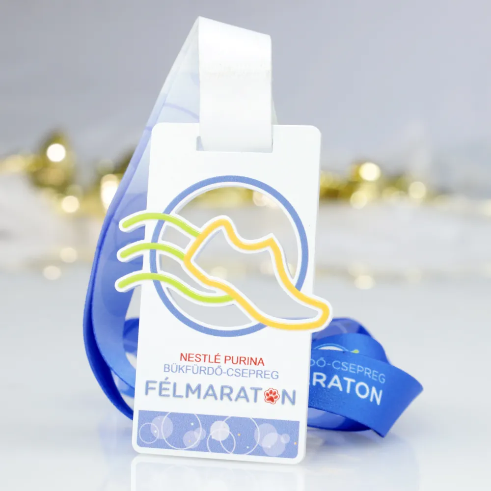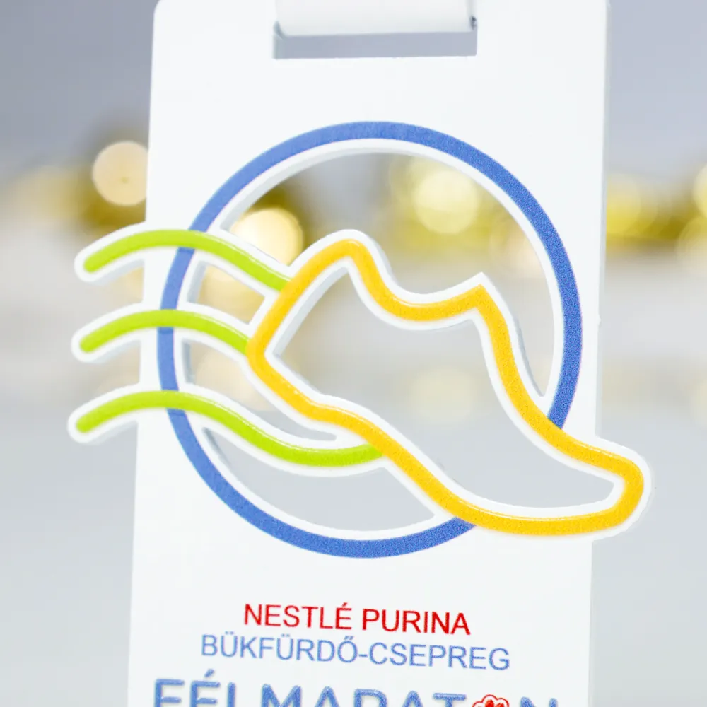 A rectangular running medal created for the 'Nestlé Purina Félmaraton Bükfürdő-Csepreg' event. The front features a colourful graphic of a running shoe silhouette against a circular background, along with the sponsors' logos. The light background and minimalist design emphasise the modern feel of the award, making it ideal for half-marathons and events promoting physical activity.