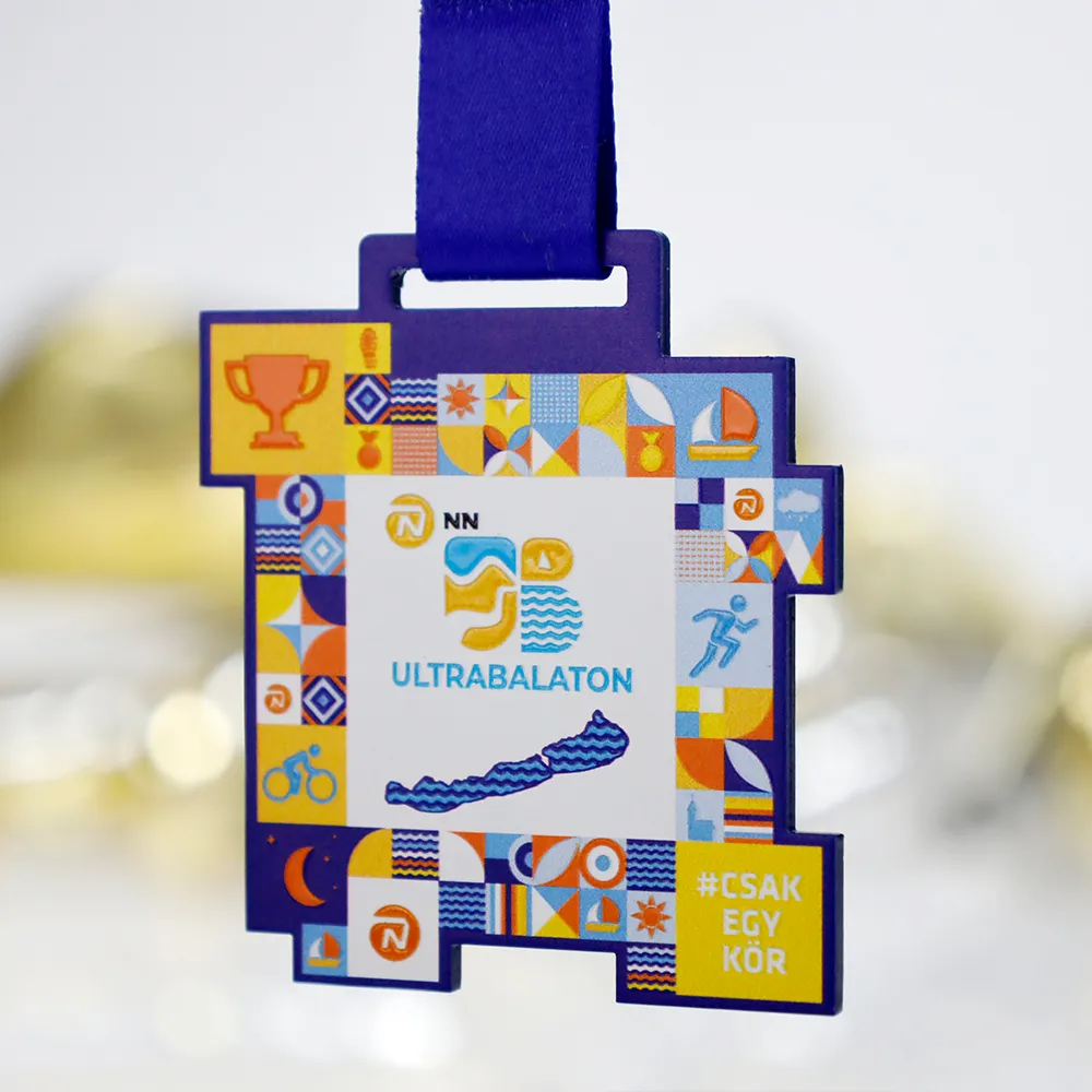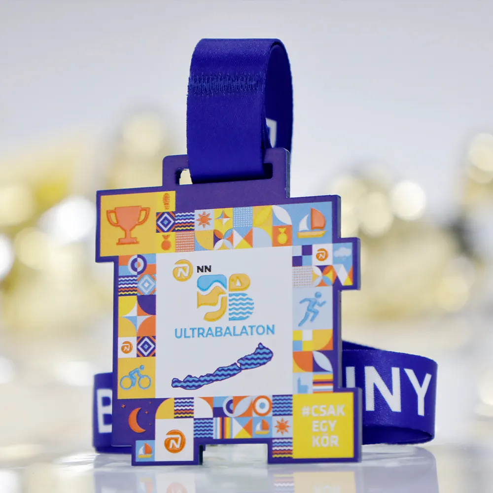 Personalised medal created for the NN Ultrabalaton event. It is a metal medal. The front features the event logo, an outline of Lake Balaton, and numerous colourful symbols related to sports and the region, all applied using UV printing.
