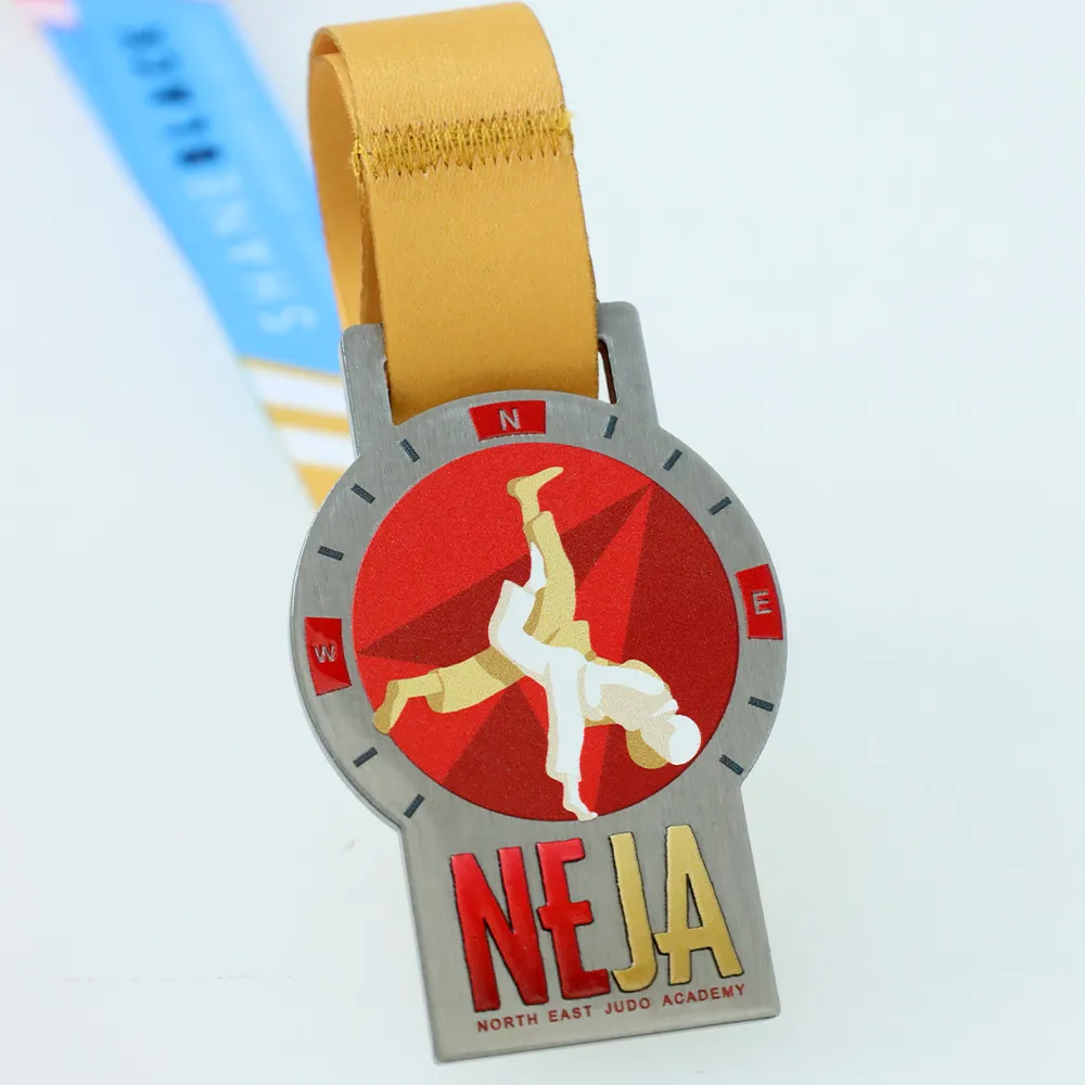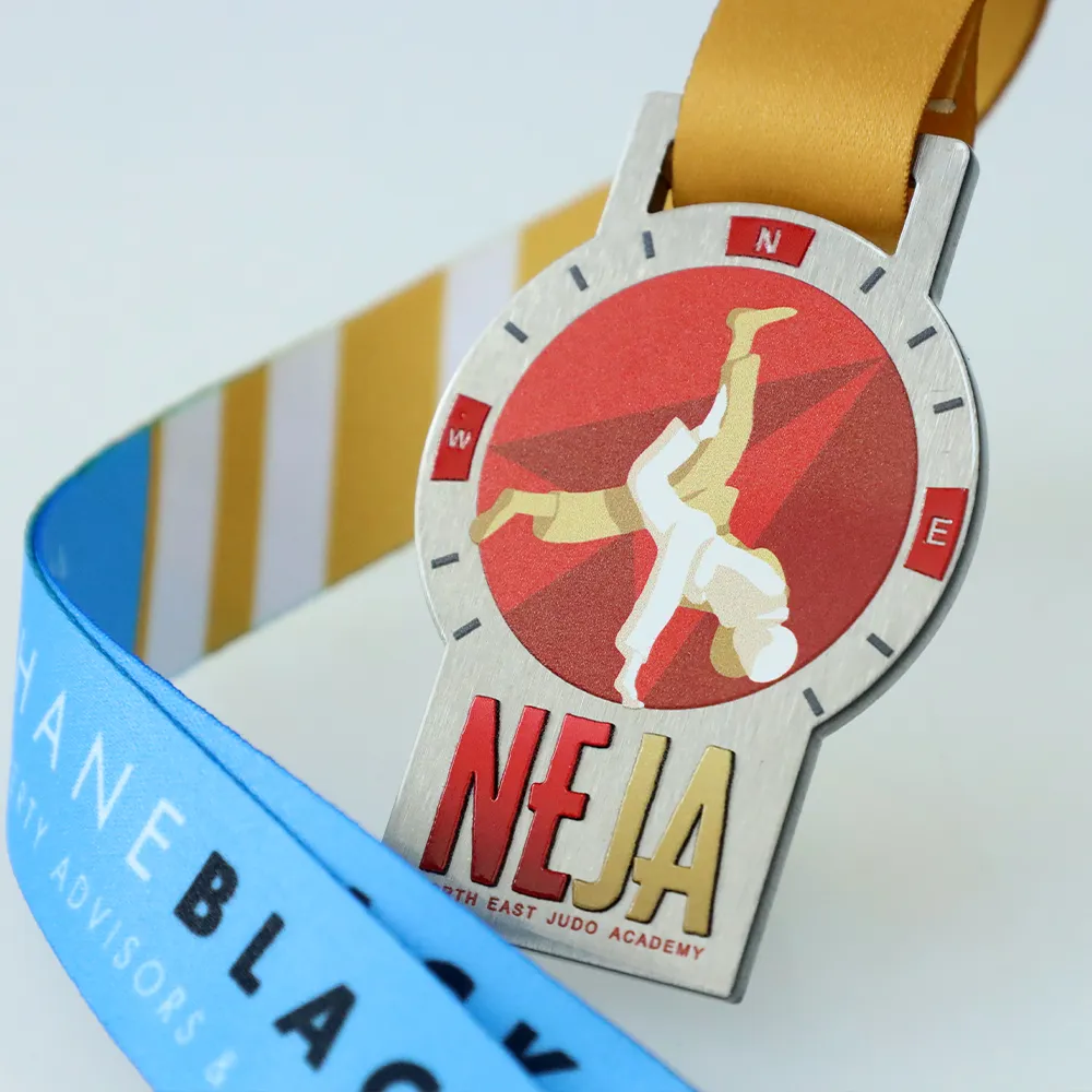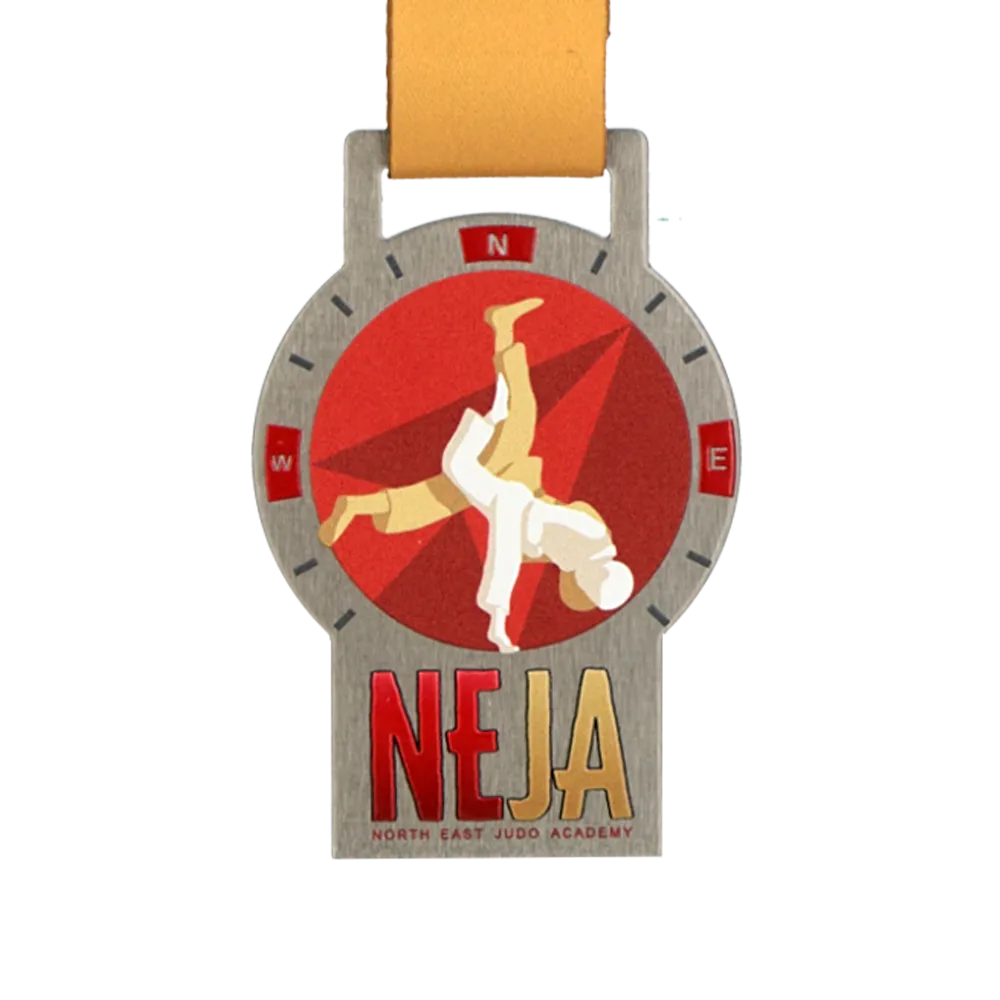Bespoke medal produced for the North East Judo Academy competition, crafted from steel. The shape combines a round disc with a rectangular base. The disc features two judoka mid-throw — a white and gold silhouette on a red background with a geometric pattern. The frame around the disc references a compass with N, W, E markings. The base displays the large lettering NEJA alongside the academy's full name. Gold ribbon.