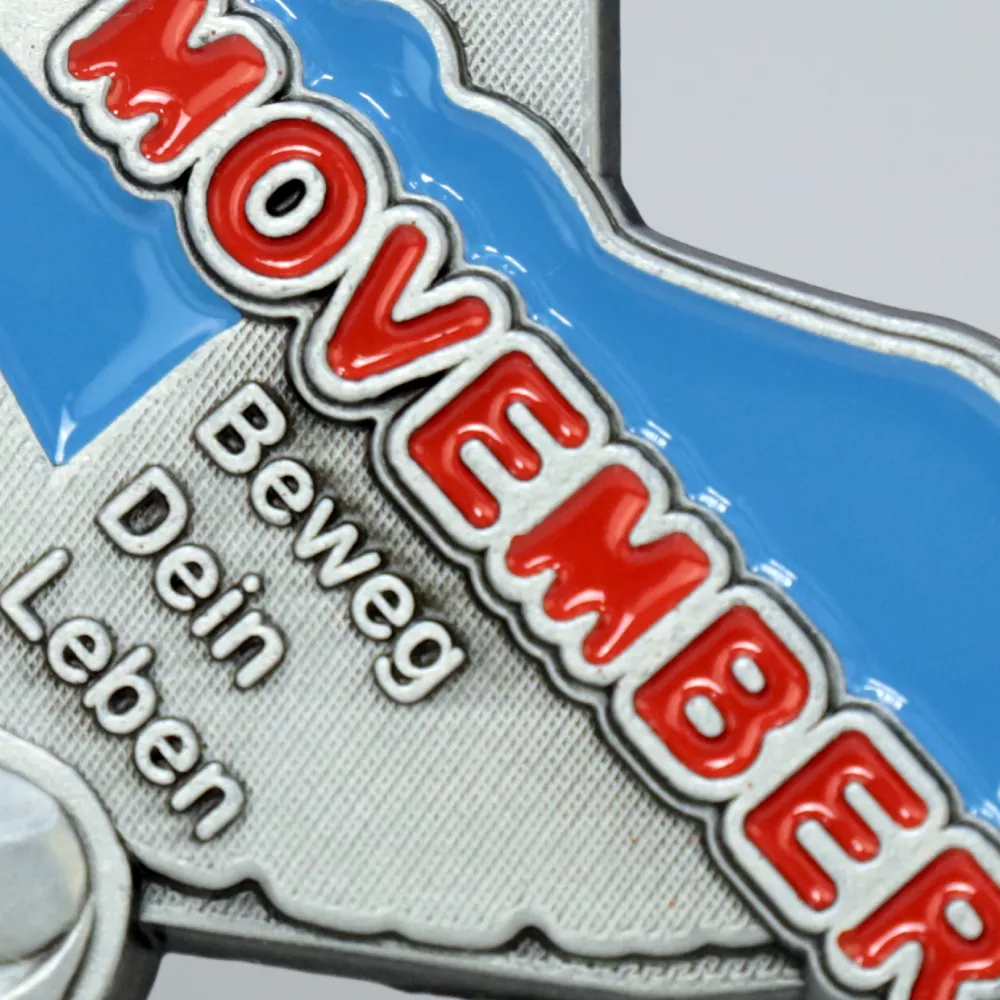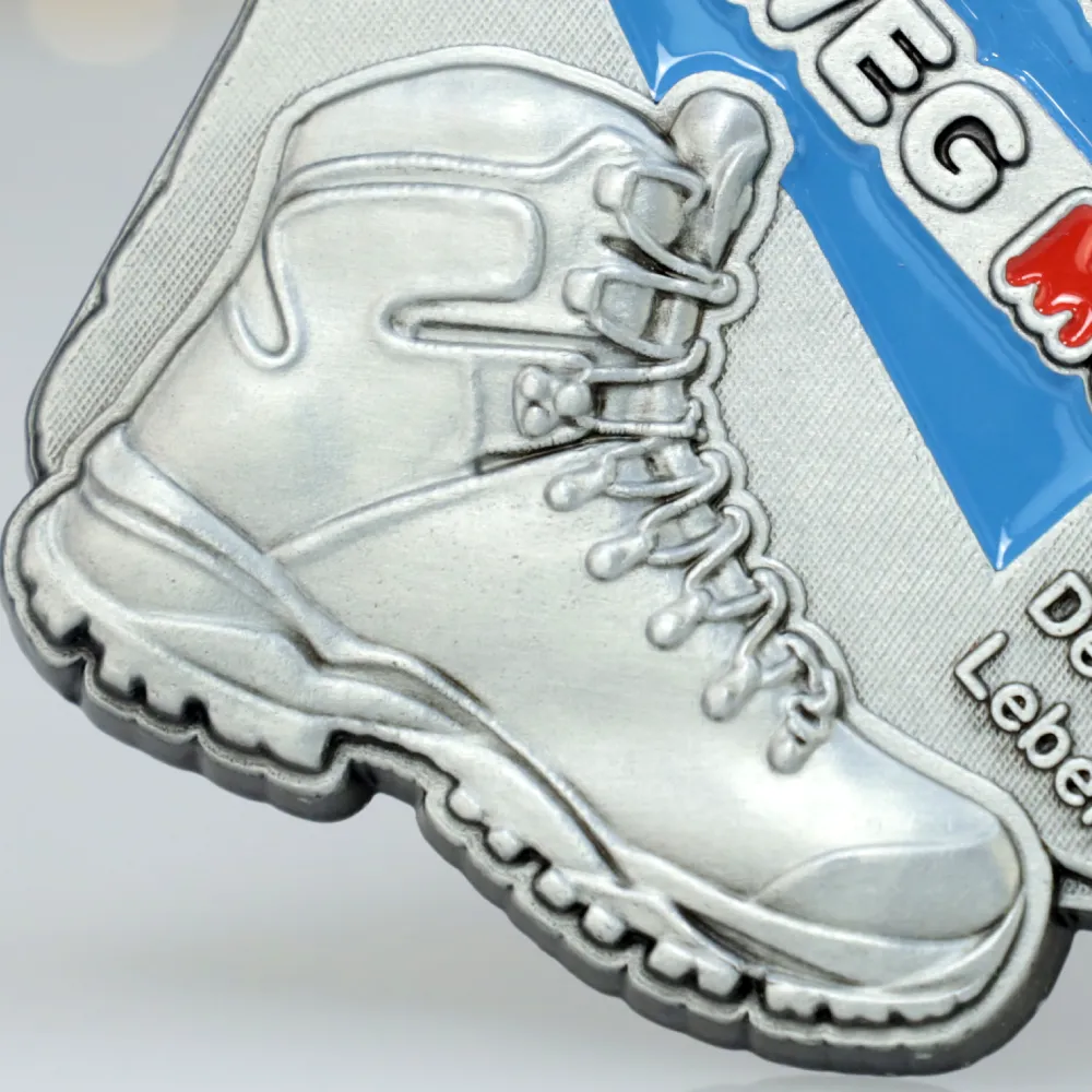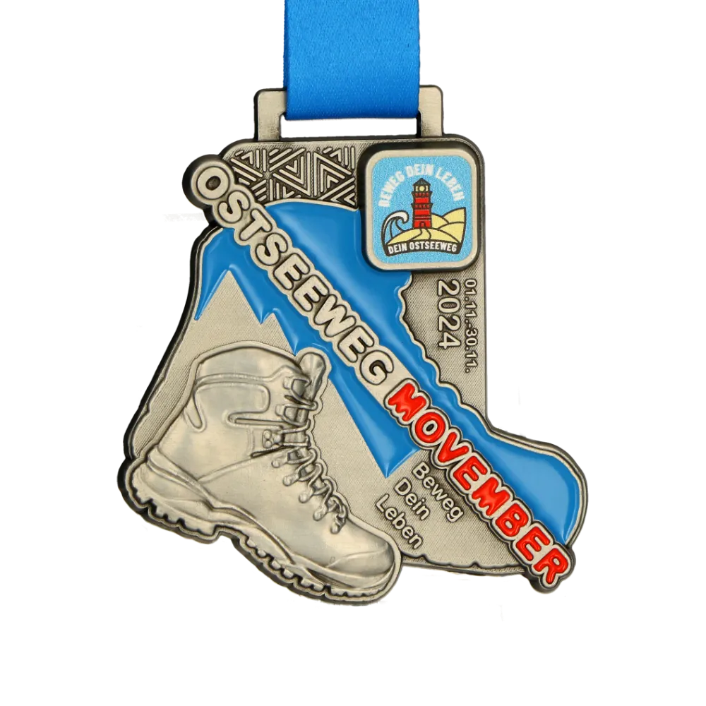 A cast medal in the shape of a trekking boot, designed for the Ostseeweg Movember 2024 event. The central feature is a stylised boot against a blue trail and mountain background, symbolising long-distance hikes. The medal includes event details, such as the lighthouse logo and dates. Vibrant colours like blue and red add energy to the design. Perfect for hiking enthusiasts and advocates of a healthy lifestyle.