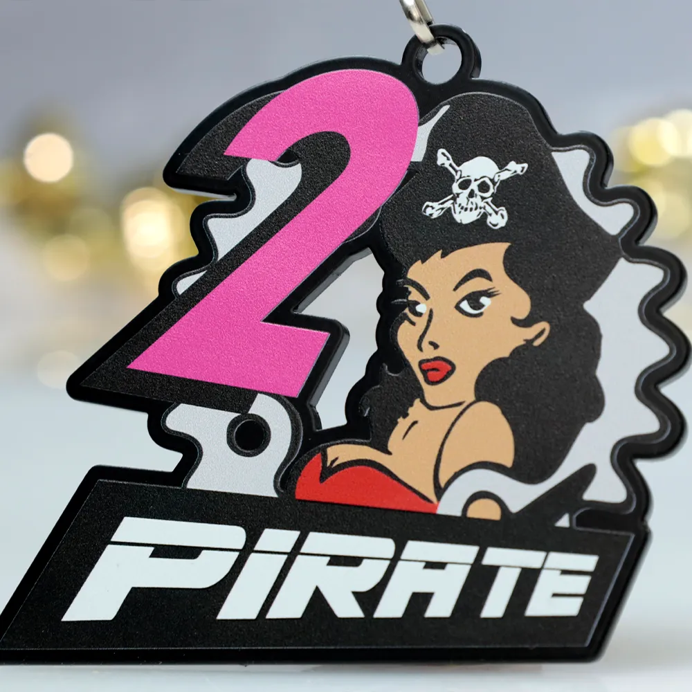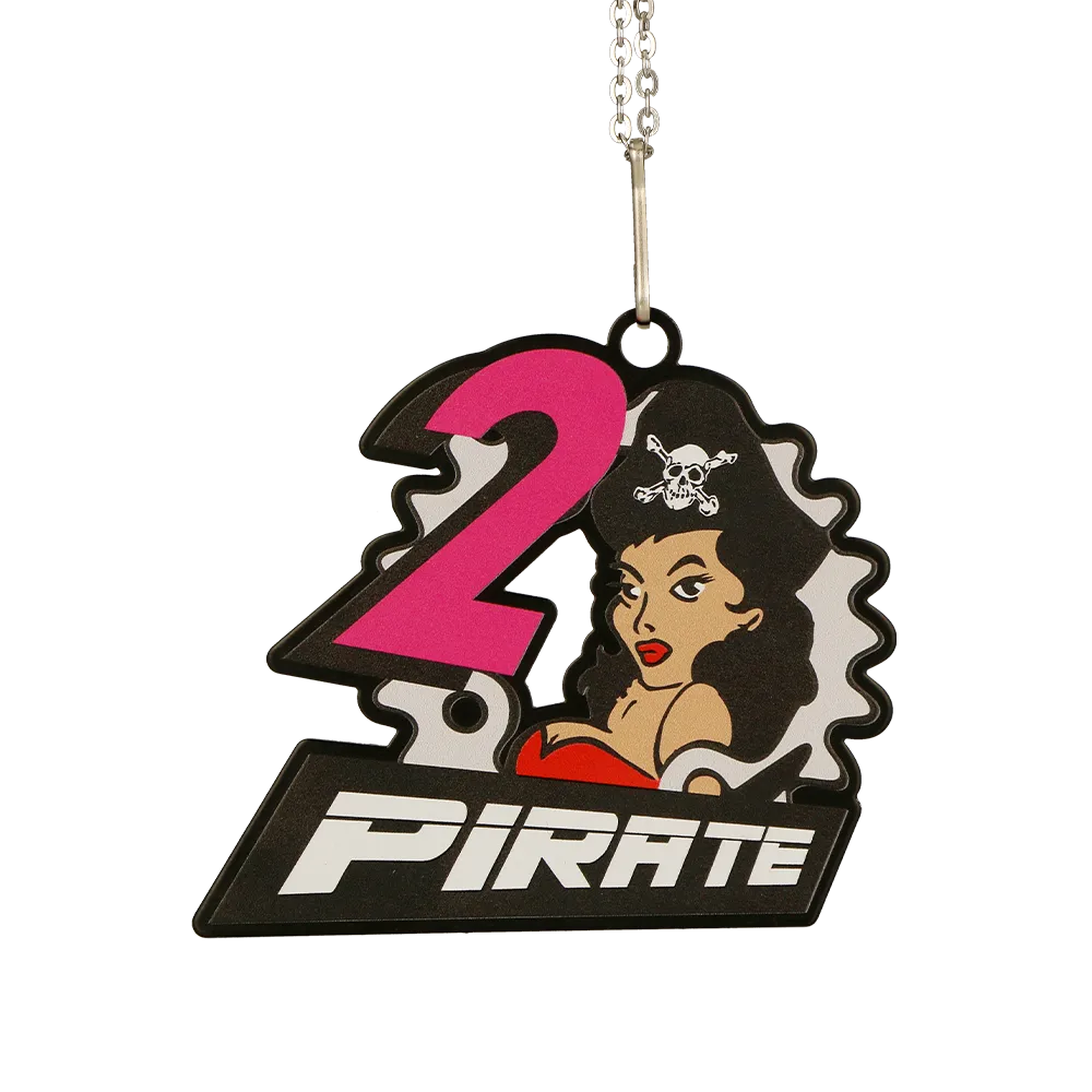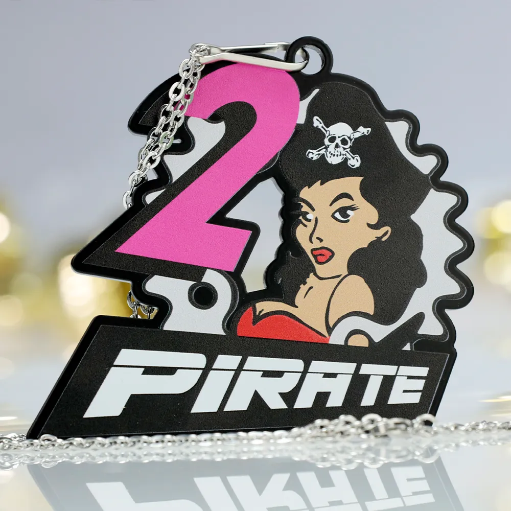 A personalised medal in the shape of the number '2', designed for a pirate-themed event. The central feature is a female pirate with a scarf decorated with a skull and crossbones. The medal is distinguished by bold colours such as pink, black, and white, with dynamic typography featuring the word 'Pirate' to emphasise the theme. It is suspended on a metal chain, giving it a unique character.