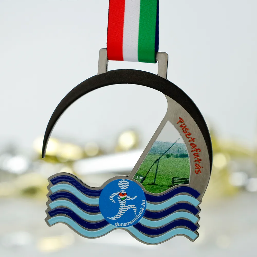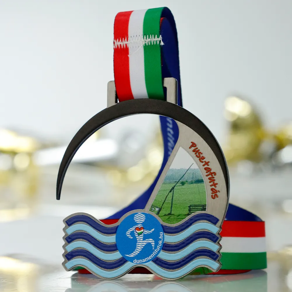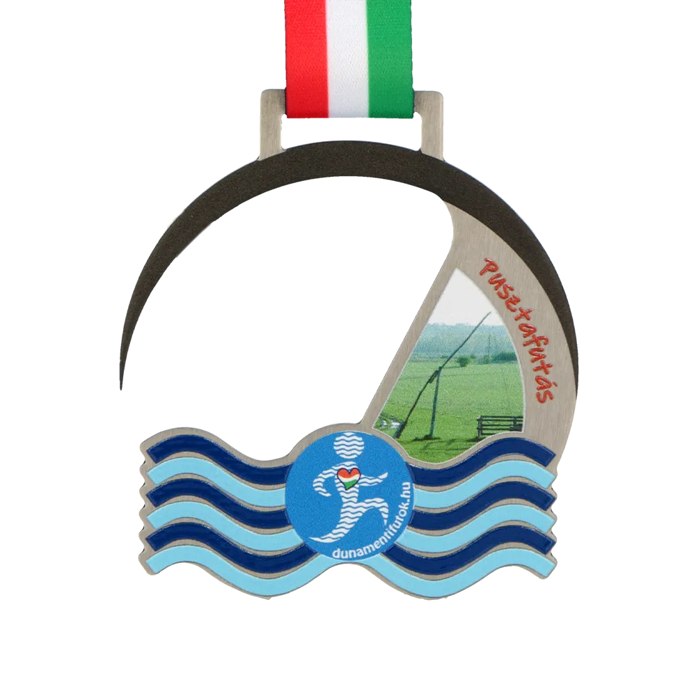This running medal was designed for the Pusztafutás race organised by Dunamentifutok.hu. The shape is laser-cut and features two main elements: a black semi-circular upper section and a lower section formed by blue waves. Inside is a full-colour UV print depicting the Hungarian puszta and the race logo.