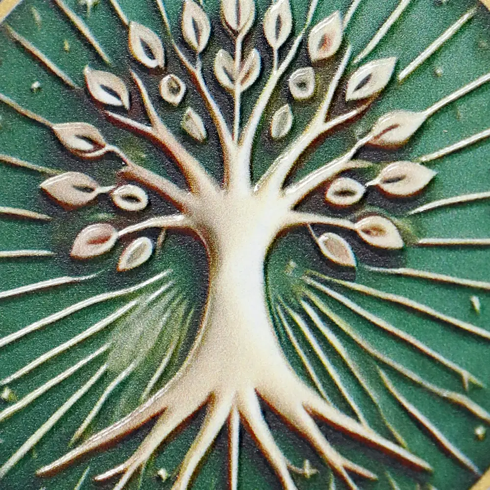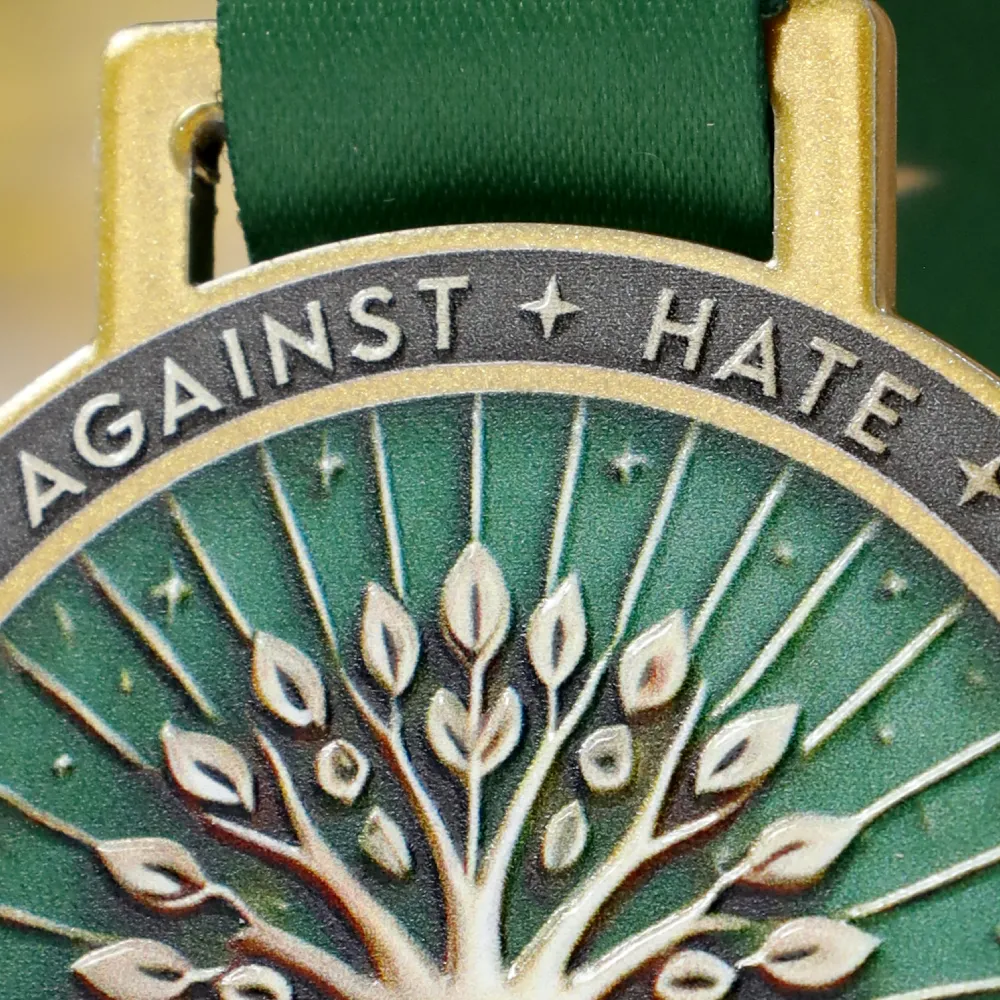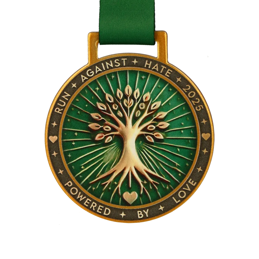 Personalised running medals for Run Against Hate 2025. Gold medals with a green background and a raised tree motif, crafted using UV printing. The medals are suspended from green ribbons, emphasising the event’s eco-friendly and peaceful theme.