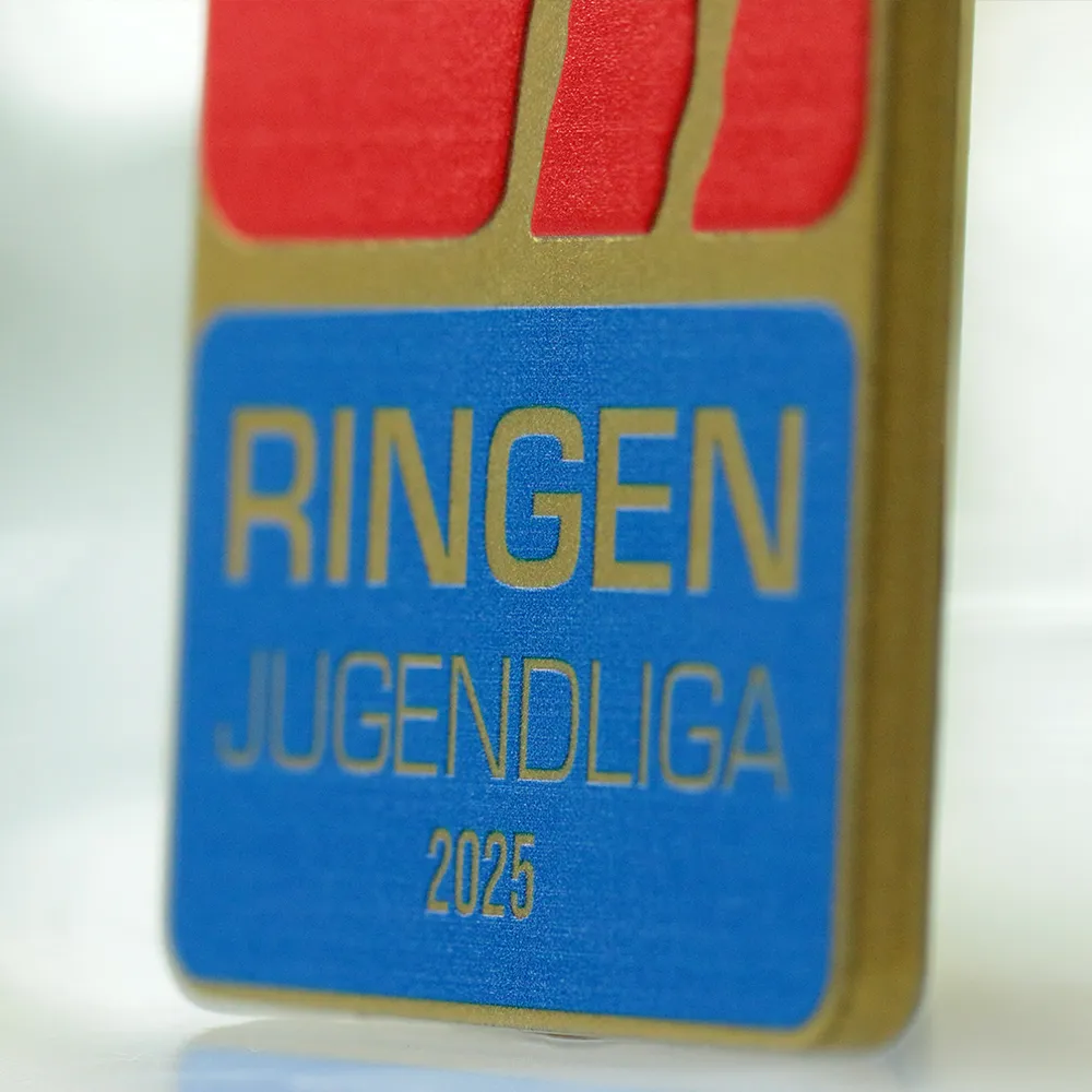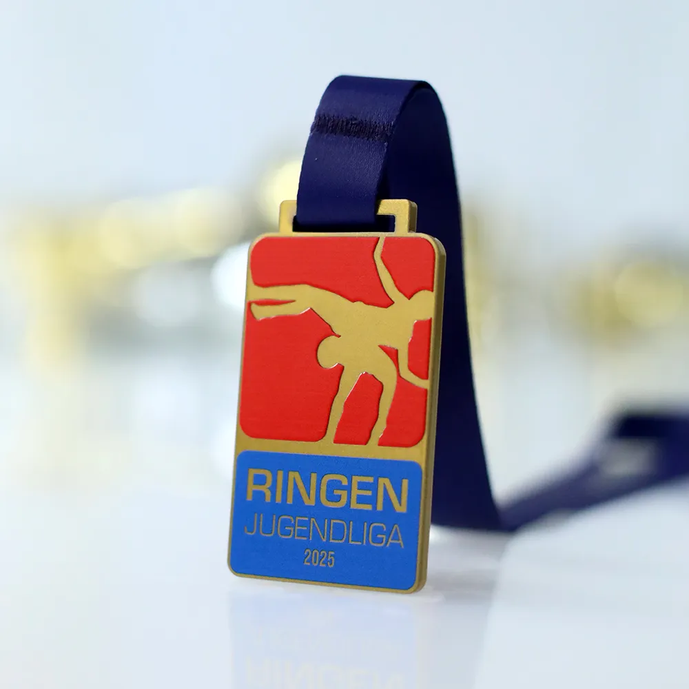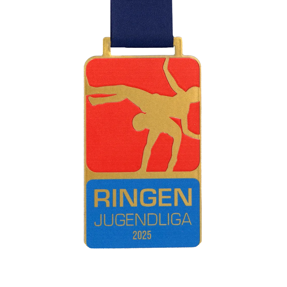 The steel judo medal designed specifically for the Ringen Jugendliga 2025 tournament features a modern, rectangular form. The use of UV printing technology has achieved rich, saturated reds and blues alongside a tactile, matt-textured background. Precise gold detailing and crisp lettering make this a durable custom medal of outstanding aesthetic quality.