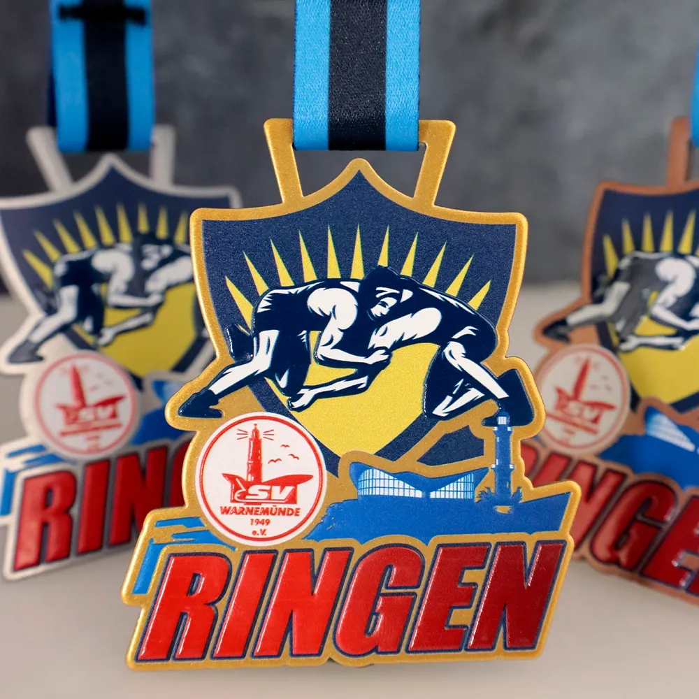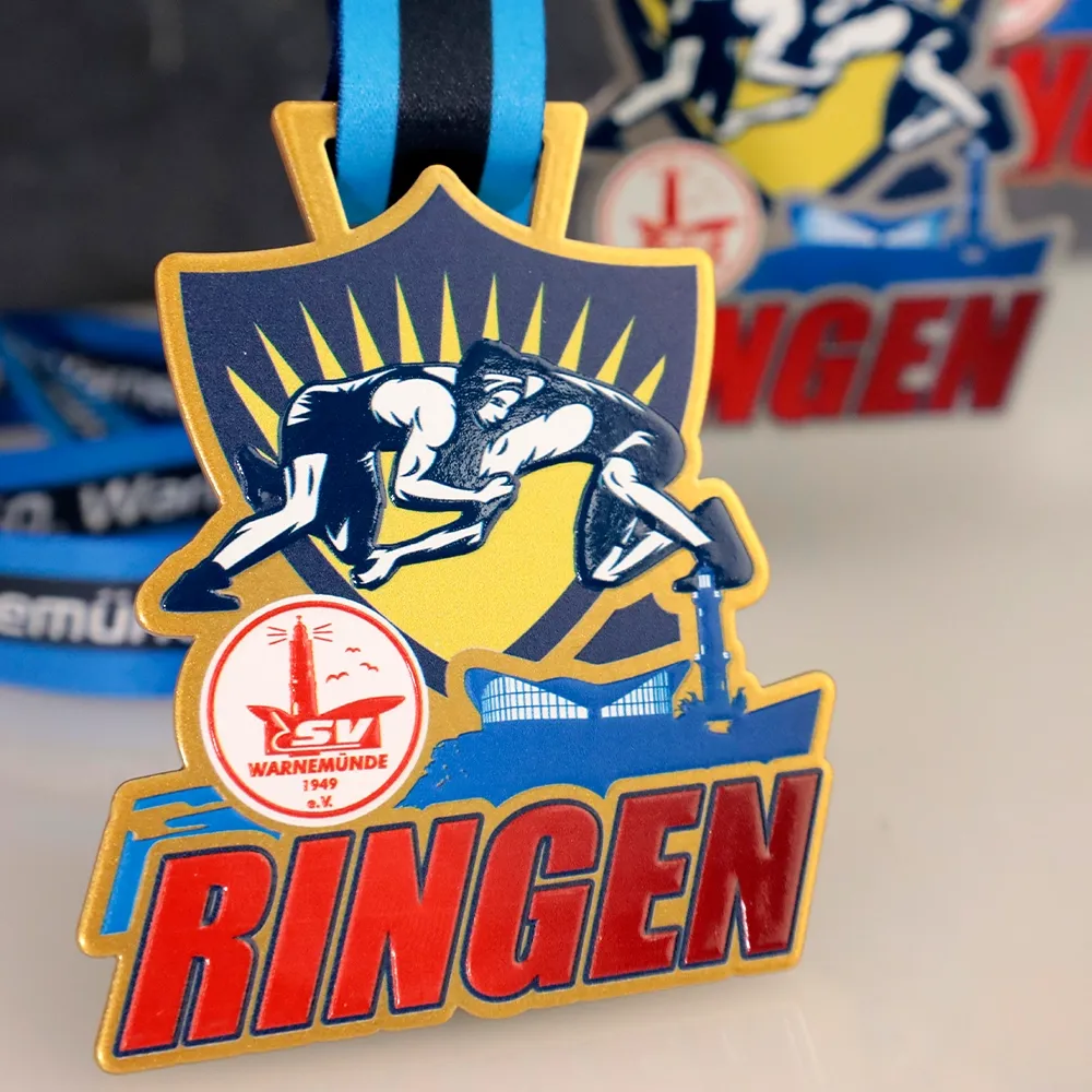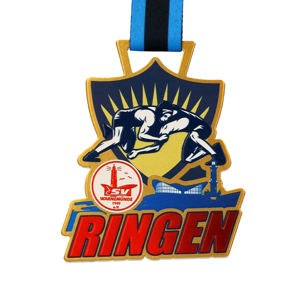 We crafted this richly decorated sports medal for the PSV Warnemünde 1949 e.V. club. In the centre of the medal, we placed a scene of wrestlers in action, perfectly capturing the character of the event for which it was created. The medal has an irregular shape with rounded edges, giving it a distinctive appearance.