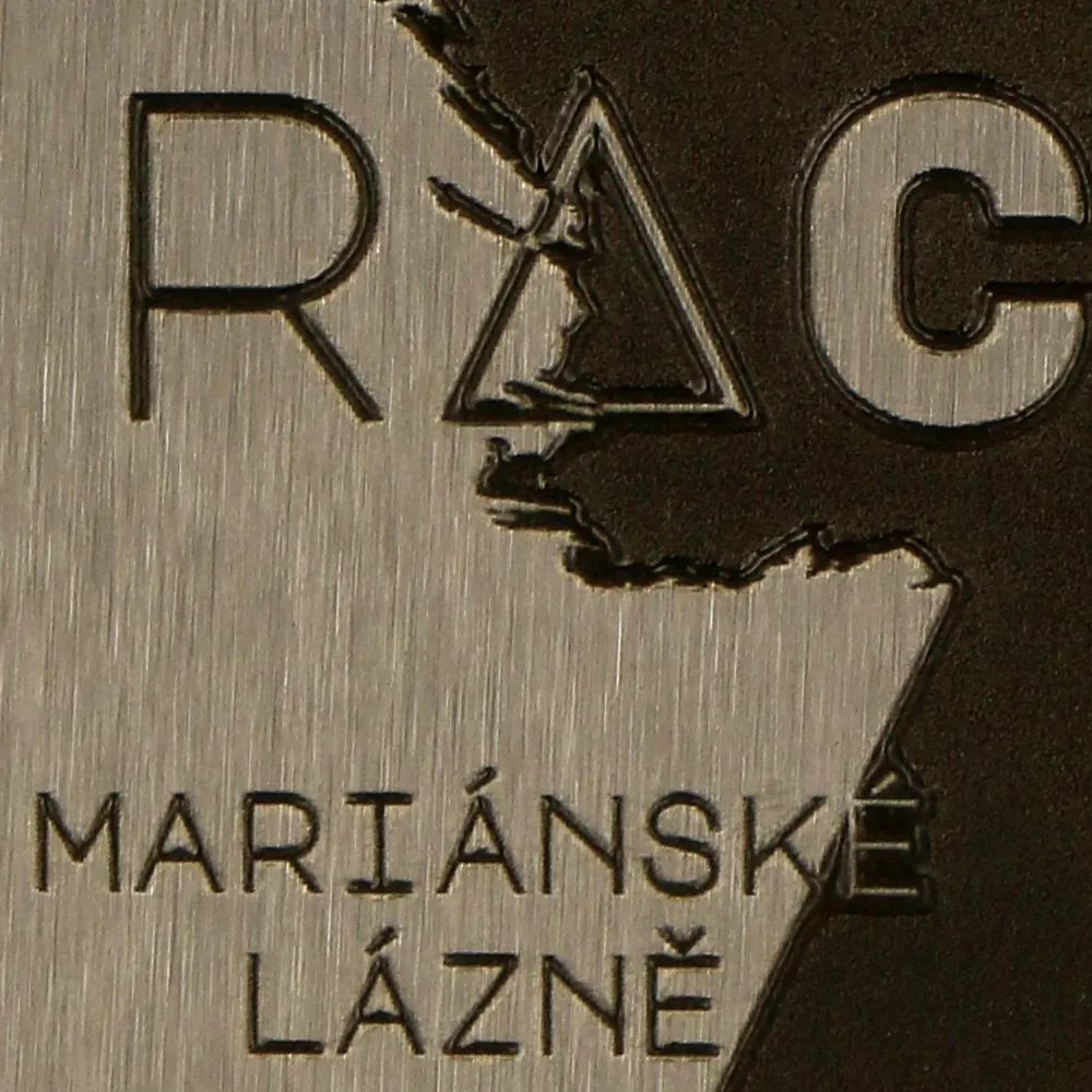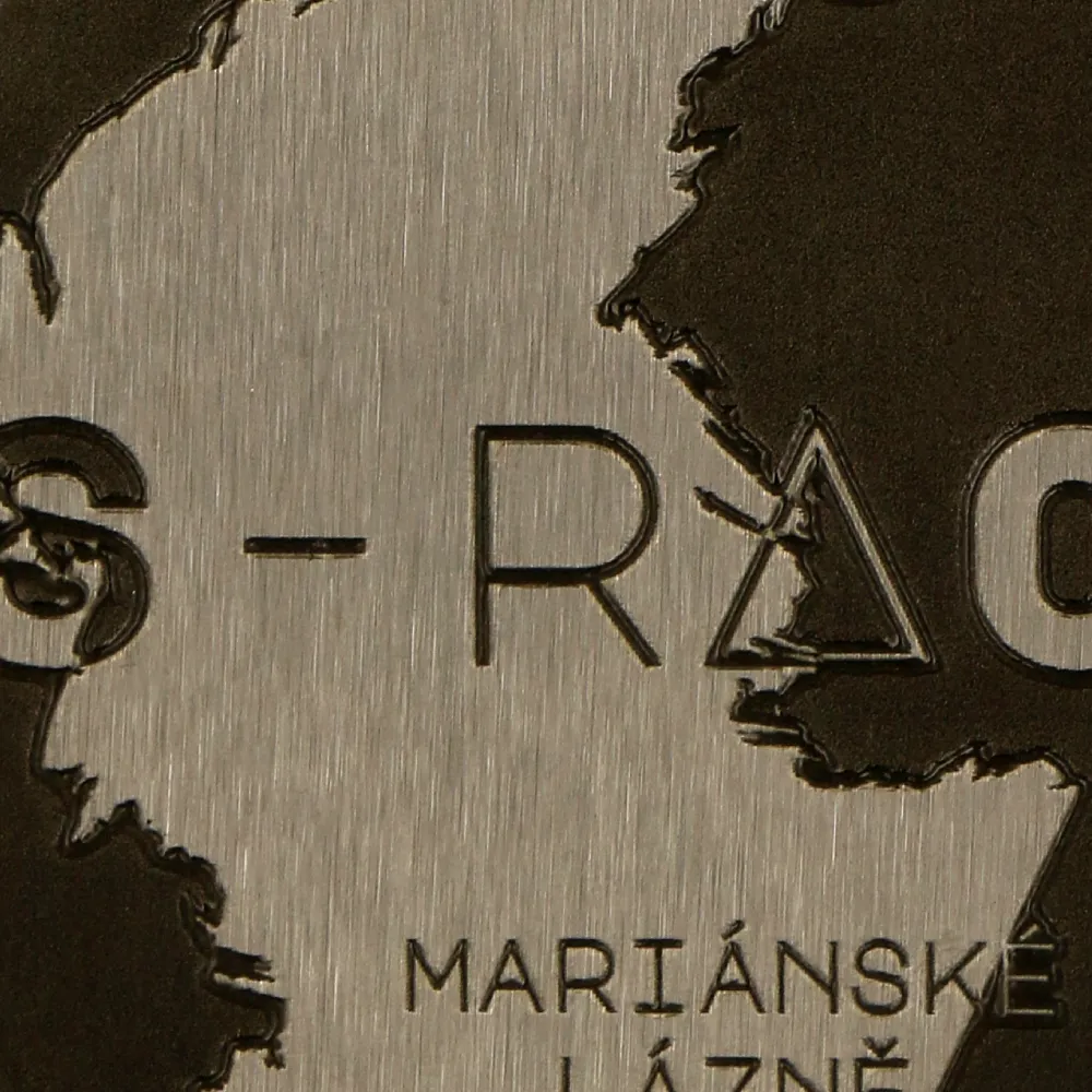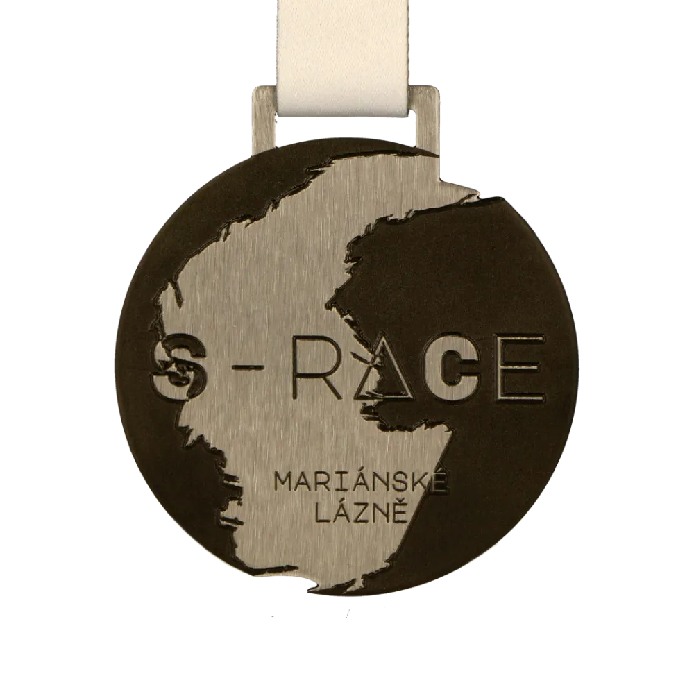 A personalised sports medal designed for the S-Race event in Mariánské Lázně. The medal features the outline of a world map and a cut-out of the event name, giving it a modern and minimalist look. It is hung on an elegant white ribbon, emphasising its prestigious character.