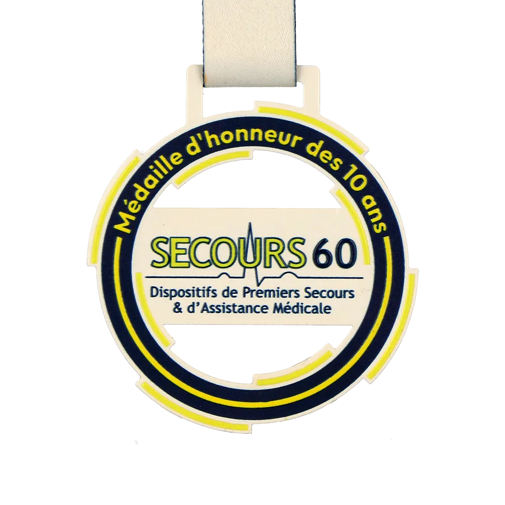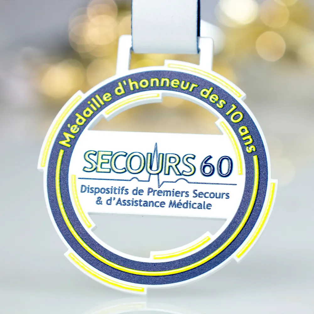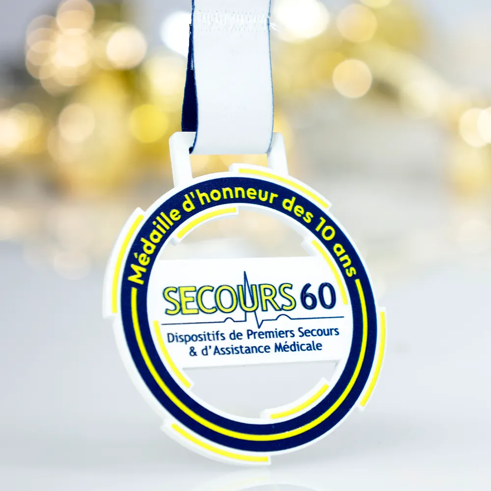 Personalised Medal designed for the Secours60 event. The medal includes a graphic motif with medical elements, perfectly reflecting the event's theme. We used UV printing to add colourful accents, ensuring a durable and aesthetic finish.