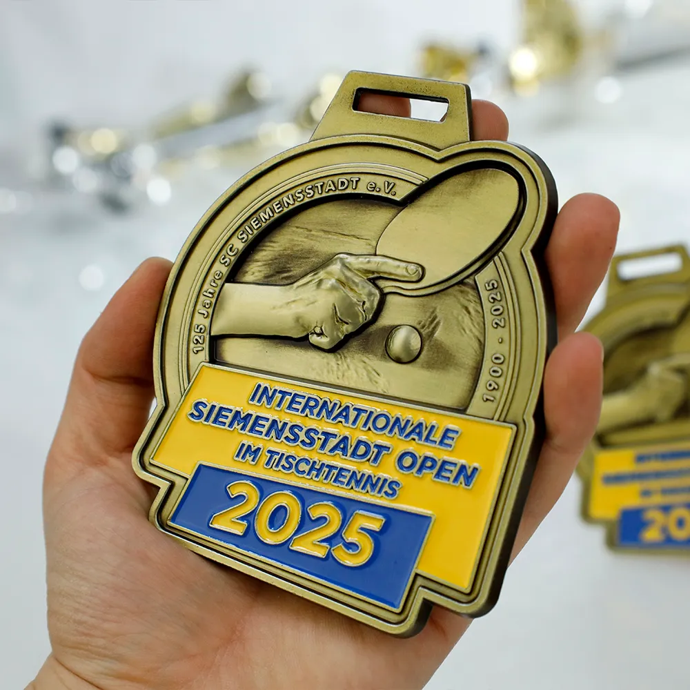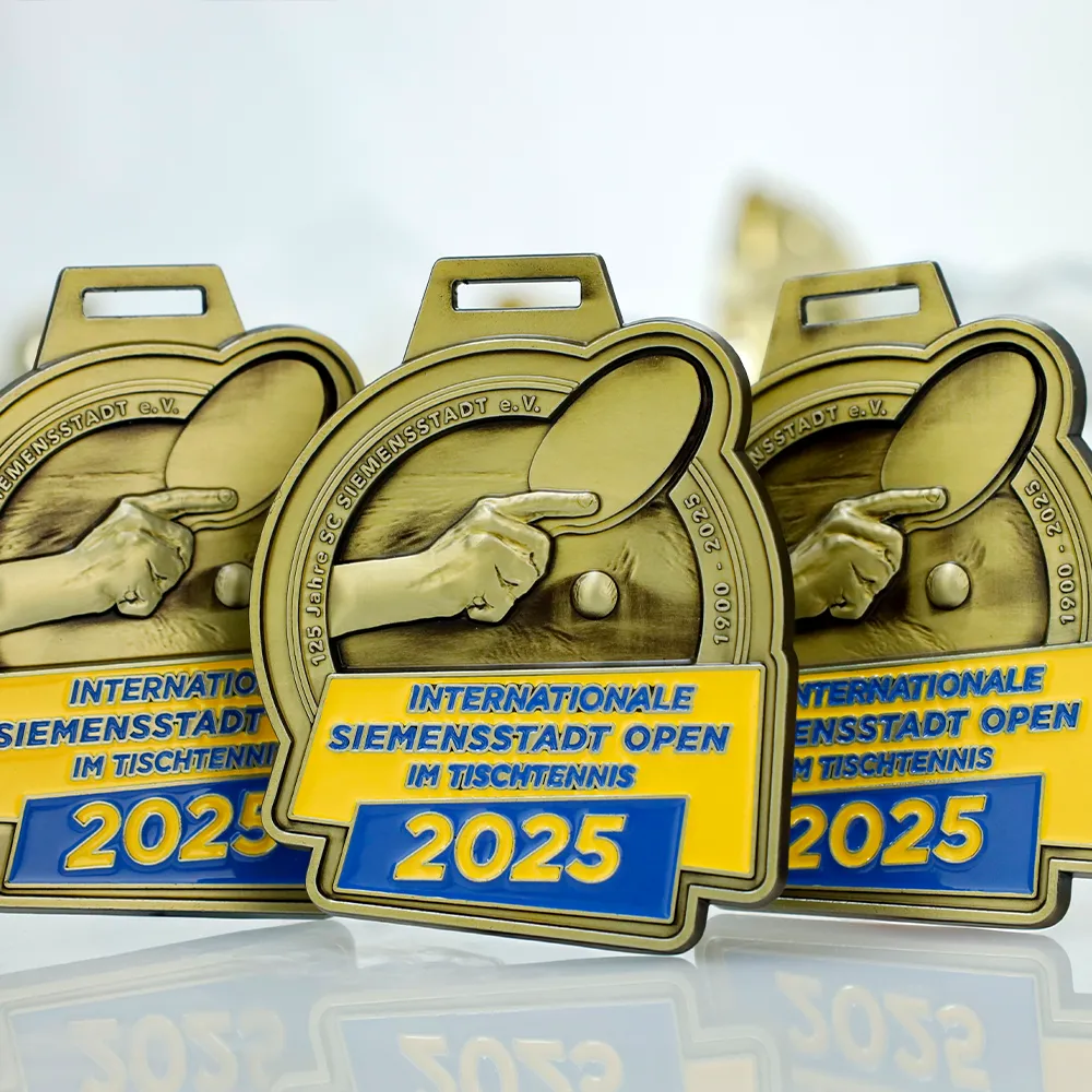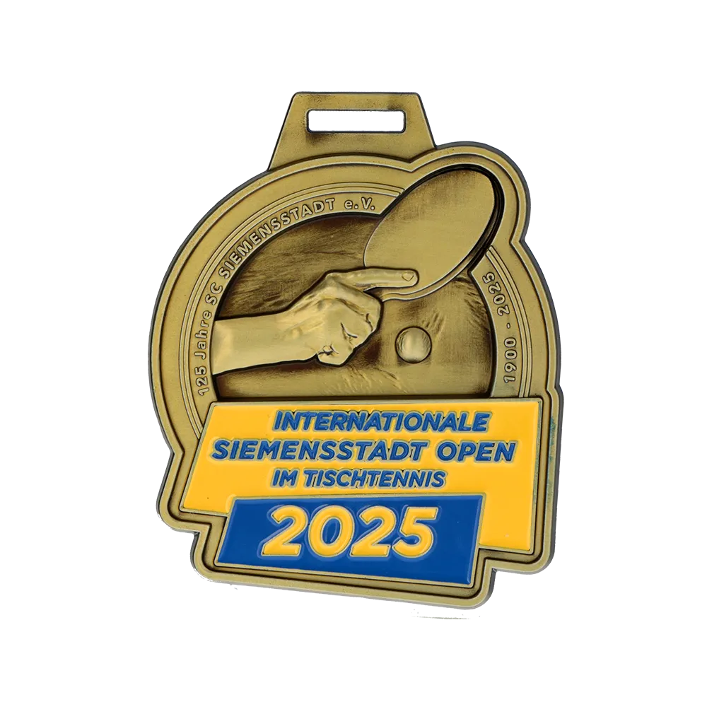 Bespoke medal designed for the "Internationale Siemensstadt Open 2025" table tennis tournament. The 3D cast medal, finished in an antique gold colour with vibrant blue and yellow enamel, features a relief on the obverse depicting a hand holding a table tennis racket and a ball.