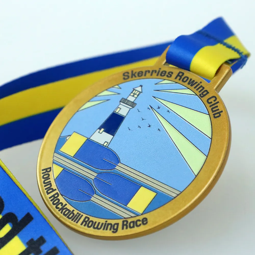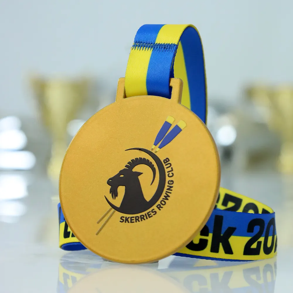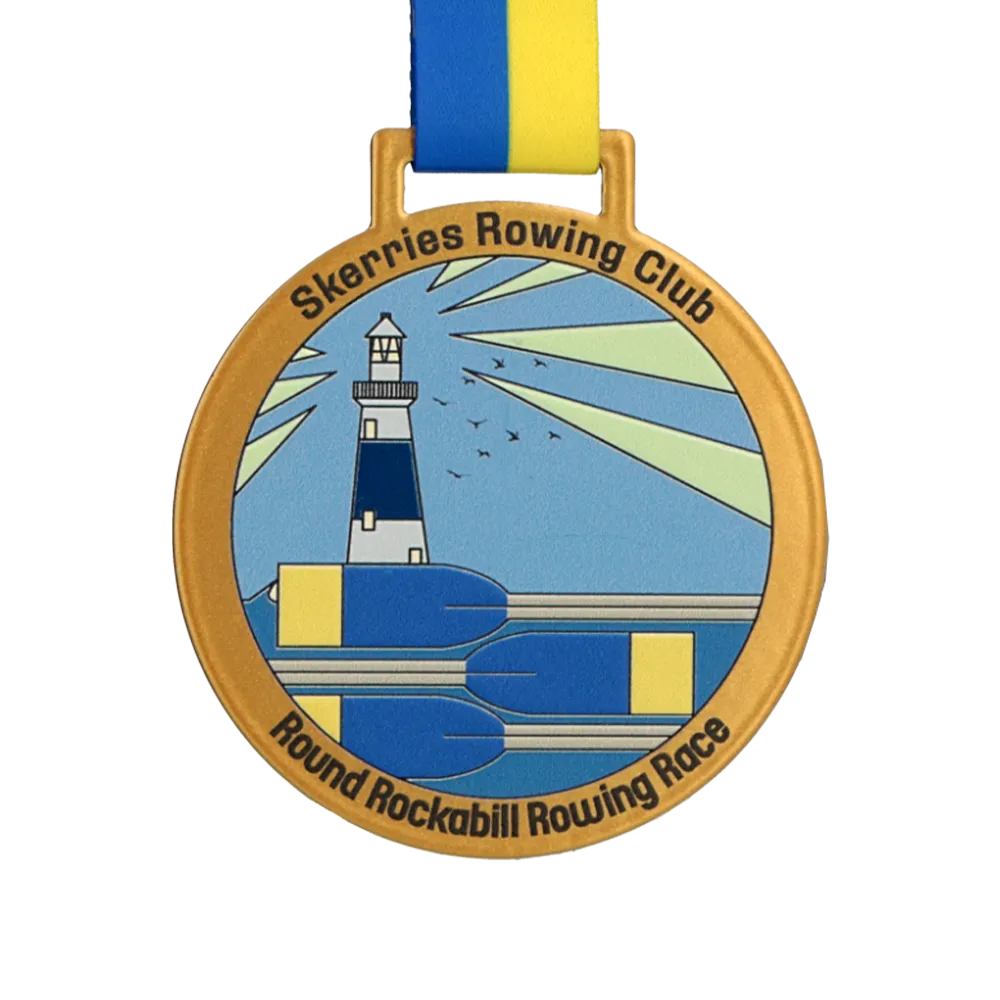 Designed for the Skerries Rowing Club, this steel medal stands out through its classic form and striking graphic motif. The UV printing technique ensures excellent legibility of the lettering and colour vibrancy, making these sports medals exceptionally attractive. The result is a modern and professional medal perfectly suited to rowing enthusiasts.