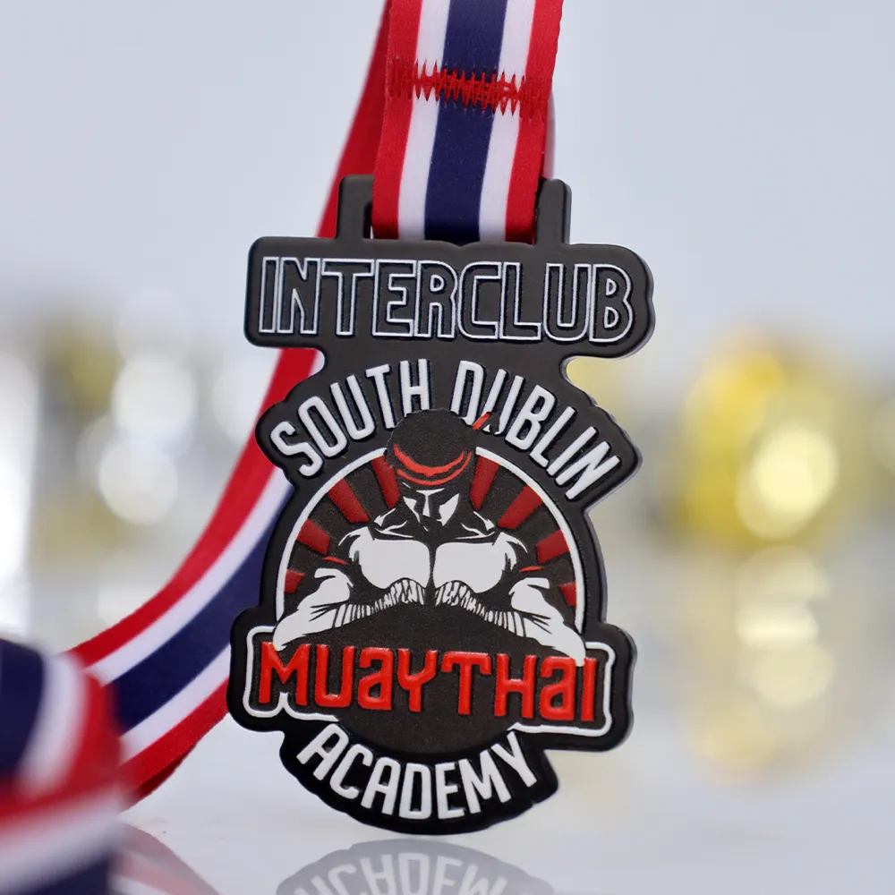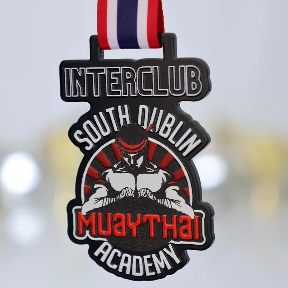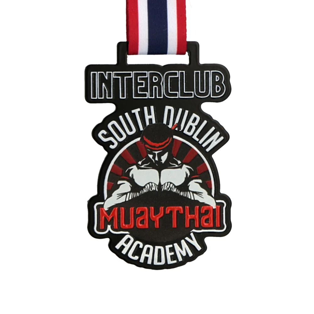 The Muay Thai steel medal designed for the South Dublin Muay Thai Academy Interclub tournament is distinguished by its non-standard cut line. The application of UV printing on a black background gives the white and red elements a vivid, tactile texture and deep contrast. The precision craftsmanship makes these custom medals a lasting award, with the ensemble completed by a ribbon in the colours of the Thai flag.
