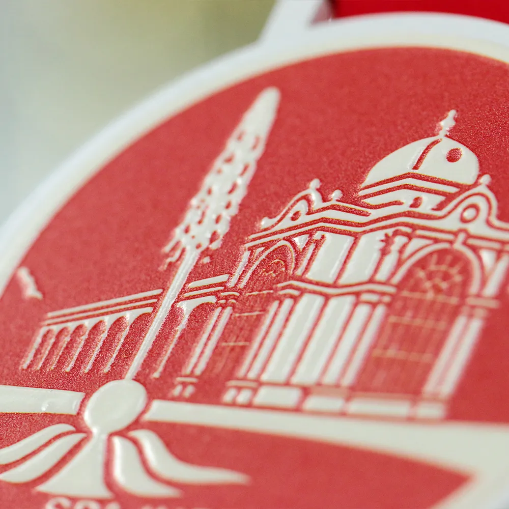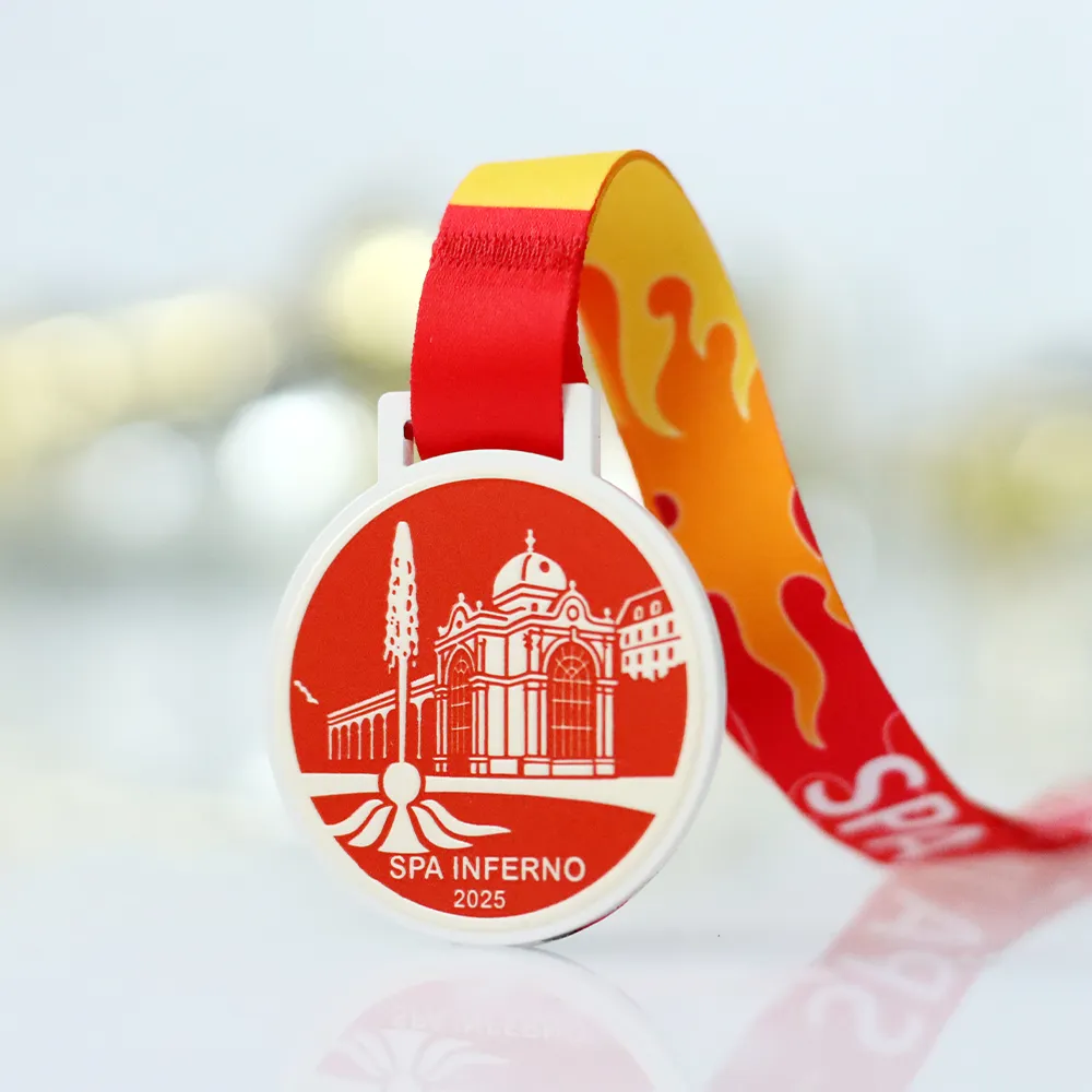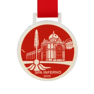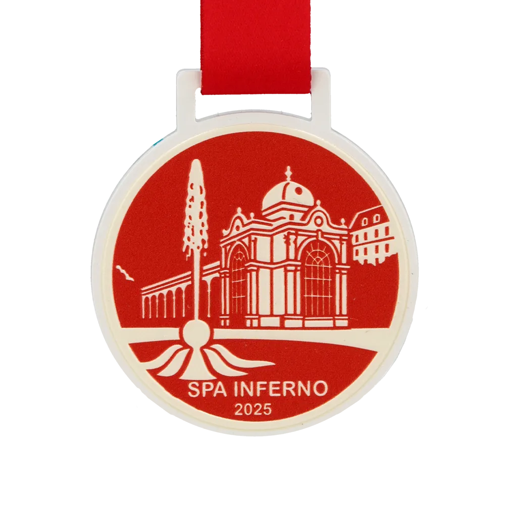 The steel medal for Spa Inferno 2025 is distinguished by its modern, high-contrast design built around white and deep red. The UV printing ensures excellent legibility of the logos and date, guaranteeing a high-quality finish for this sporting keepsake. By choosing these personalised medals, organisers opt for a stylish solution that, complemented by a colour-matched red ribbon, presents itself with exceptional prestige.