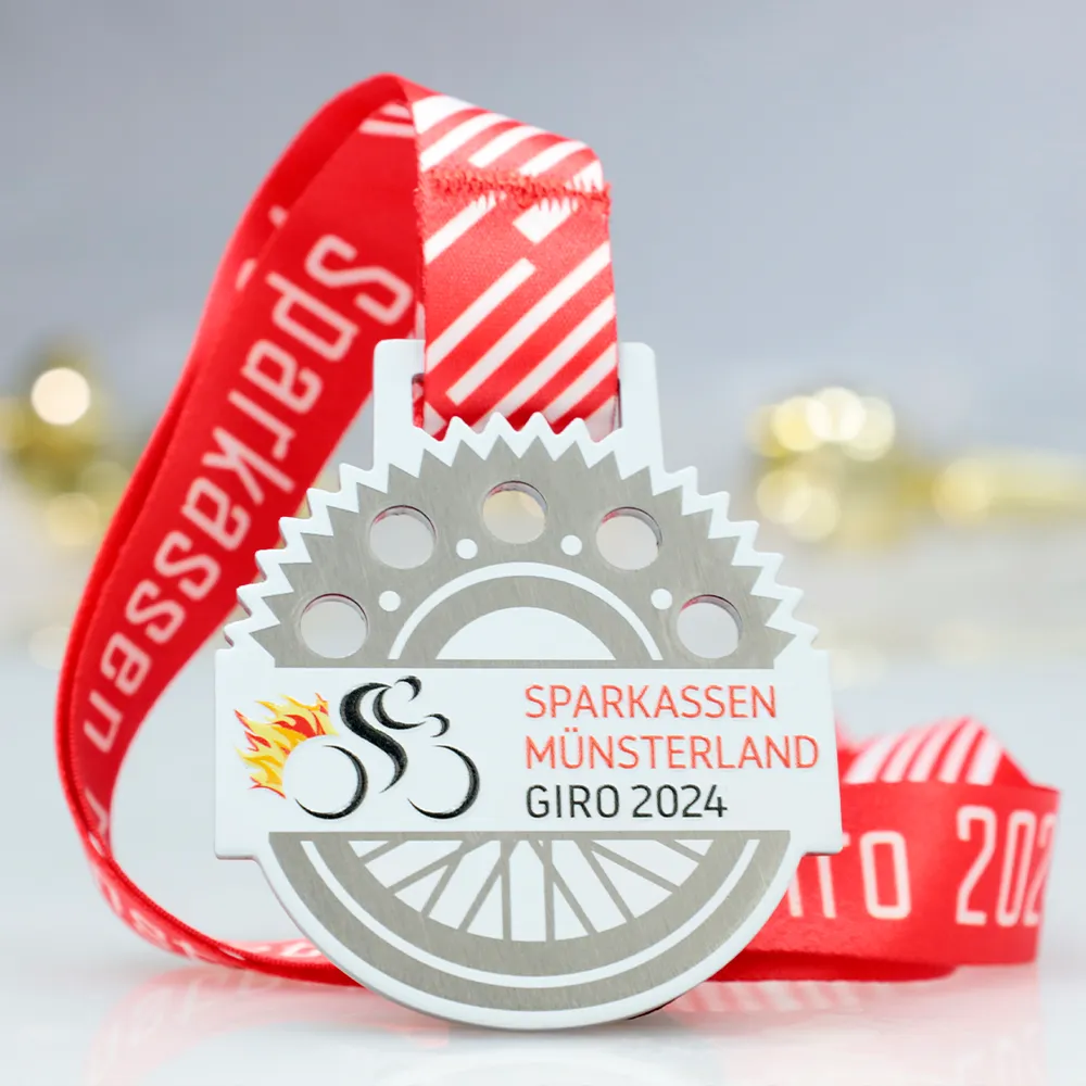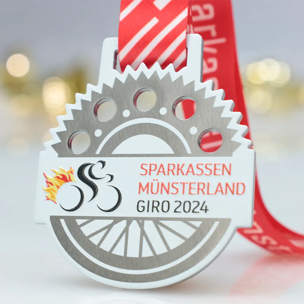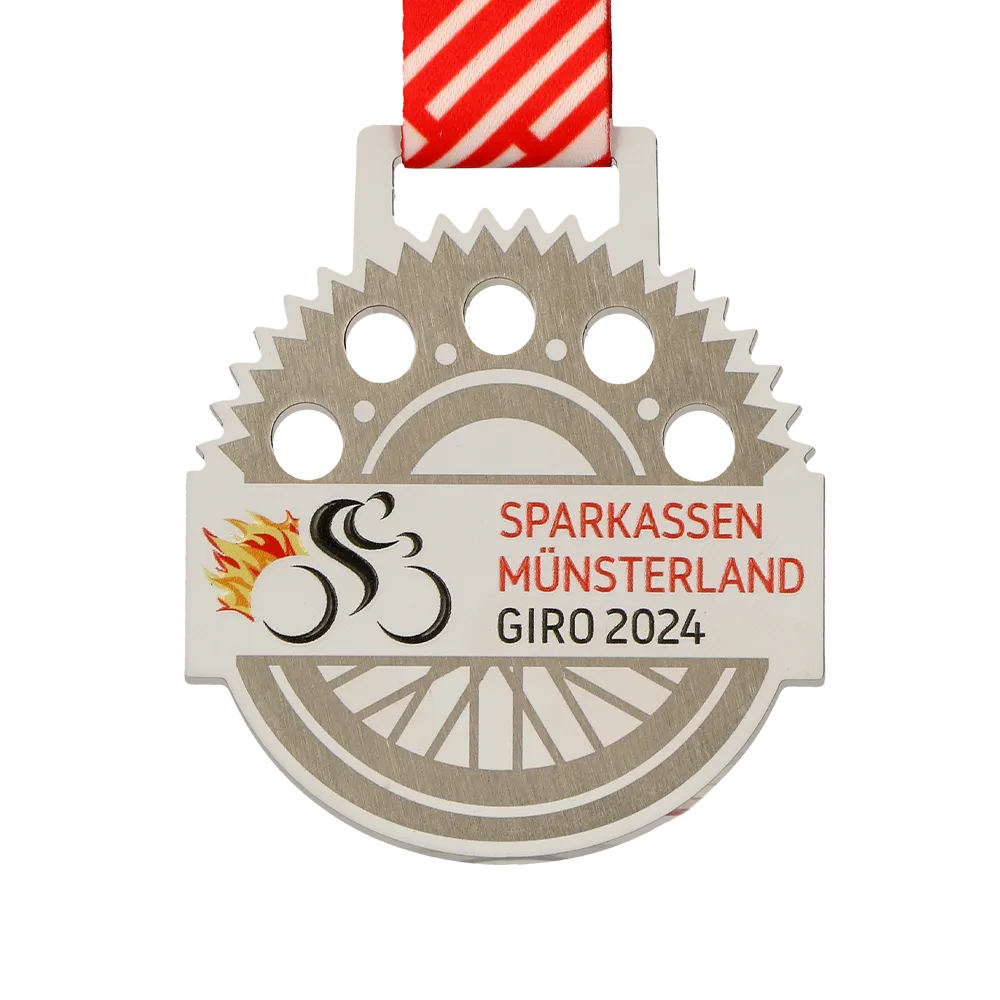 A cycling medal in the shape of a gear, designed for the Sparkassen Münsterland Giro 2024 race. The main elements include a wheel motif and flames, created using UV printing. The medal features the event name and year. It is suspended on a red ribbon with white stripes, highlighting the dynamic nature of the event.