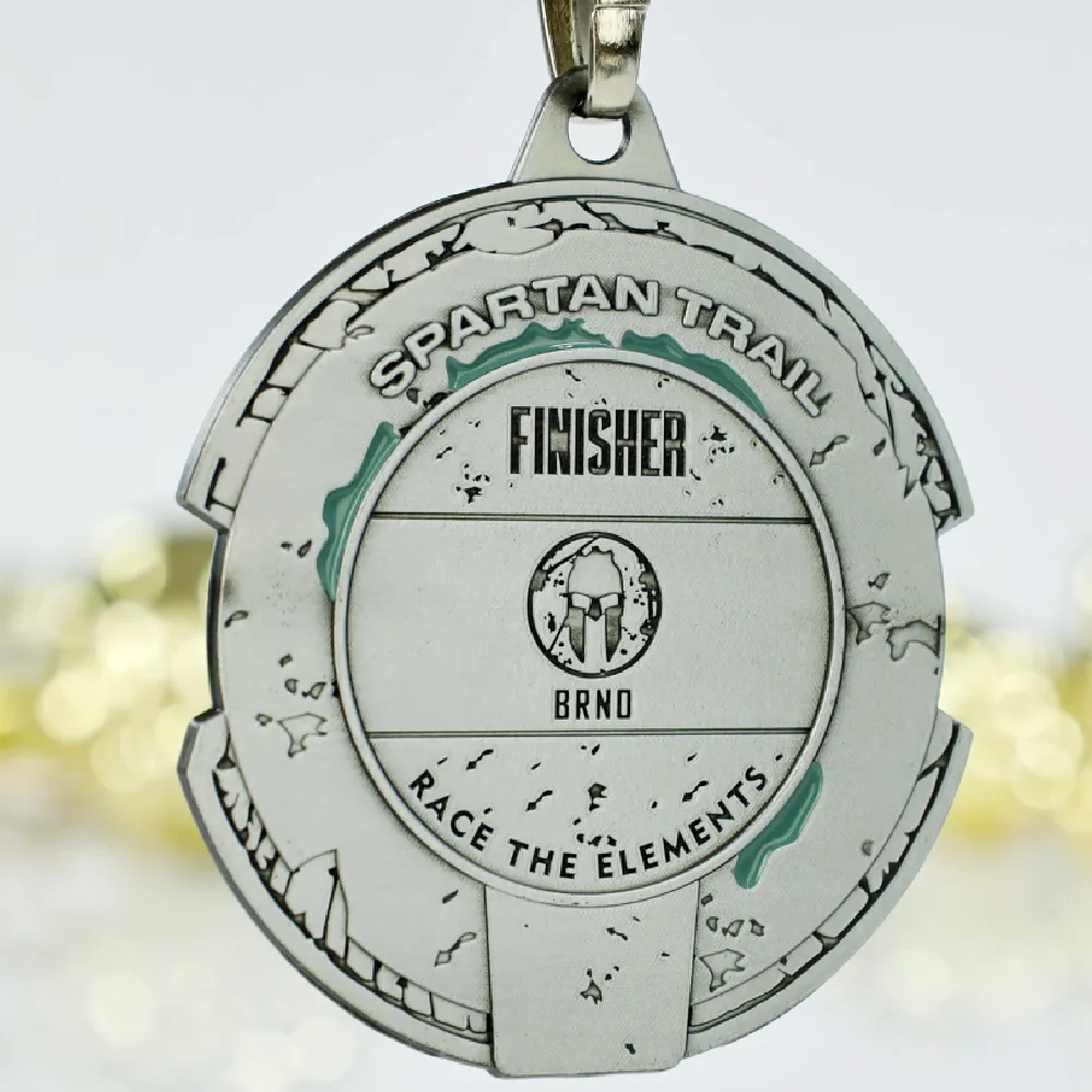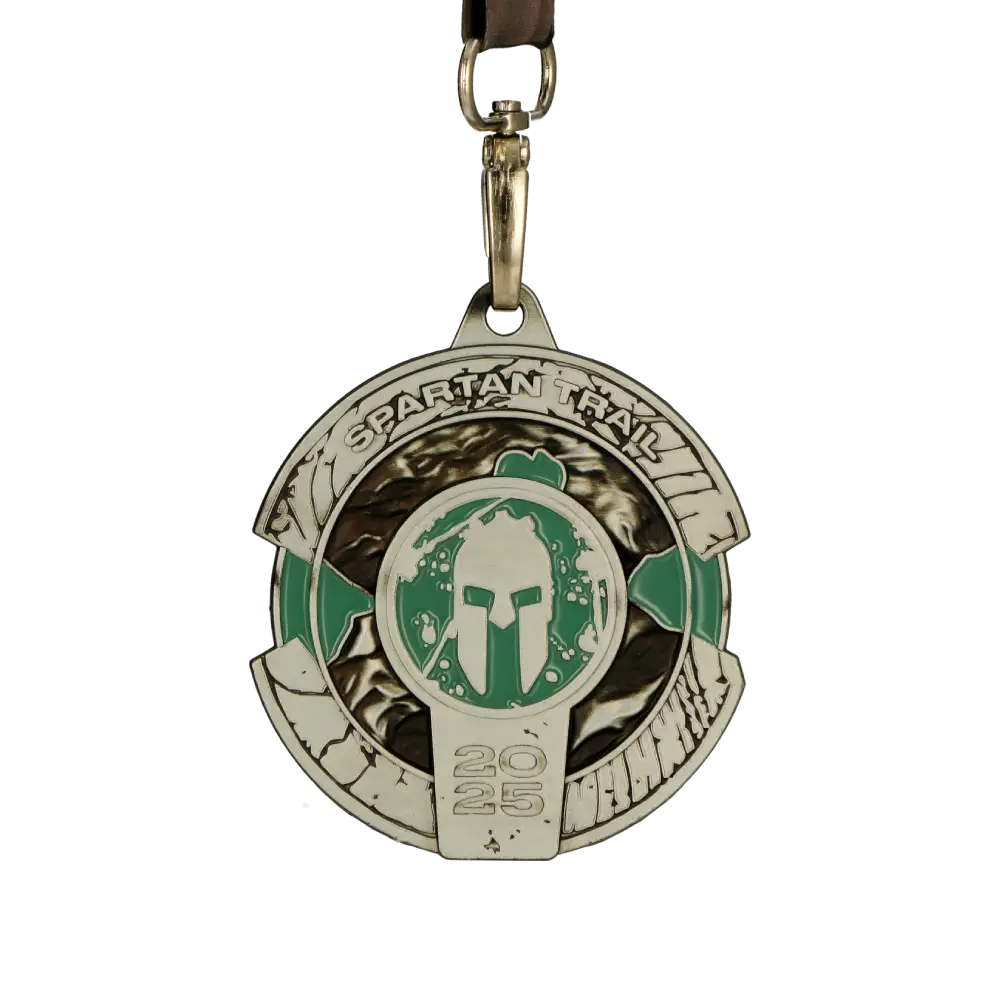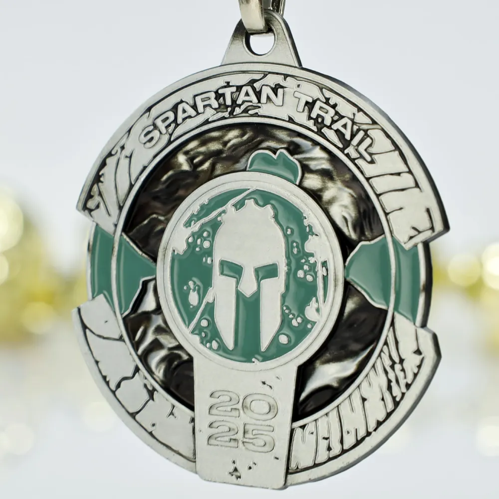 Bespoke sports medals created for Spartan Trail 2025. Silver medals with green accents and a distinctive Spartan helmet at the centre. Raised elements highlight the rugged terrain motif, with the event name and year 2025 clearly marked. The bespoke medals are suspended from a dark ribbon with a metal carabiner.