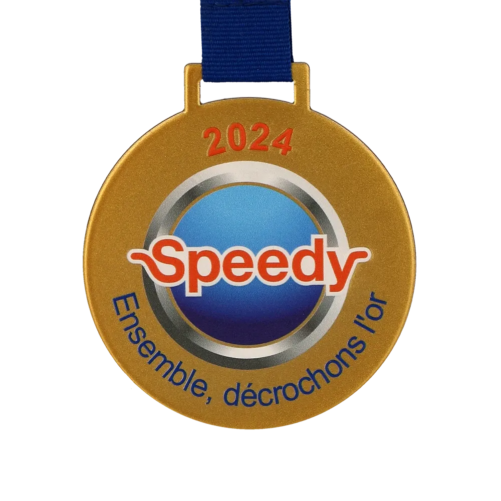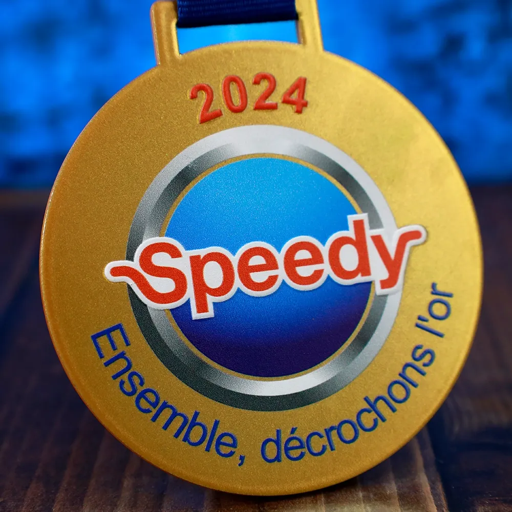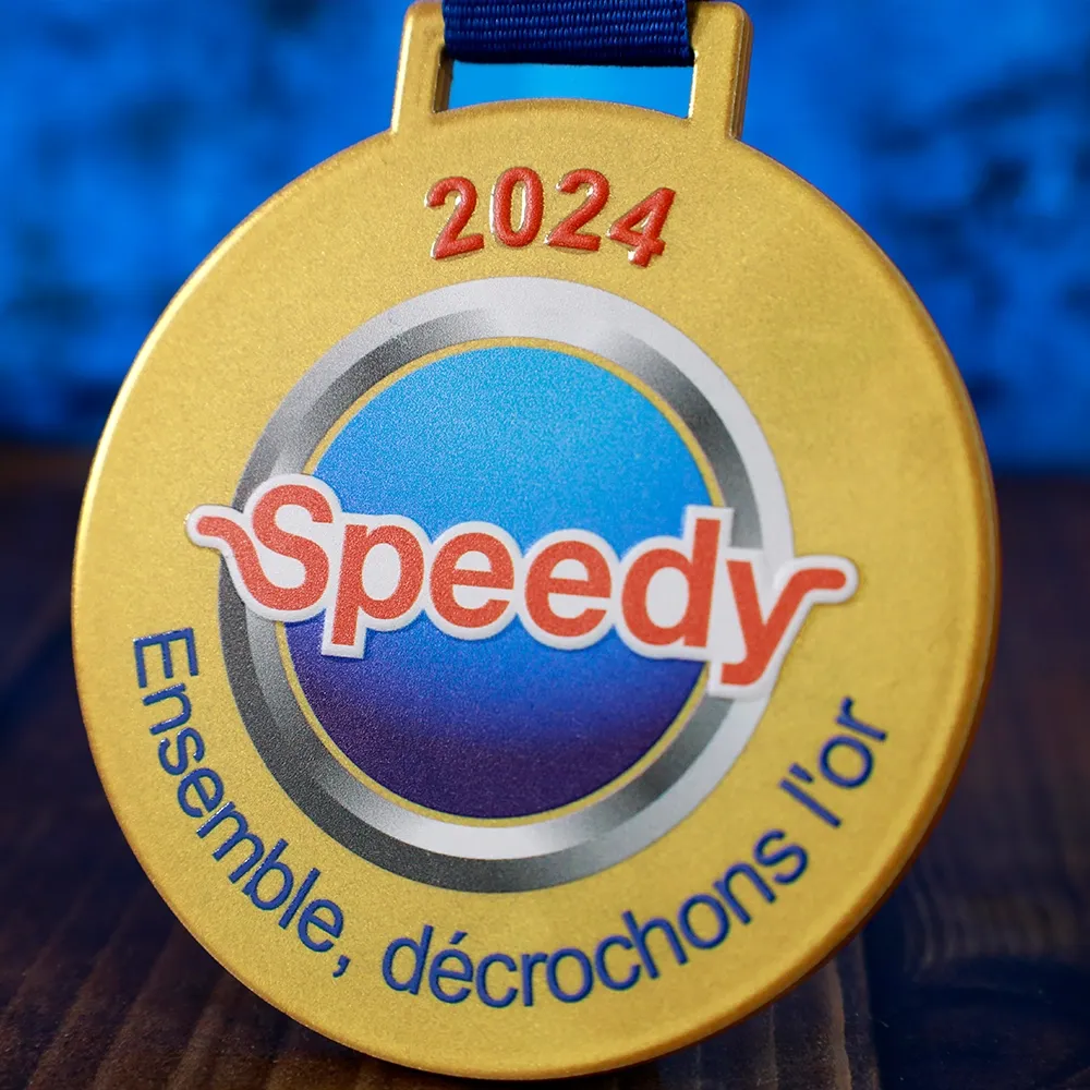 A personalised medal for participants of the Speedy 2024 event. The medal has an elegant, gold design with a central logo and a motivational slogan. An excellent choice for organisers who want to offer participants something special and motivating.