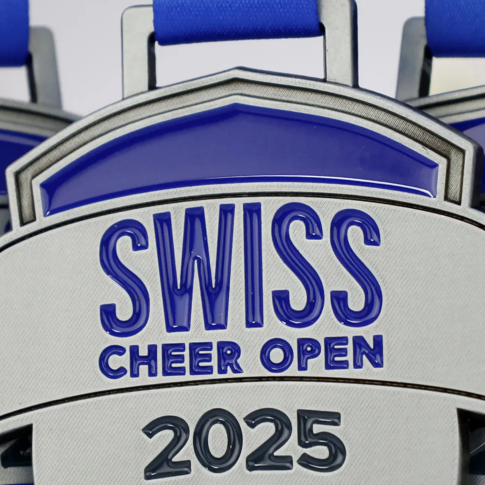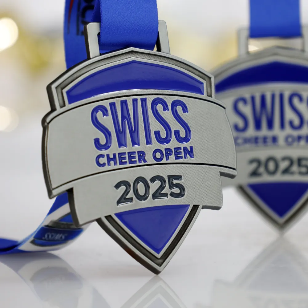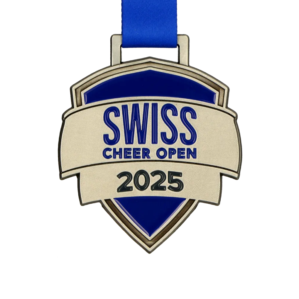 A bespoke medal made for the Swiss Cheer Open 2025 – a prestigious cheerleading competition. The medal has a shield shape in silver with a raised, blue decoration and a contrasting inscription. The name of the event and the year of the edition are clearly emphasised. The whole is complemented by a blue ribbon that harmonises with the medal’s colours, giving it a dynamic and sporting character.