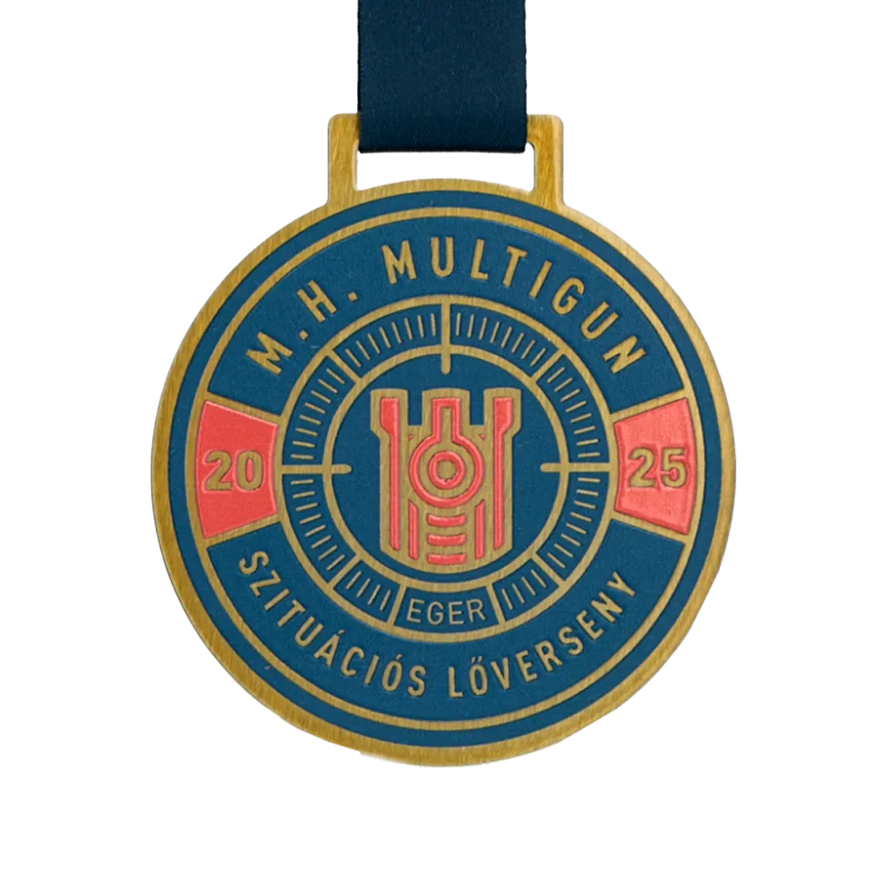 Round shooting medal M.H. Multigun Szituációs Lőverseny, laser-cut from steel and finished in matt gold. UV printing builds the composition across three zones: an outer ring bearing the competition name and Eger location, a middle band with an angular scale, and a central sight reticle with a firearm pictogram.