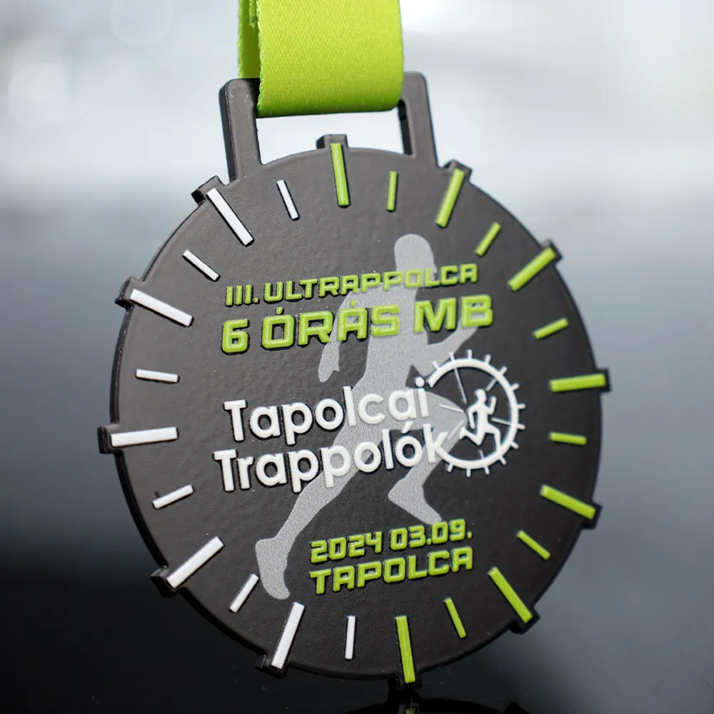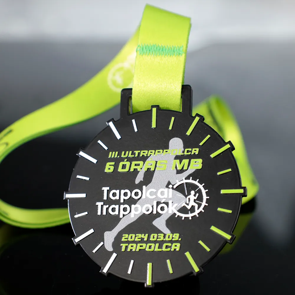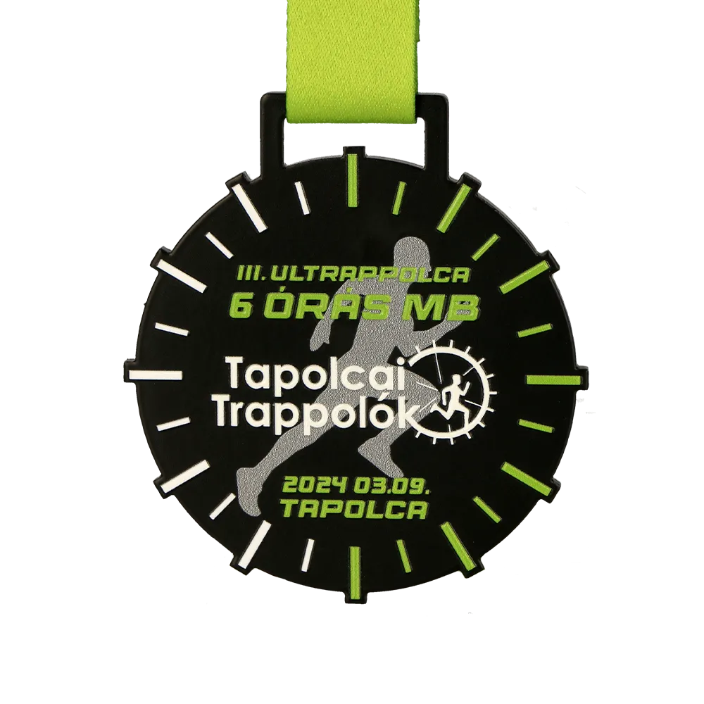 A sports medal for participants of III. Ultrappolca 6 órás MB. The medal features a clock printed using UV printing, symbolising the race against time during the six-hour run. The silhouette of a runner on the medal highlights the unique character of this run.