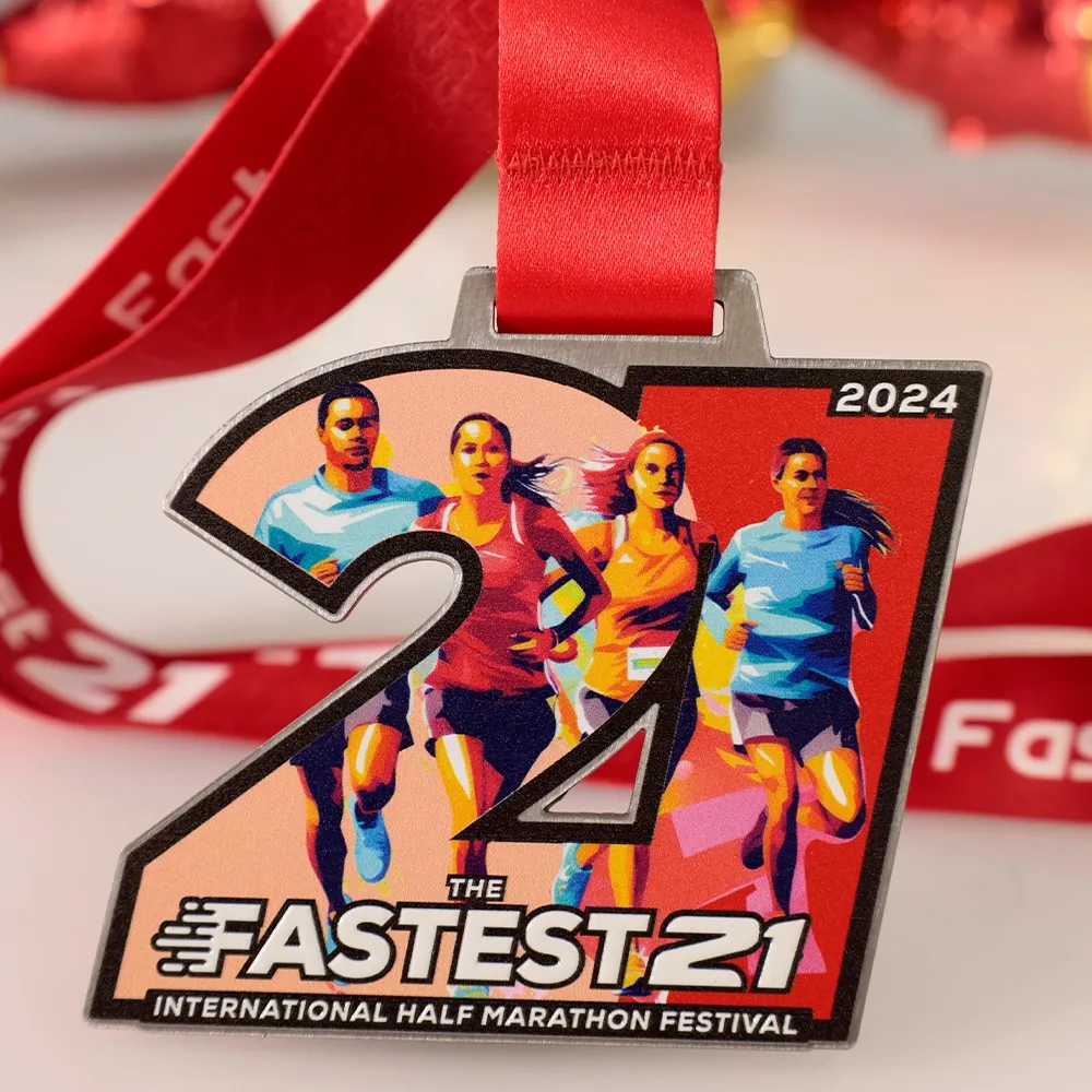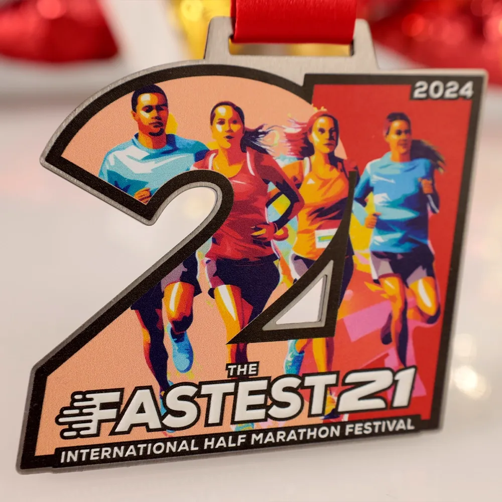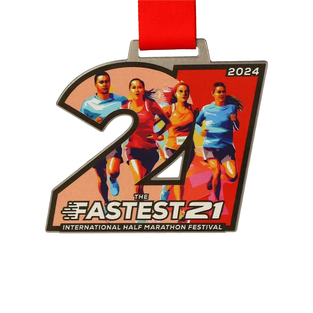 A running medal for participants of The Fastest 21. It features a group of runners in motion, symbolising the energy and pace of the run. The vivid colours were created using UV printing. This medal is an ideal choice for run organisers who want to offer participants a keepsake that reflects the emotions of the half marathon.