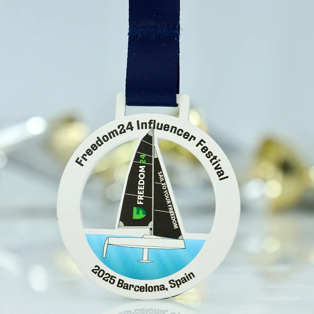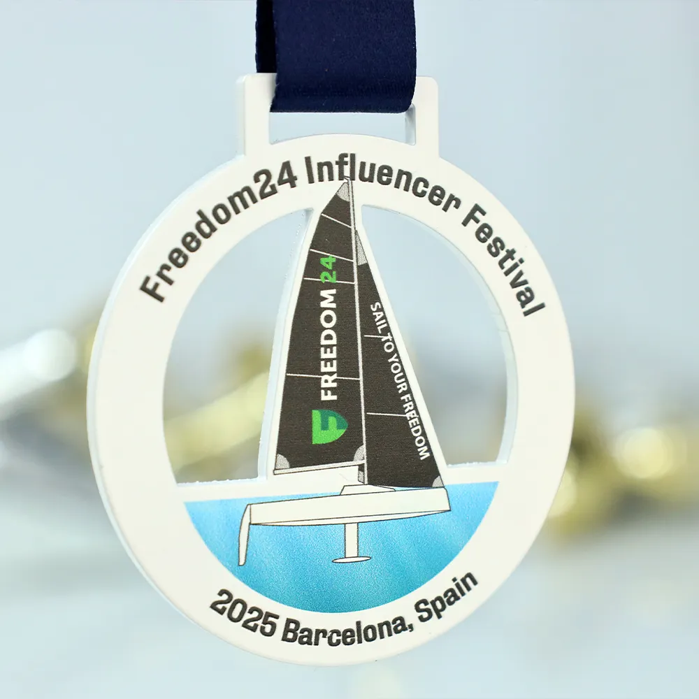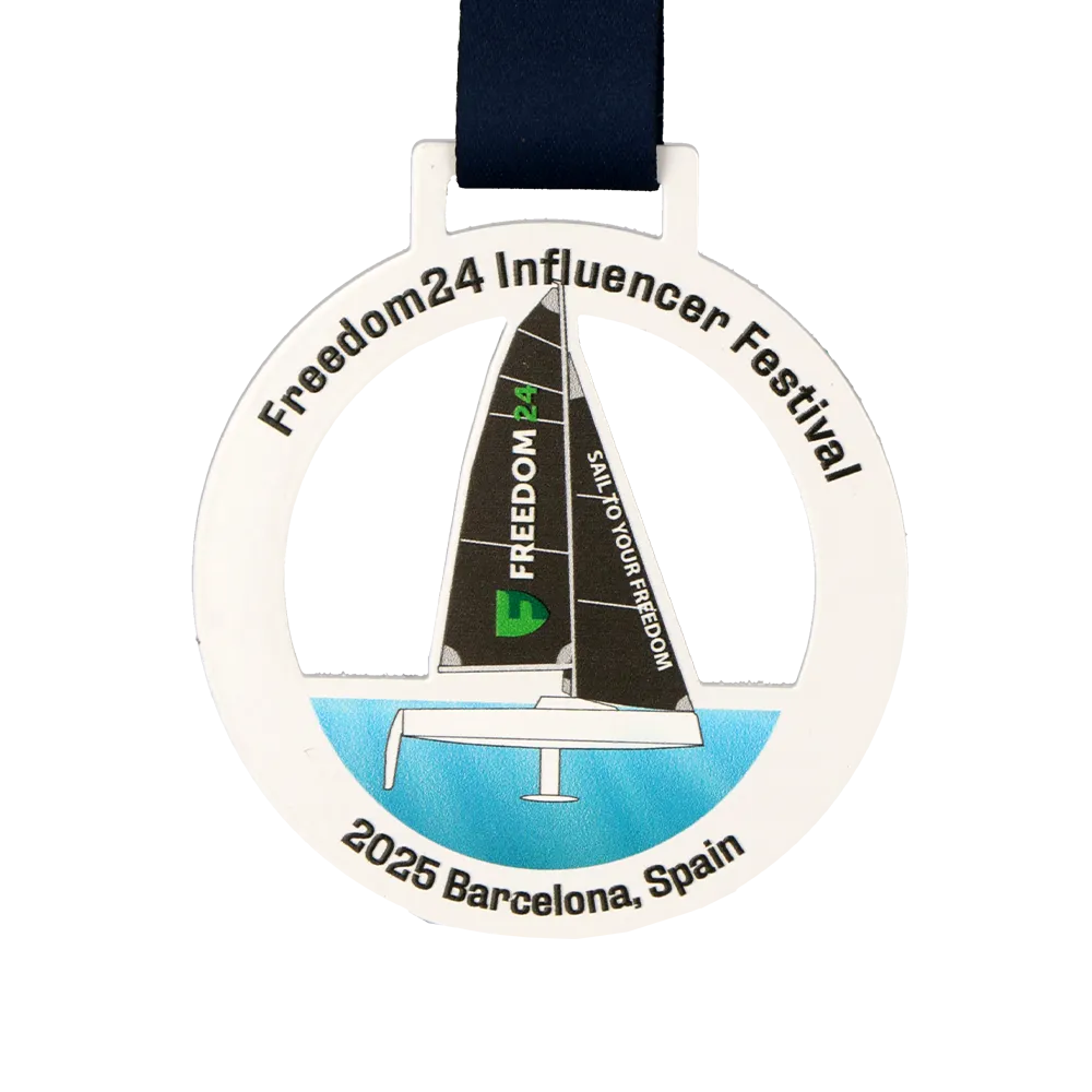 We present a modern bespoke medal prepared for The Freedom24 Influencer Festival, distinguished by its lightweight, semi-openwork construction. Durable metal forms the base for the precise graphic of a regatta yacht, with details perfectly highlighted thanks to UV printing technology. This combination of elegance and a dynamic, adventurous spirit immediately grabs attention and builds a positive brand image.