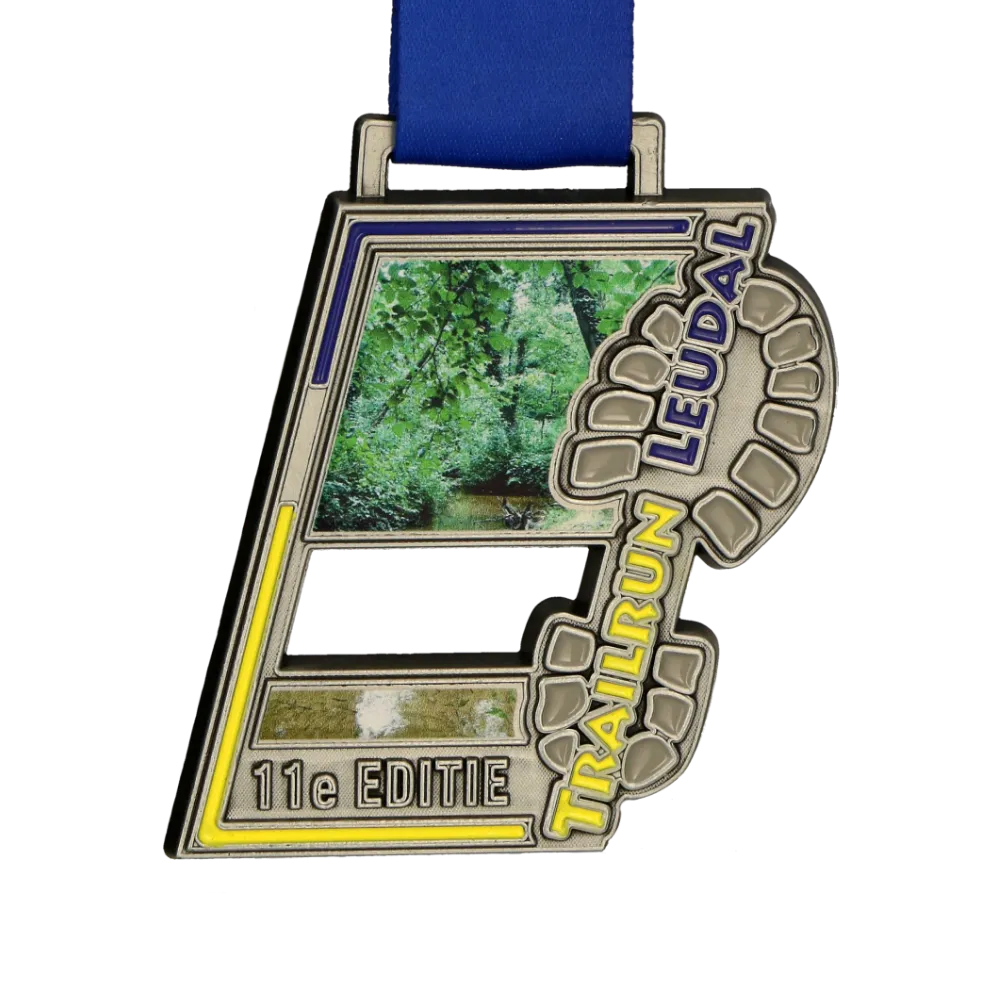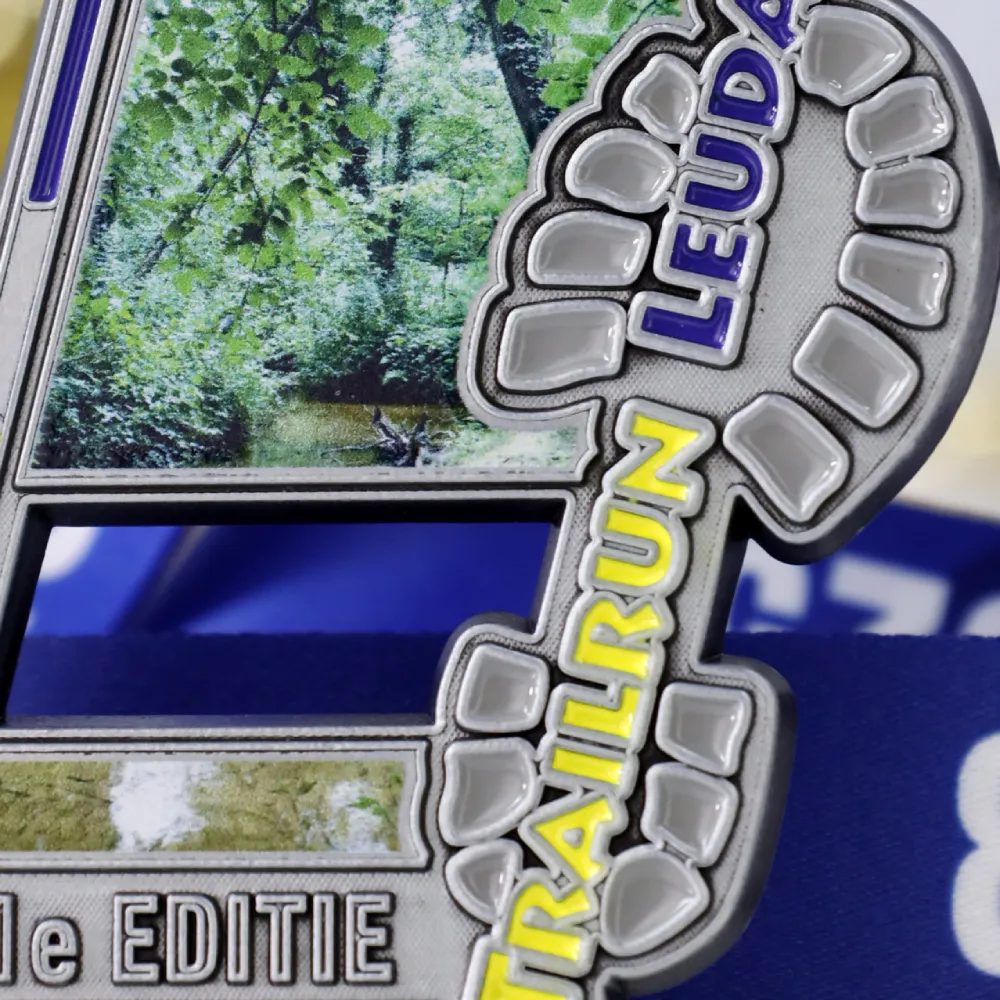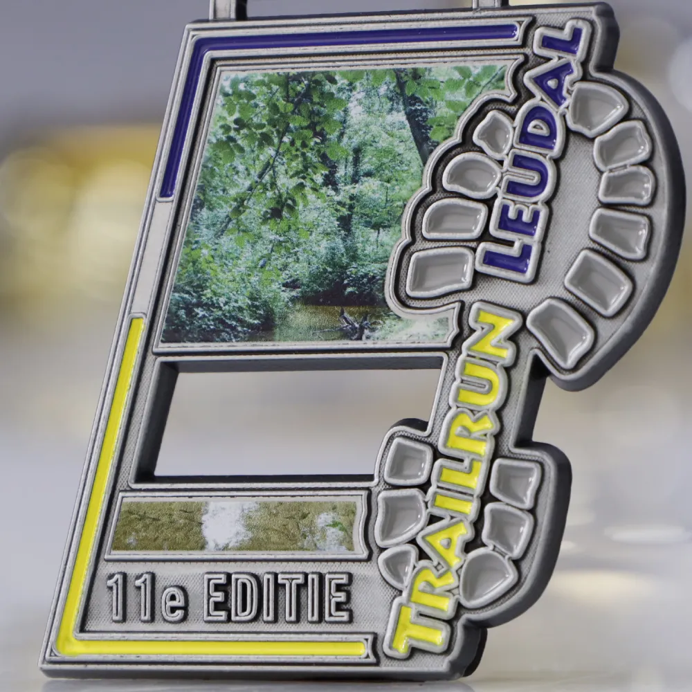 Personalised running medals for Trailrun Leudal, 11th edition. Featuring UV printing with a forest theme and a clear footprint outline. The enamel colours – yellow and blue – highlight the event name. The bespoke medal is suspended from a blue ribbon.