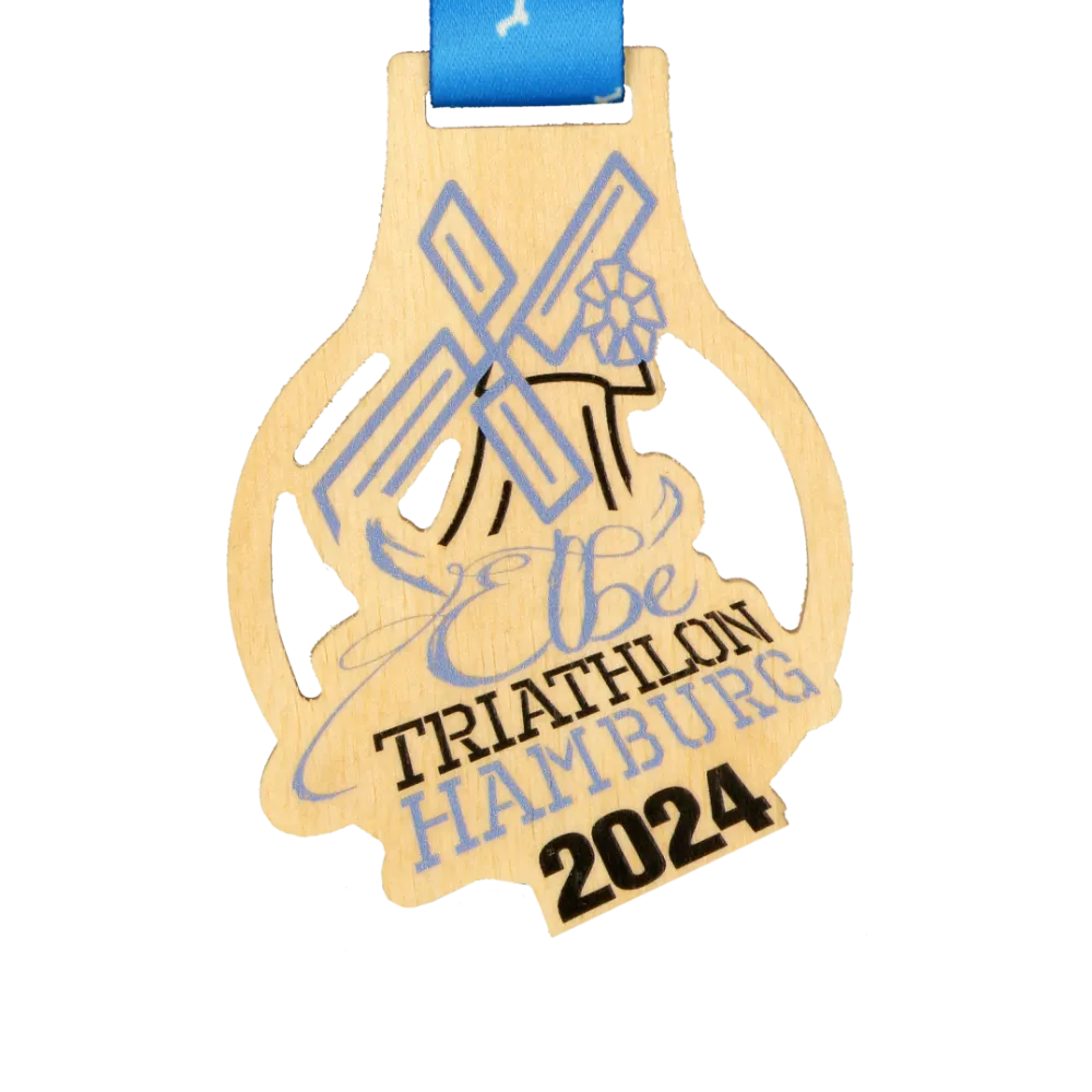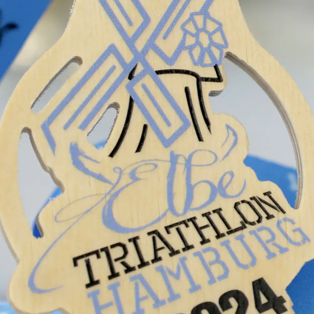 Wooden medal made of plywood, designed for Elbe Triathlon Hamburg 2024. It stands out with a unique shape and UV print depicting a watermill – a symbol of the region. The natural wood colour is complemented by blue and black graphic accents. Personalisation includes the event name, location, and year.