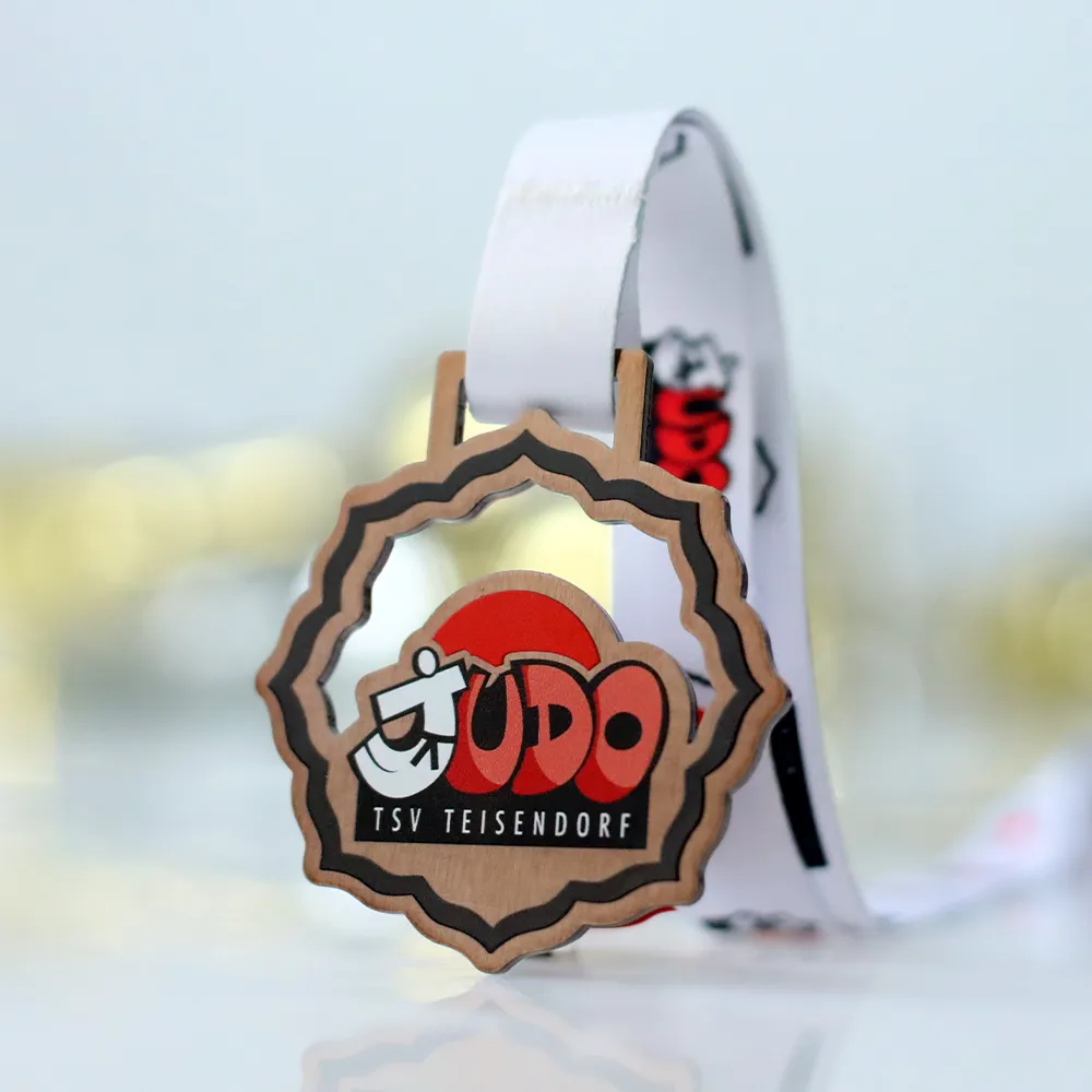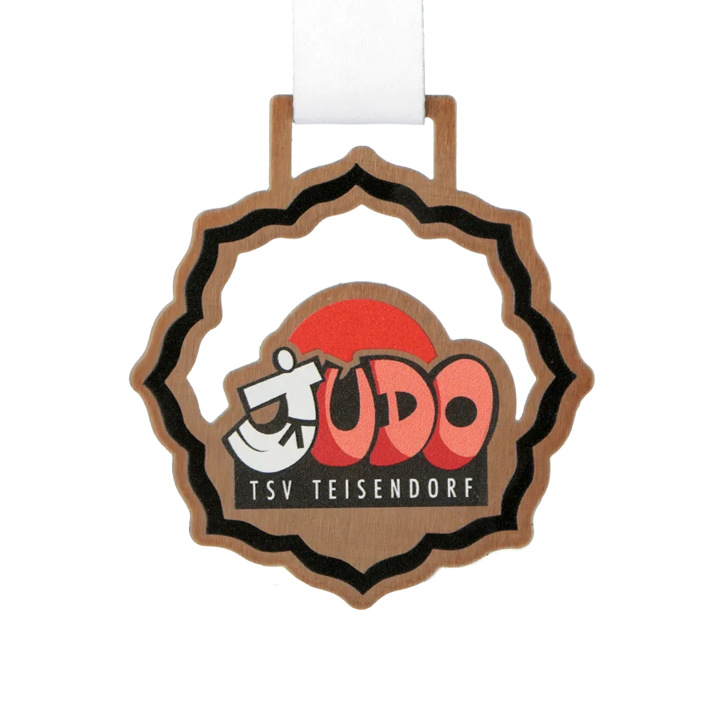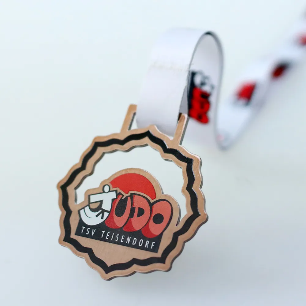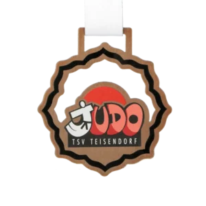 Steel medal for TSV Teisendorf Judo, laser-cut in a circular shape with a serrated edge reminiscent of a traditional rosette. The bronze brushed metal finish creates a warm backdrop for the UV-printed club logo. The word JUDO appears in red and orange three-dimensional lettering with a white judoka silhouette woven into the letter J. Below, the inscription TSV TEISENDORF sits on a black bar.