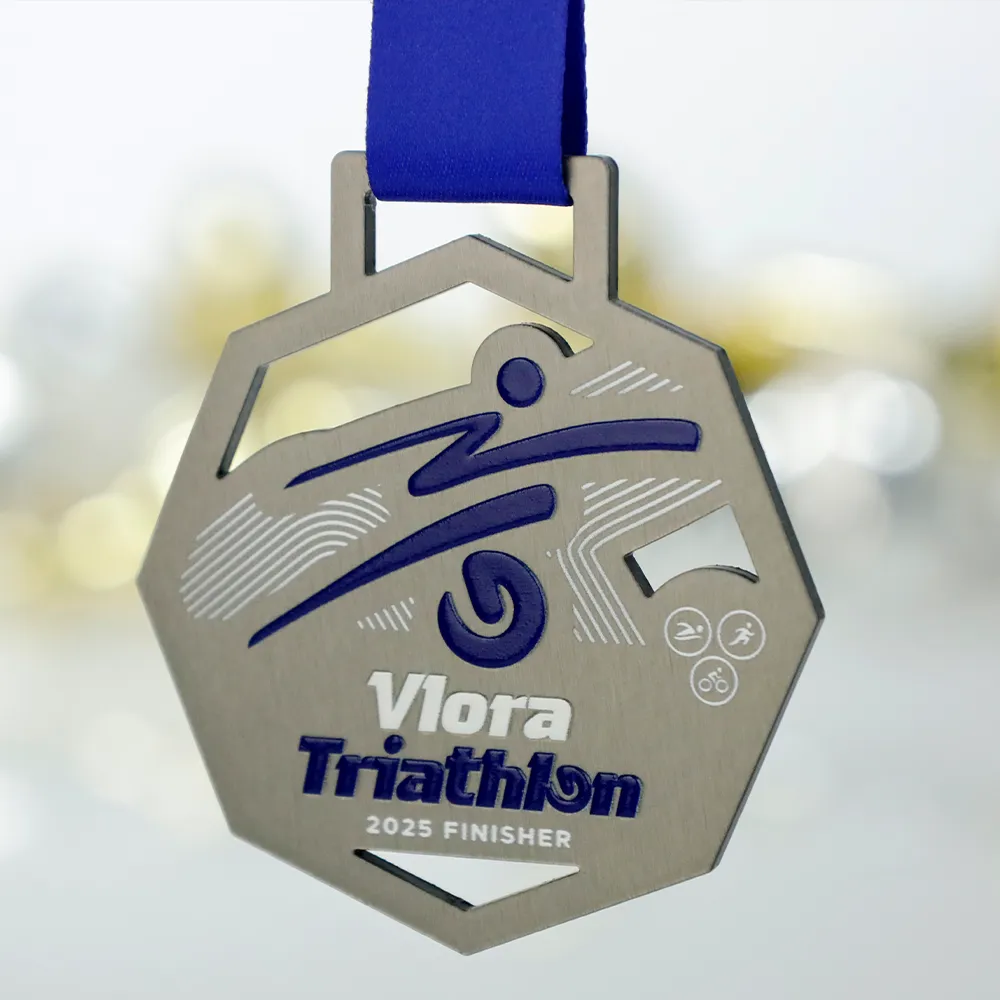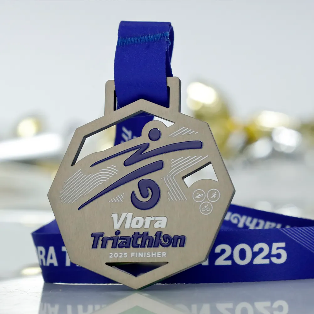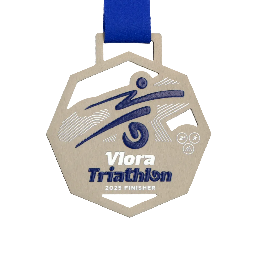 Steel medal prepared for the Vlora Triathlon 2025. The shape was laser cut, with additional cut-outs in the centre. Inscriptions and decorations were applied using UV printing in navy blue and white. The dynamic design highlights the sporting character of the event for which this bespoke medal was created.