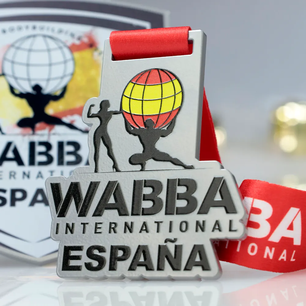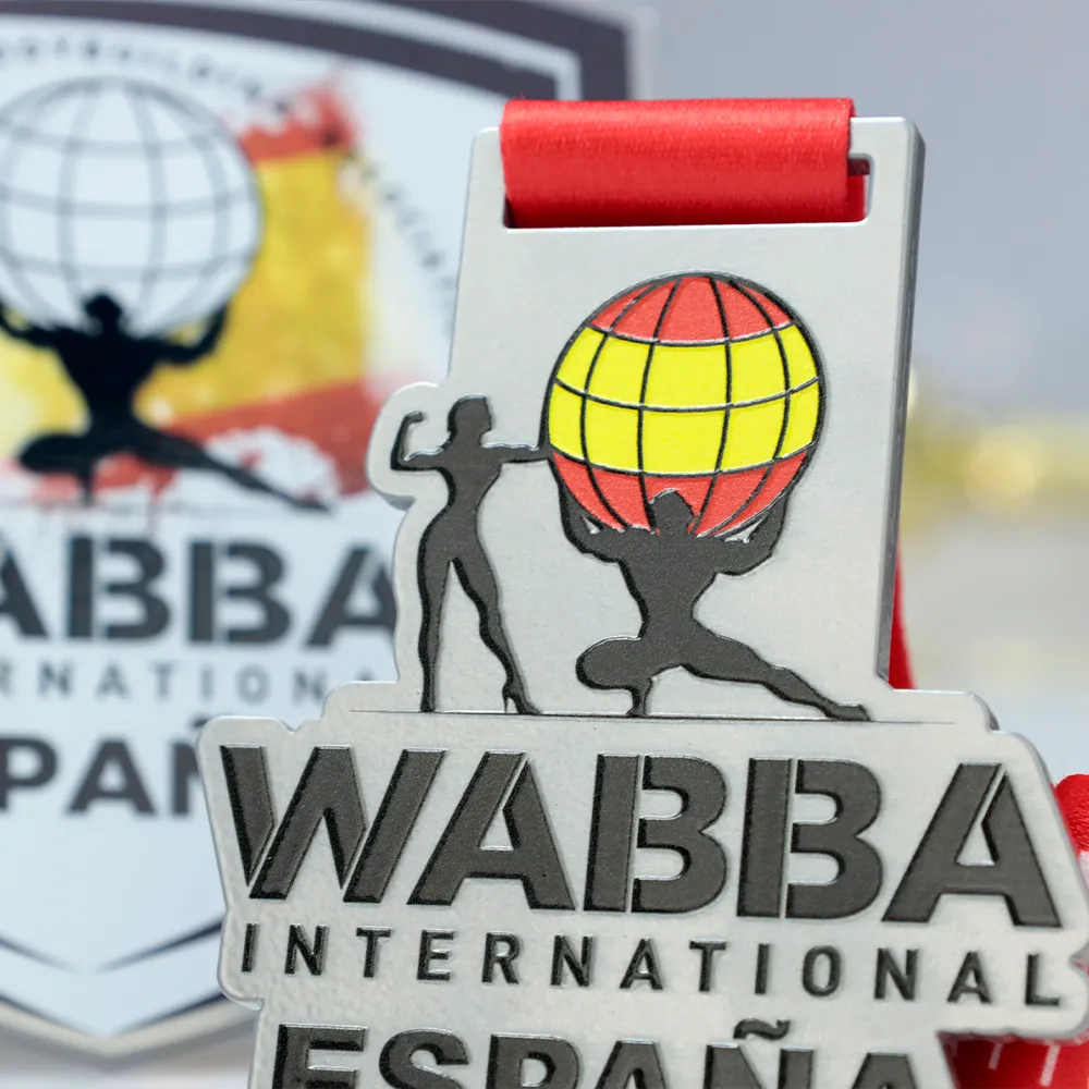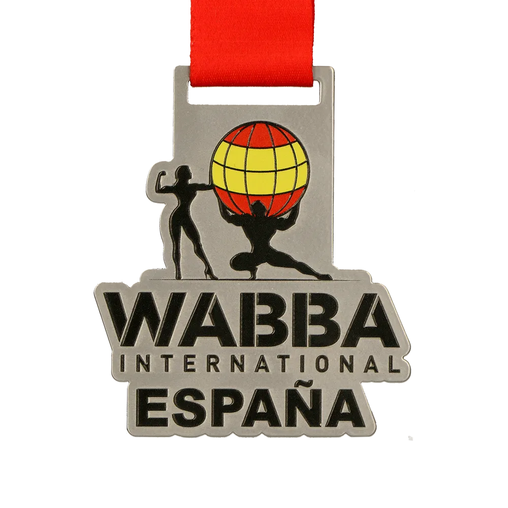A personalised medal with a unique shape, created for the WABBA International España event. The medal features silhouettes of bodybuilders and a globe in the colours of the Spanish flag, symbolising strength and unity. The organisation and country names take centre stage. It is suspended on a red ribbon that complements the colours of the design.