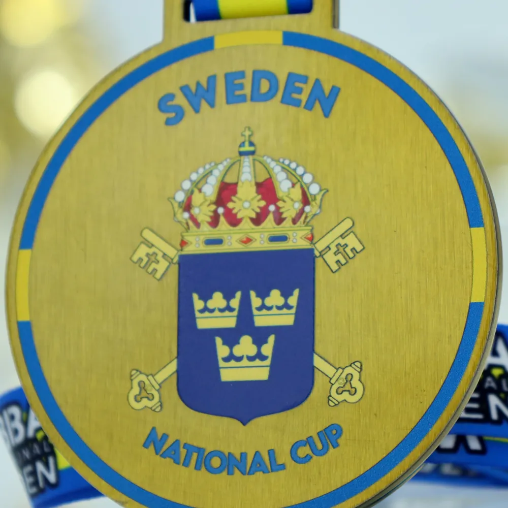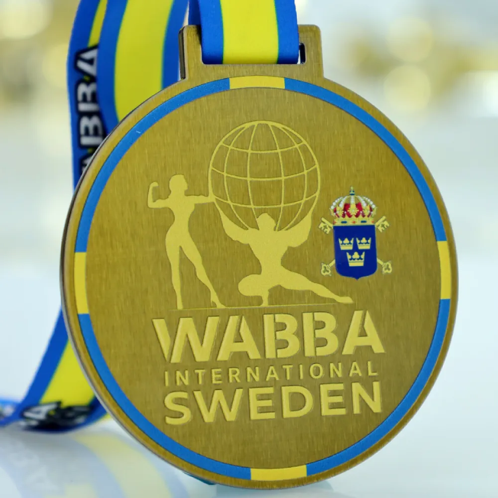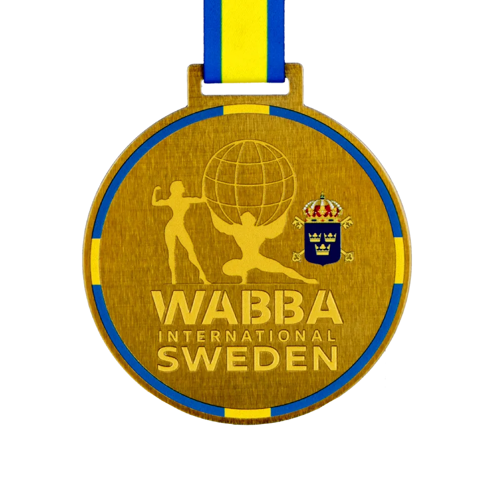 A gold personalised medal designed for the WABBA International Sweden competition. Made of steel, finished in a classic gold colour, and decorated with UV print. The design shows bodybuilding figures and a prominent globe, accompanied by the coat of arms of Sweden. The medal comes with a dedicated ribbon in national colours.