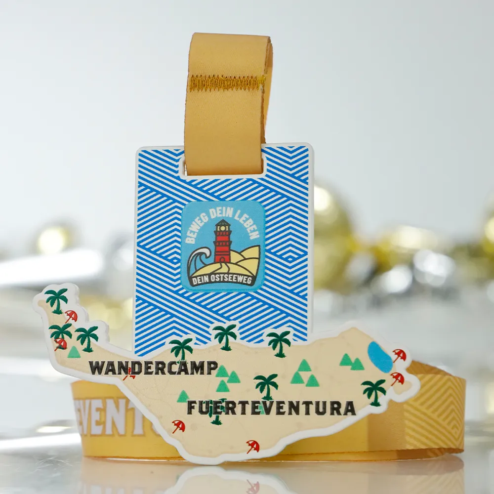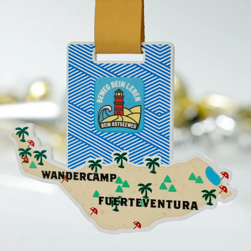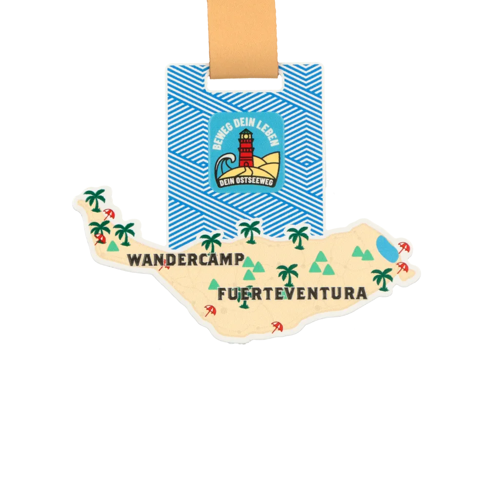 Steel medal designed for the Wandercamp Fuerteventura event. The medal shape was laser cut from a metal panel in the form of the island’s map. Decorations were applied using UV printing in sand, green, red, and blue colours. The obverse shows the event name, landscape symbols, and the "Beweg dein Leben" initiative logo. The medal is suspended on a beige ribbon.