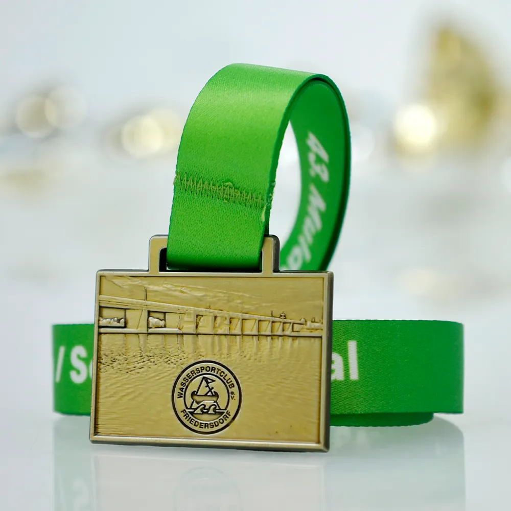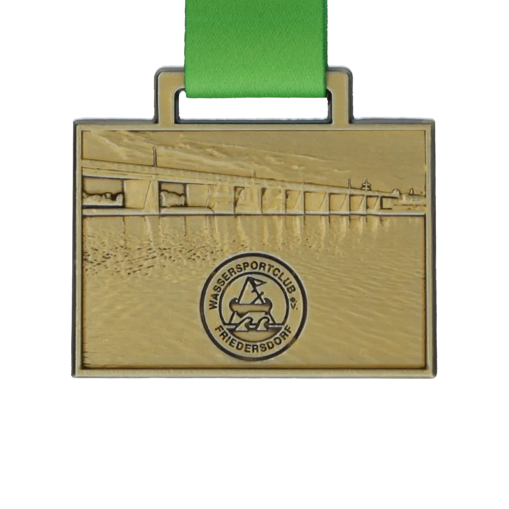 This cast medal was produced for the 43rd Muldestauseeregatta Schülerpokal. Rectangular in shape and finished in gold, it features a detailed relief of a bridge on the obverse. The lower section displays the Wassersportclub Friedersdorf logo. Designed for a sailing event, this type of custom medal is ideal for regattas.