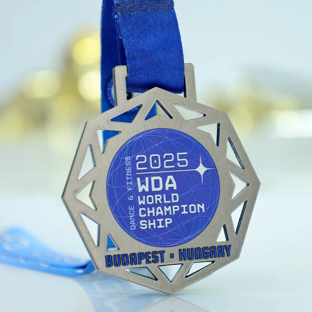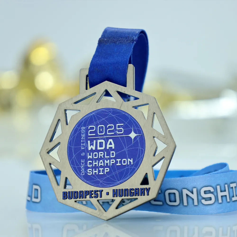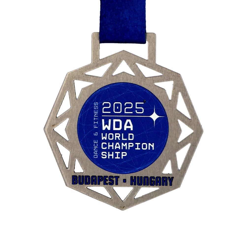 Bespoke medal designed for the WDA World Championship 2025 in Budapest. It is a metal medal with an original geometric shape crafted using laser cutting. The front features a blue graphic with the event’s name, year, and location. All decorations and inscriptions are achieved through durable UV printing.