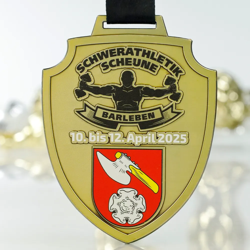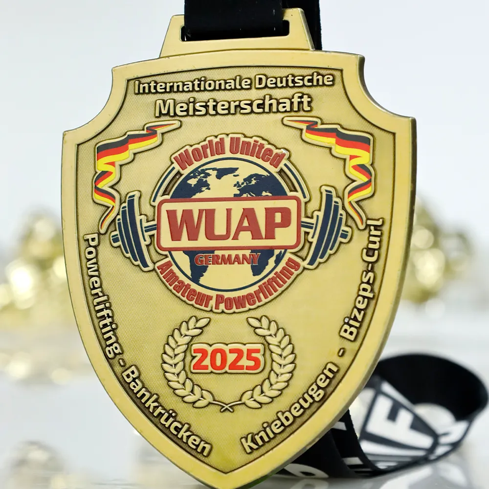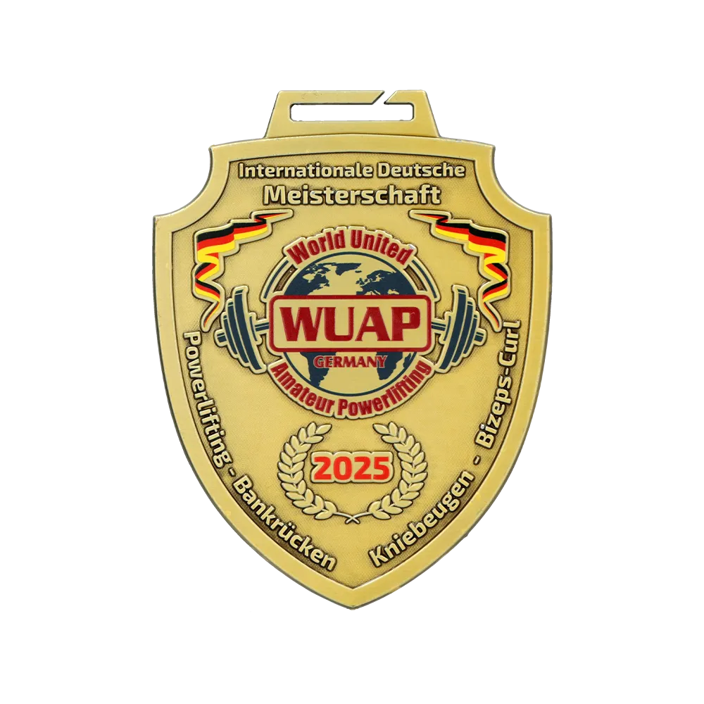 Cast medal prepared for the Internationale Deutsche Meisterschaft WUAP Germany 2025. The shape was cast from a mould in the form of a shield. Decorations and graphic elements were made with coloured enamel in shades of red, yellow, and navy. The medal is intended for participants of powerlifting competitions.