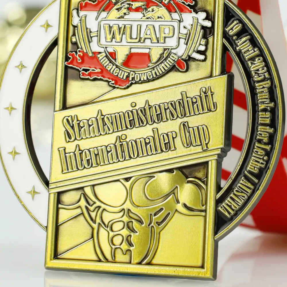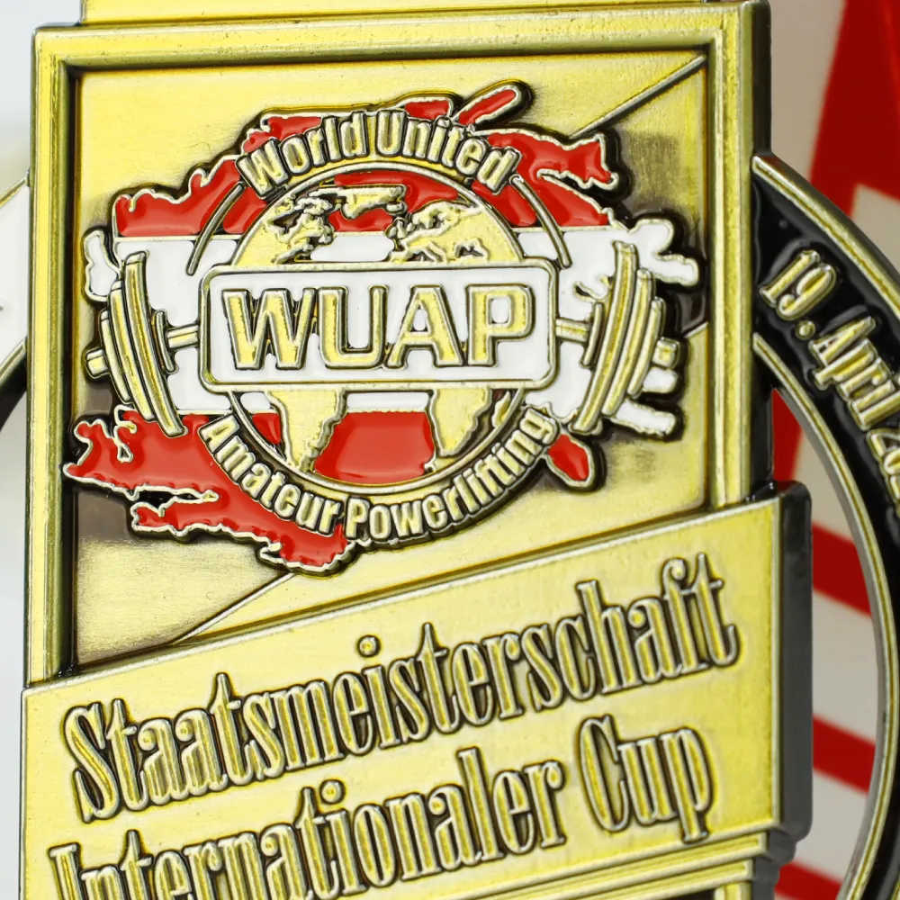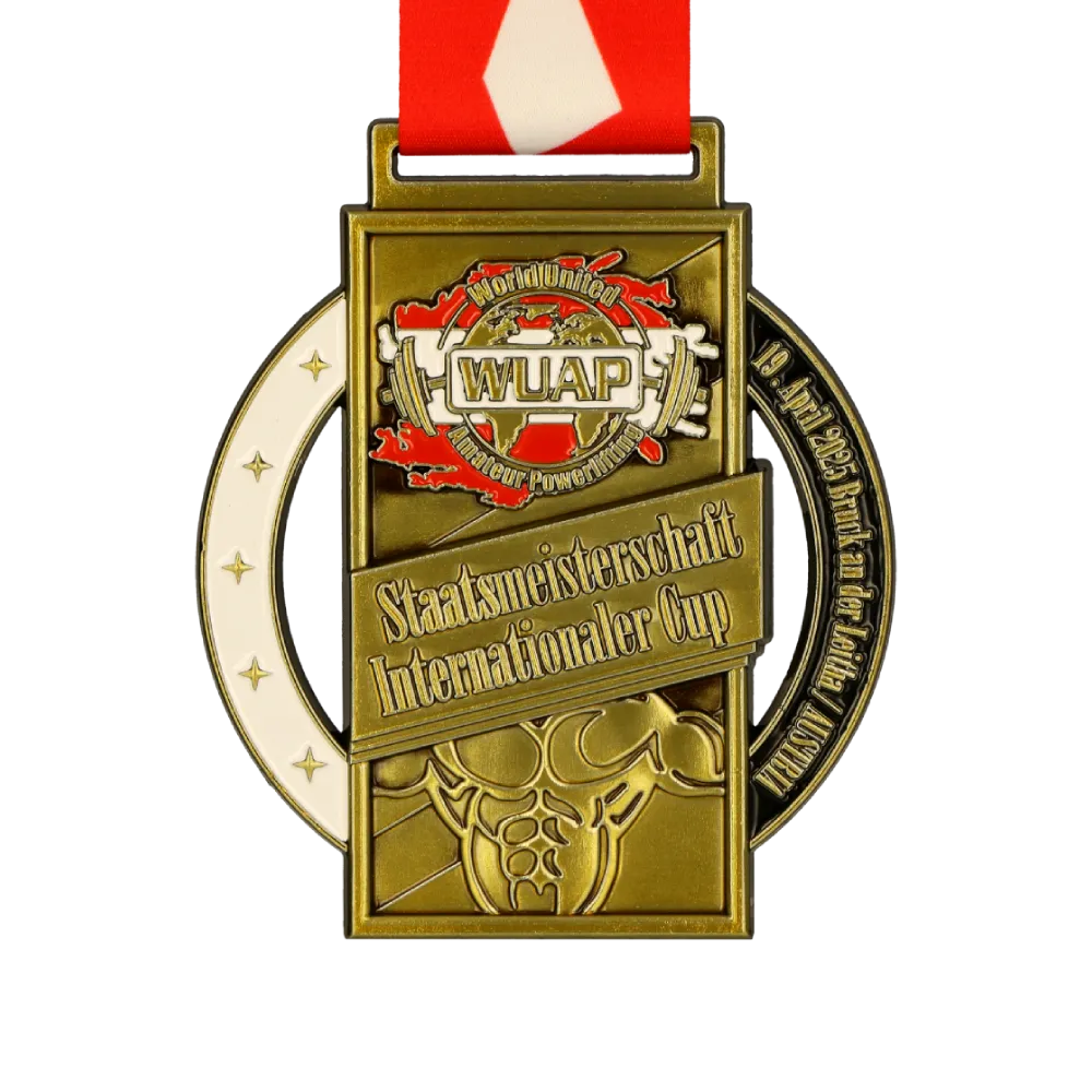Custom gold medals created for WUAP Staatsmeisterschaft Internationaler Cup. A bespoke cast medal designed for a powerlifting event, featuring an enamelled WUAP logo in red and white, symbolising the organisation’s international reach. The bespoke medal showcases the event’s name and a graphic depicting a muscular chest, highlighting strength and athletic spirit.