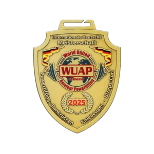 The colours perfectly refer to the colouration associated with the competition and the golden rims between the colours add to it attractiveness. Weightlifting is related to great strength and this, in turn, with a perfectly ripped body. At many competitions, the strongest athletes receive commemorative medals, which are usually hung around their necks. Therefore, the medal must stand out in size in order to look good against the background of sculpted, large muscles. For this reason, we have prepared cast medals of non-standard size for the WUAP World Championship. What’s more, the medals have an original, irregular shape with numerous decorations. Importantly, all these elements refer to the name and the theme of the event. On the surface of the medal you can see the German flag, a barbell and a graphic world. These decorations are filled with enamel in 6 colours. The whole is complemented by a personalized ribbon matching the design.
