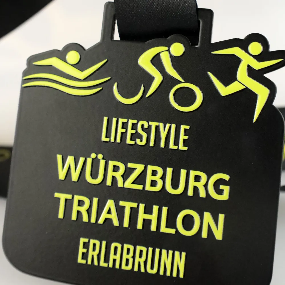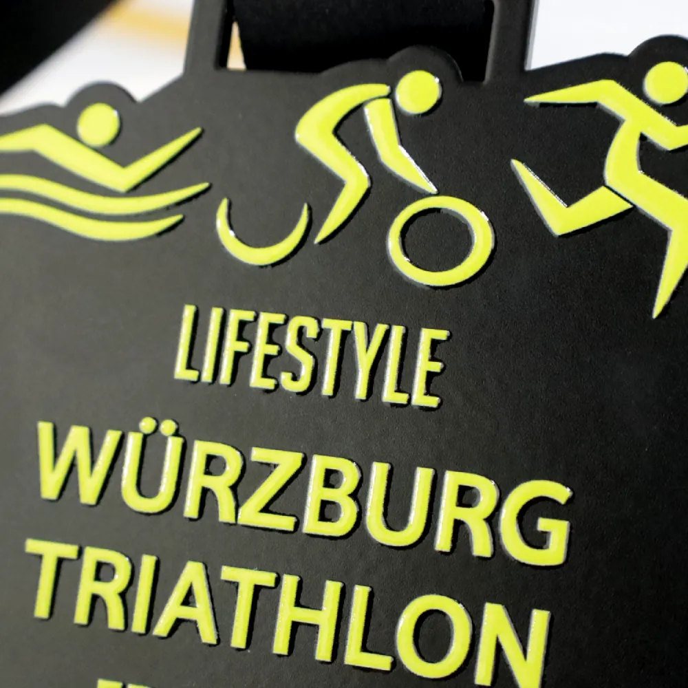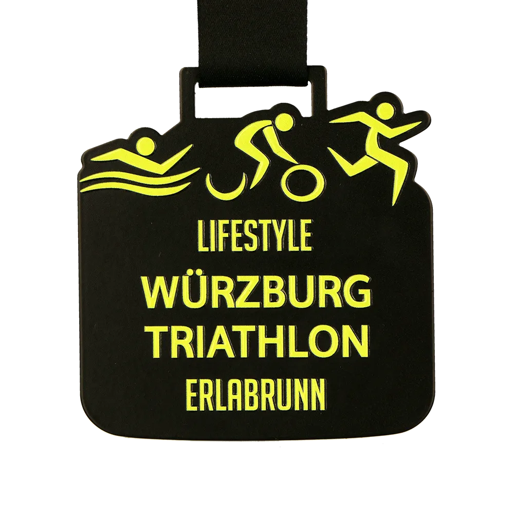 A triathlon medal for participants of Lifestyle Würzburg Triathlon Erlabrunn. The medal features three icons symbolising swimming, cycling, and running, reflecting the disciplines of the triathlon. An ideal choice for triathlon organisers.