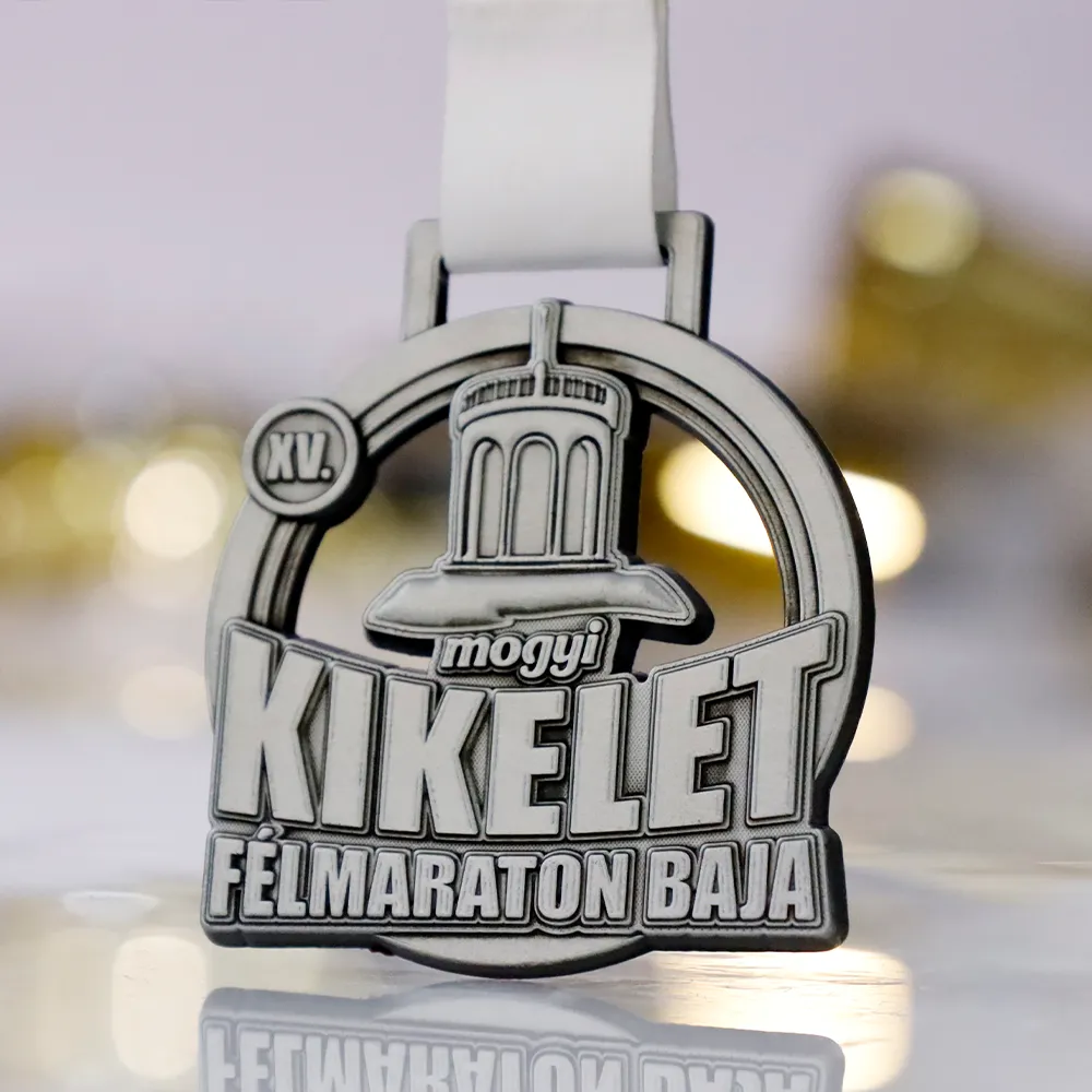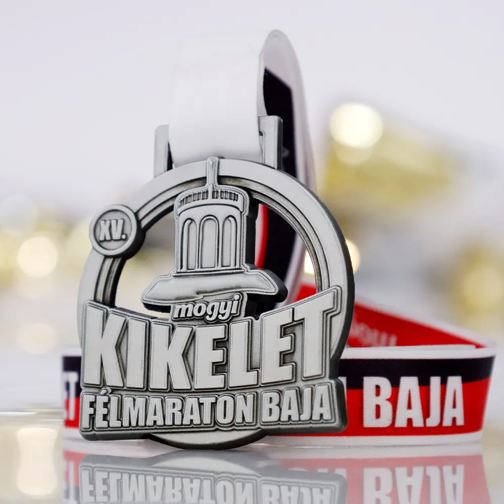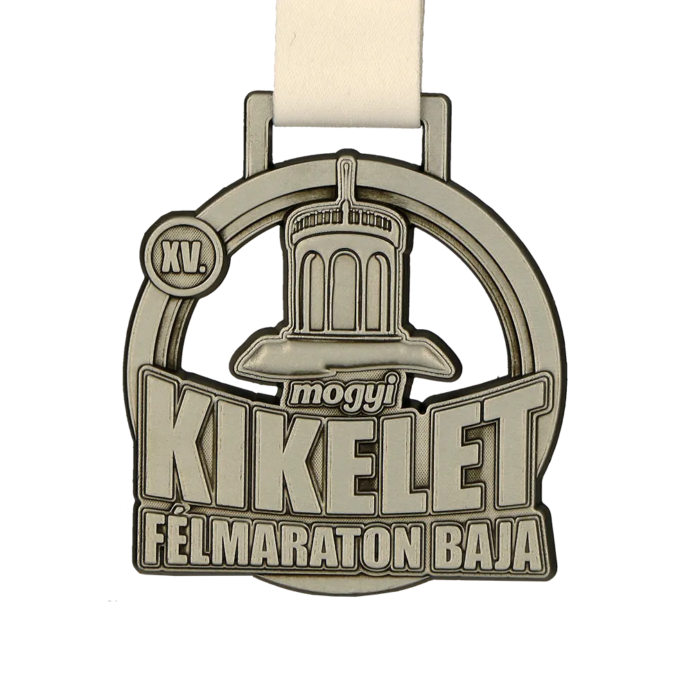 Bespoke medal created for the XV. Kikelet Half Marathon Baja. It is a 2D cast medal. It features a distinctive building at the centre of the composition and a prominent inscription with the event's name. The medal is hung on a light-coloured ribbon, matched to the overall design.
